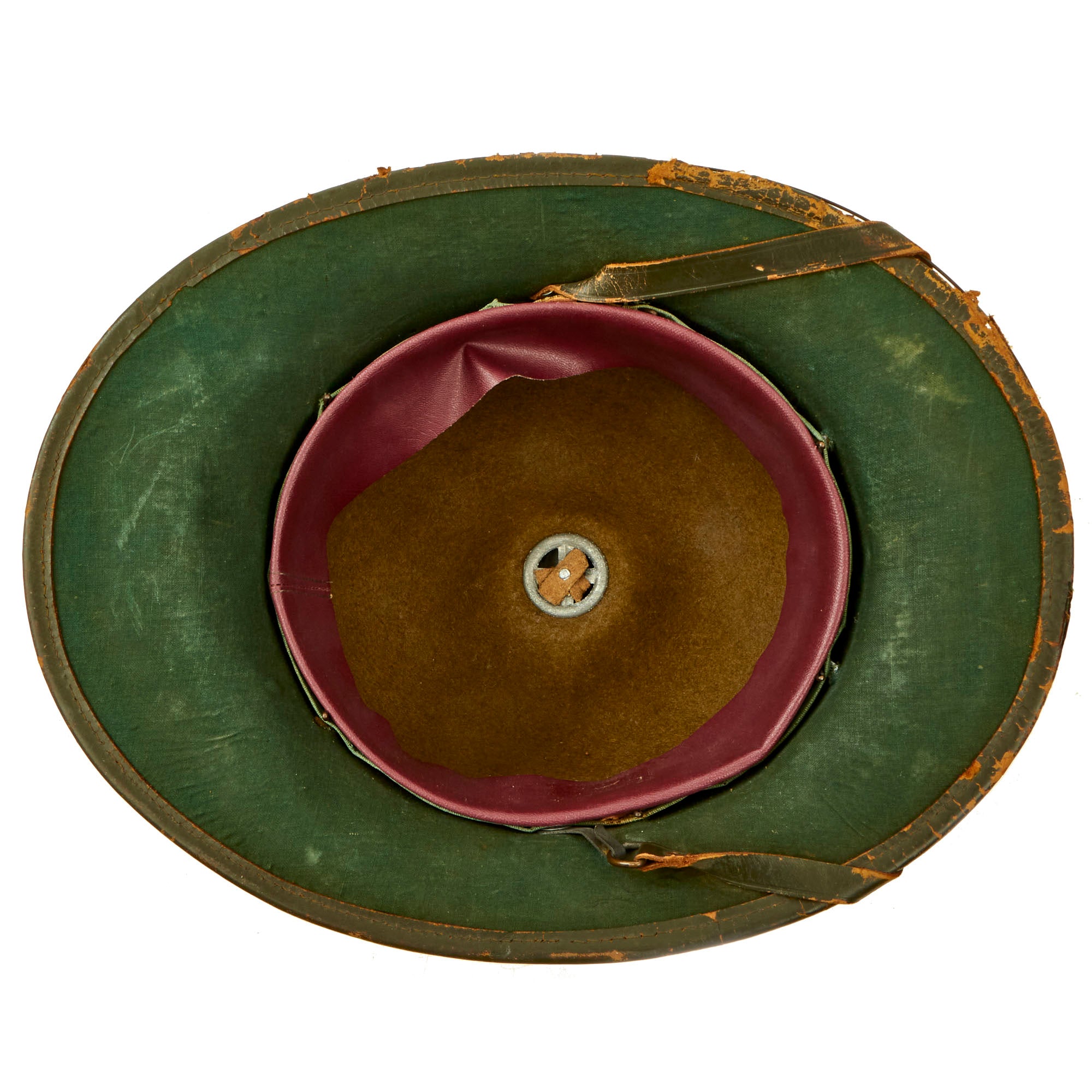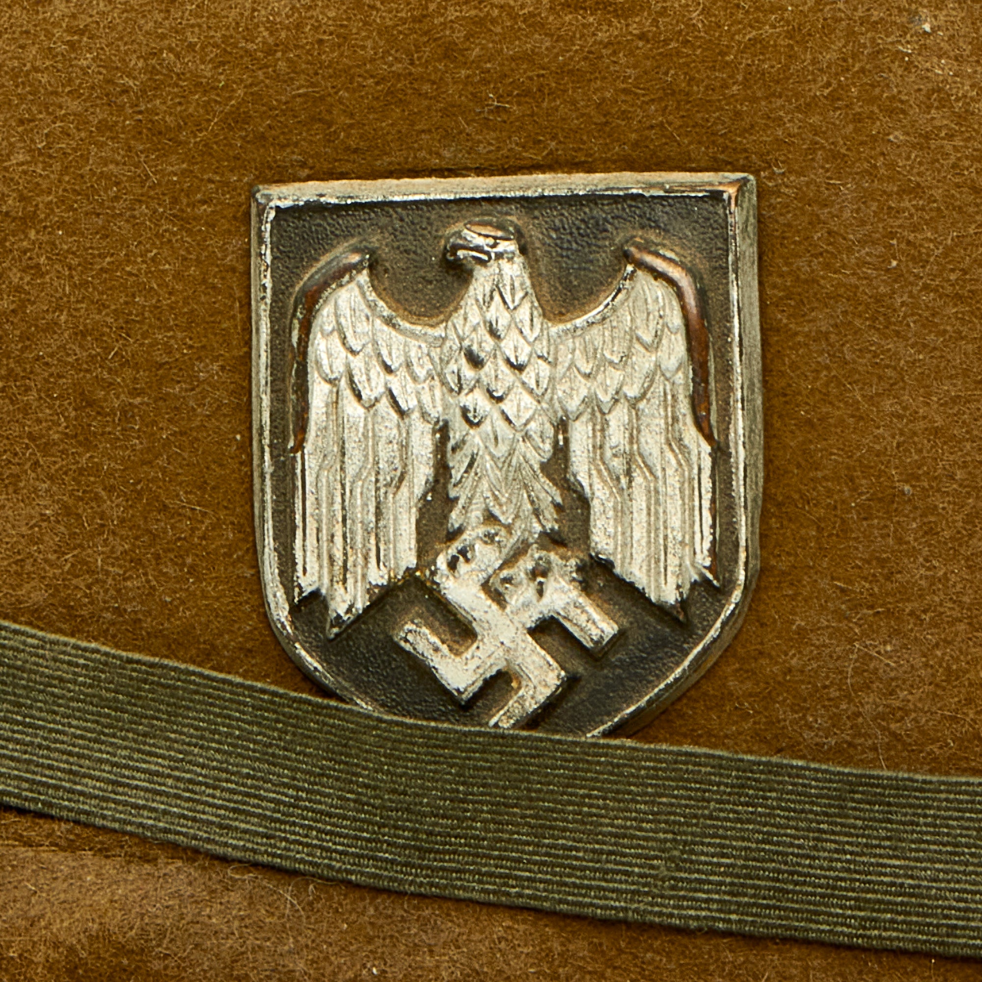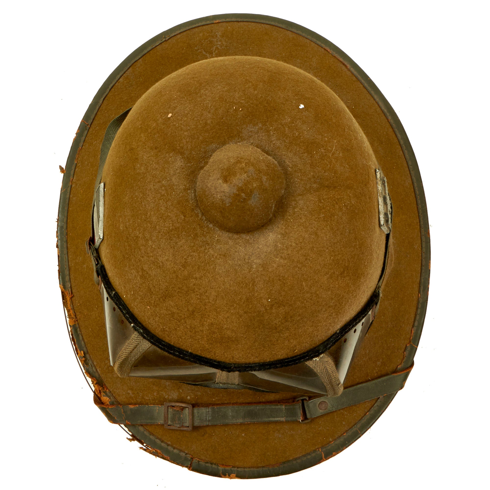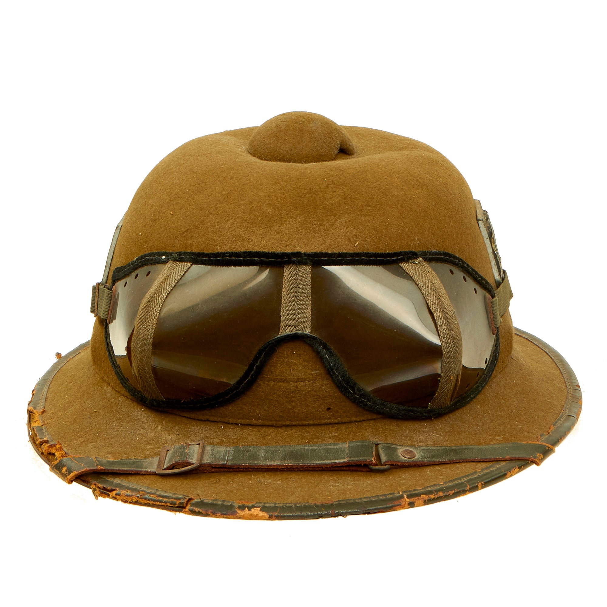 Original Item: On first deployment to North Africa in 1941, Afrikakorps infantry were issued with the traditional European sun helmet known as Tropische Kopfbedeckung (Tropical headgear), of the type known to the British forces as the solar topi (or topee). In the German case, these were made of pith, had prominent ventilation holes in the crown, were khaki in color and bore two metal shields; on the right the national colors and on the left the German eagle. There were several models made, with the first having cotton outer covering made of fabric sewn together. This is the second model, with a felt covering.