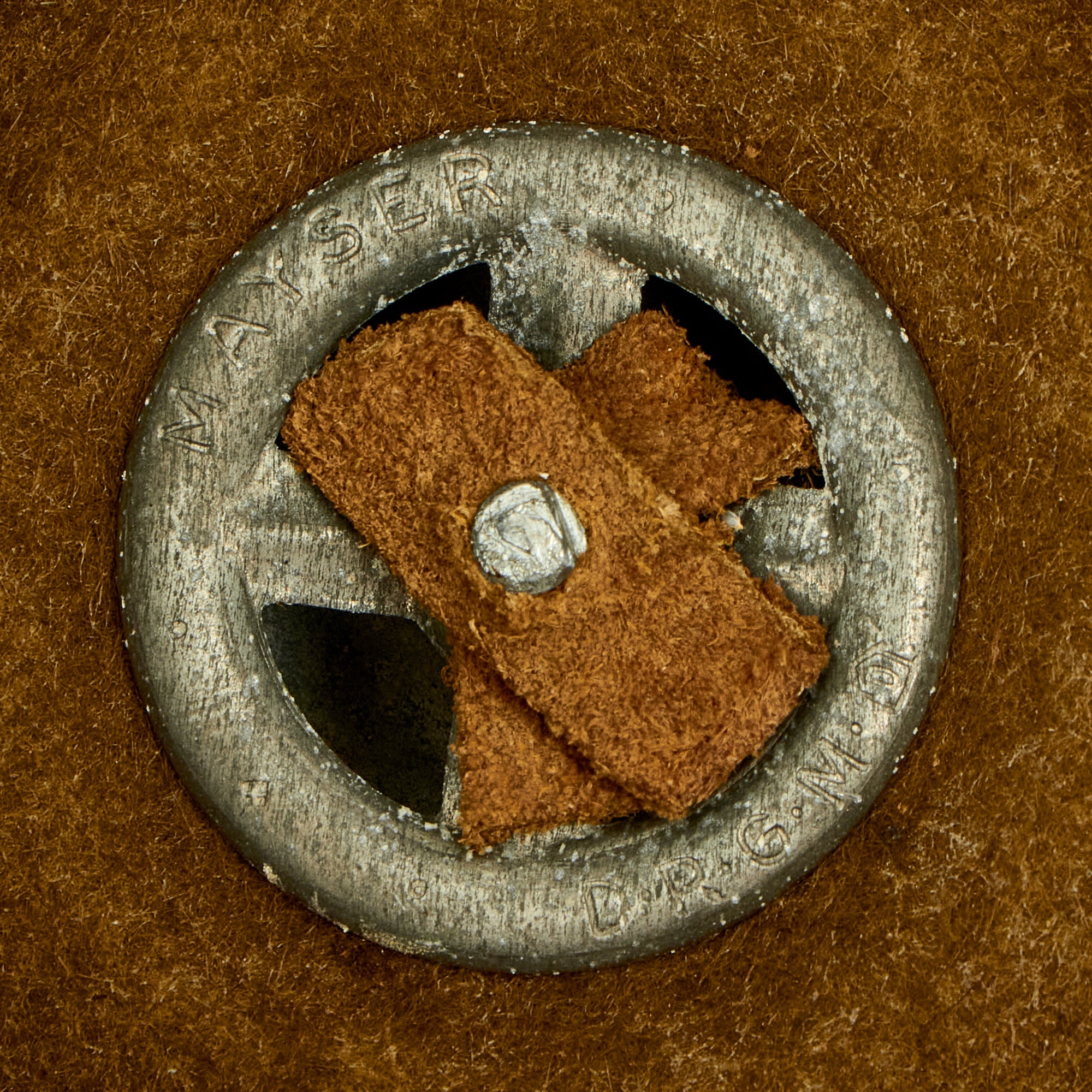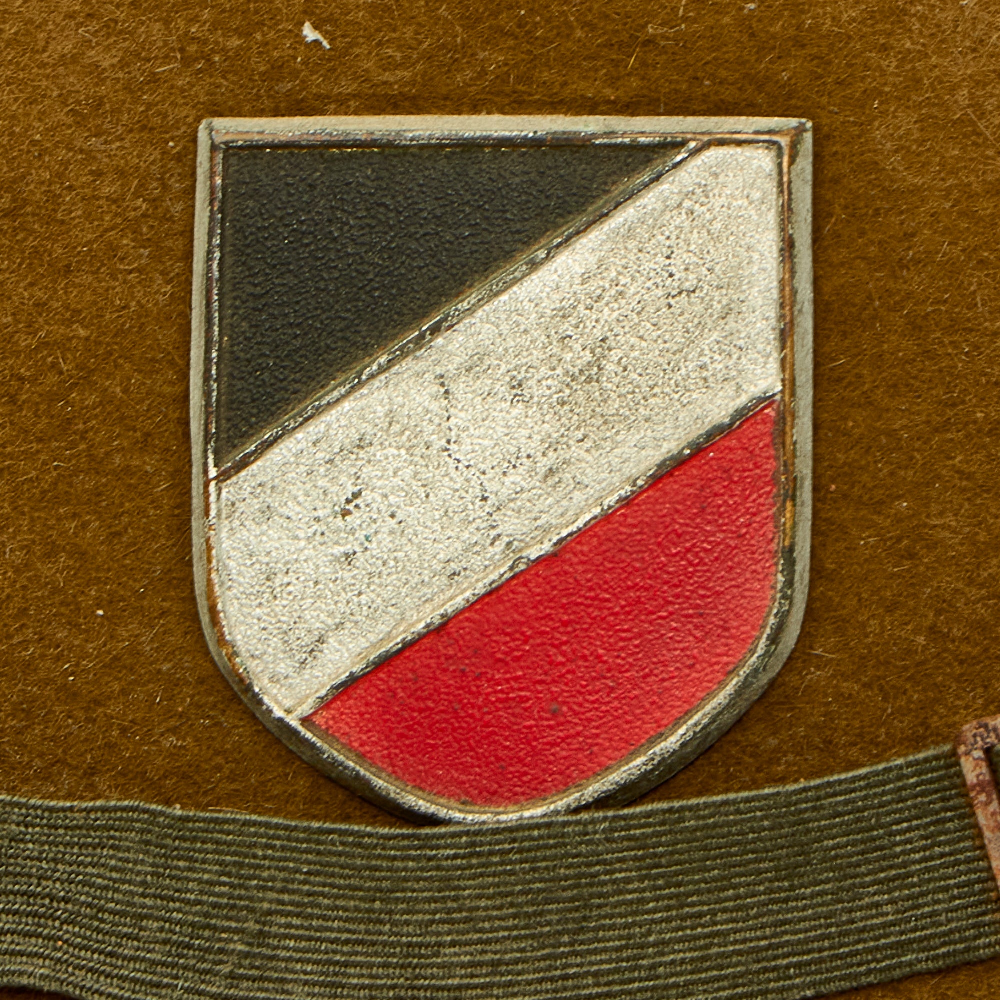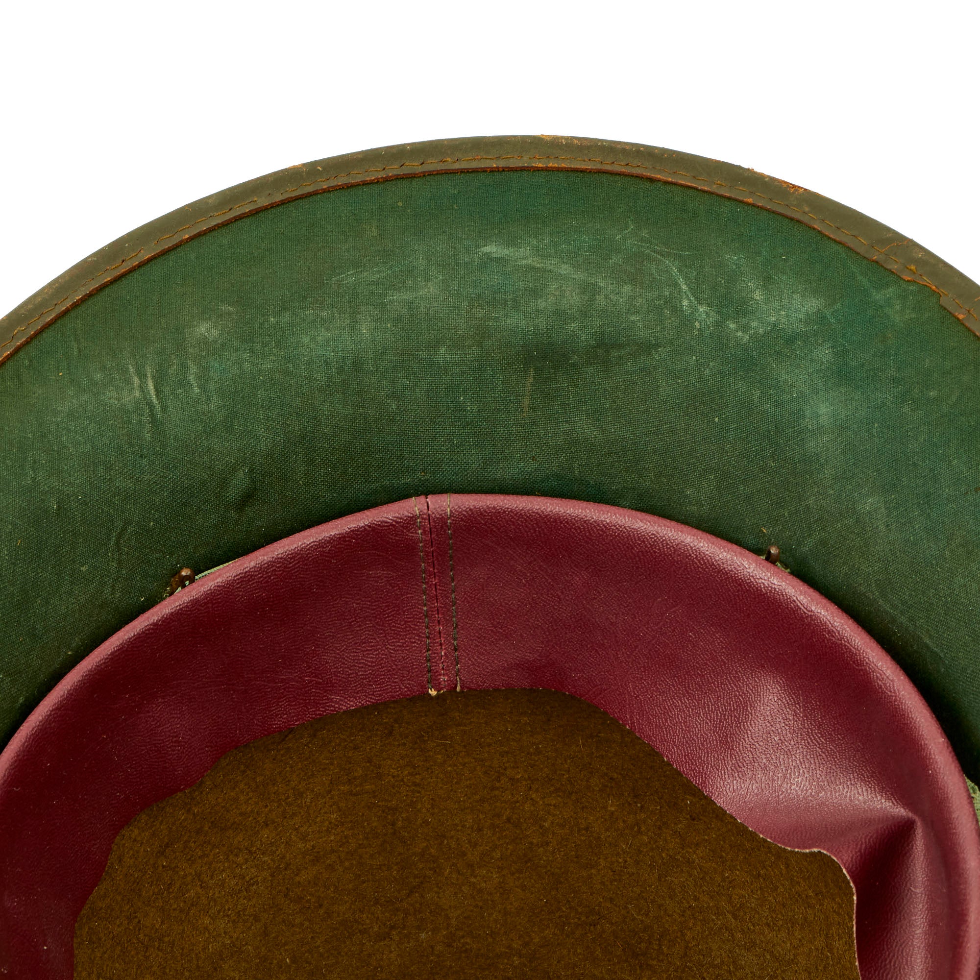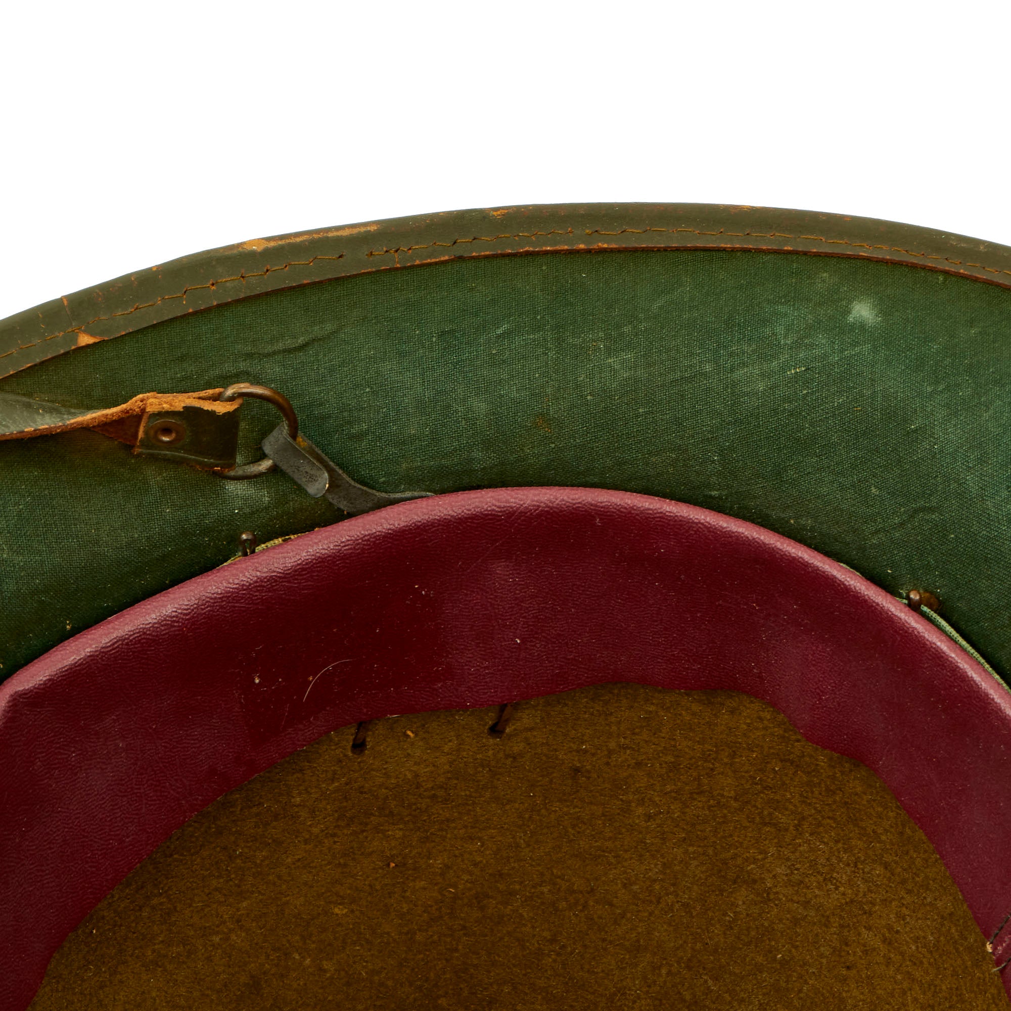 This particular example is in very good service used condition, with all parts present and mostly intact, showing some period wear at expected. The original olive/khaki felt covering is completely intact, though it definitely has faded a bit from the original green color. The helmet band, which hides the attachment rivets for the chin strap and liner, is in very good condition as well. The original chin strap is fully intact and supple, though it does some some wear to the finish, especially on the edges and wear it goes over the helmet's brim. The green leather around the bottom is torn through about 25% of the circumference due to wear, which has allowed the metal support band to protrude in areas. The two brass badges are intact and retain most of their original aluminized paint.
