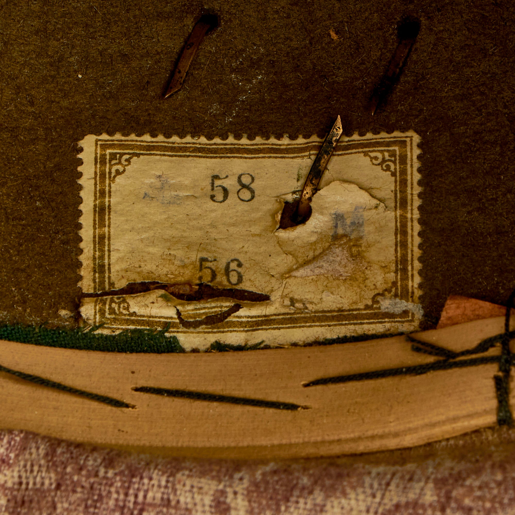 The interior of the helmet still has the original green felt covering intact, with just a bit of fading. The liner itself has had the leather portion replaced, and the rest reworked, probably part of a 60s or 70s restoration, most likely for costume or theatrical use. There is a tag on the inside indicating a size of 56 - 58 from this restoration.