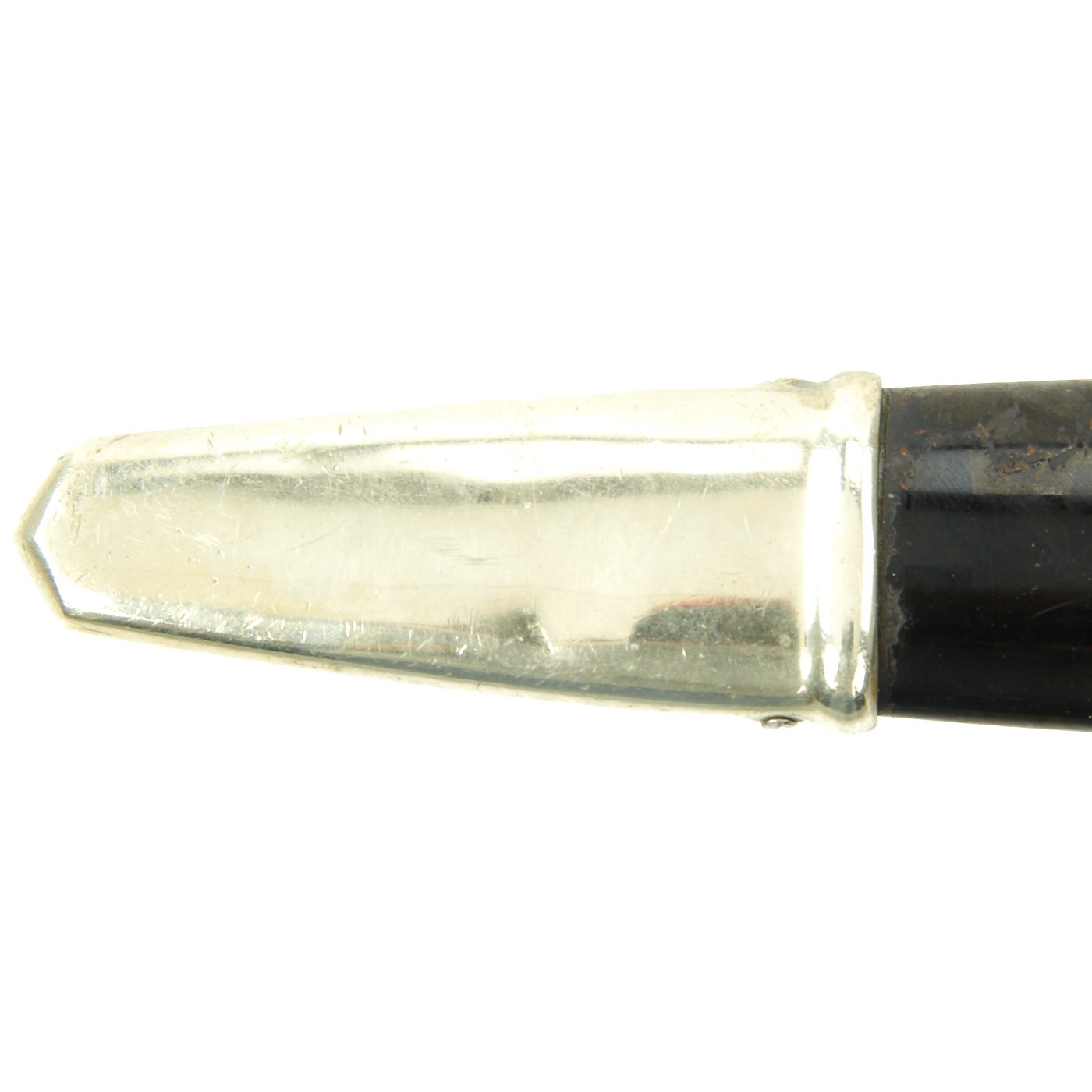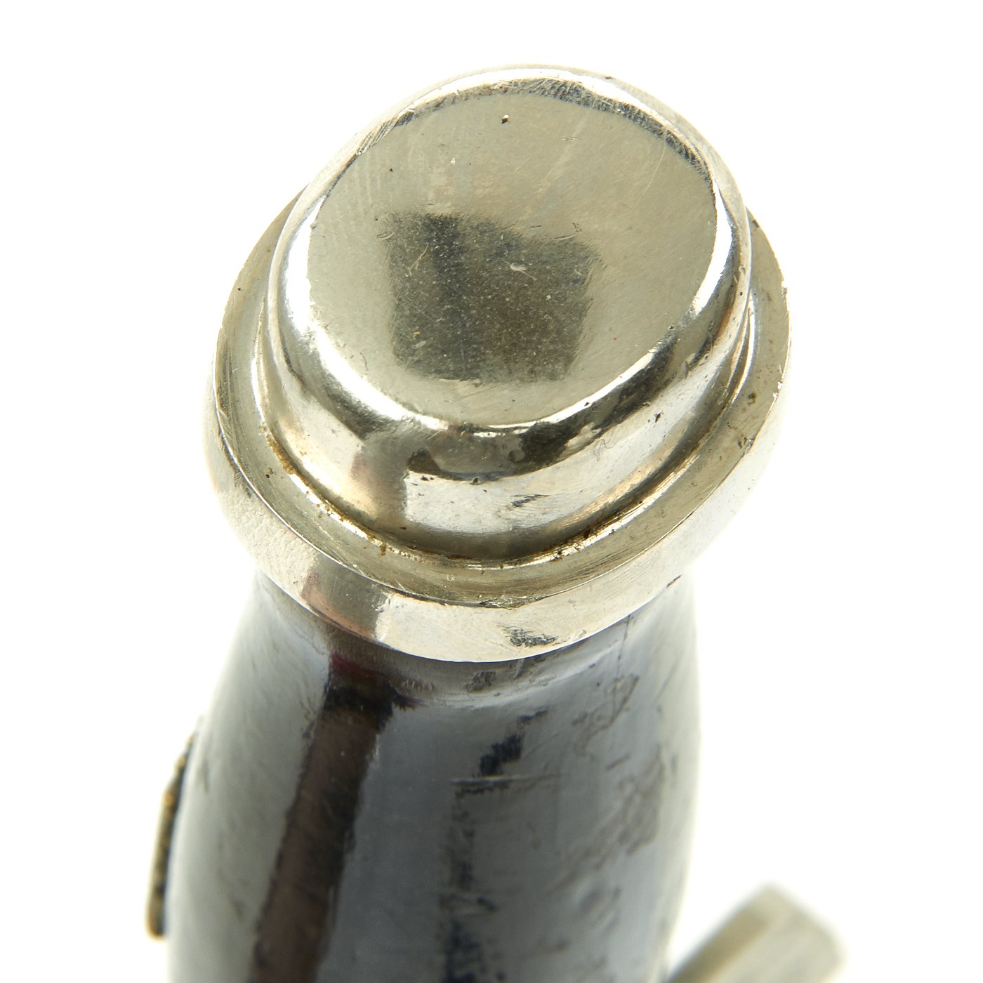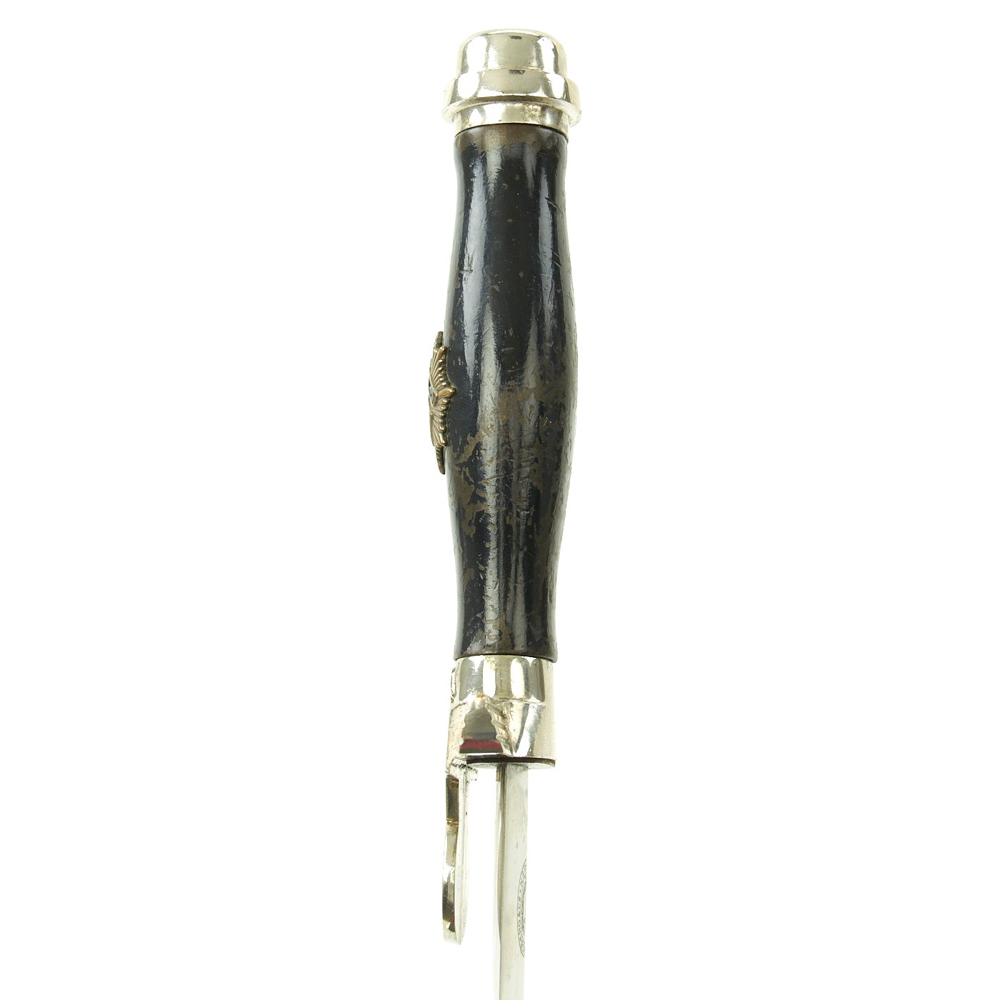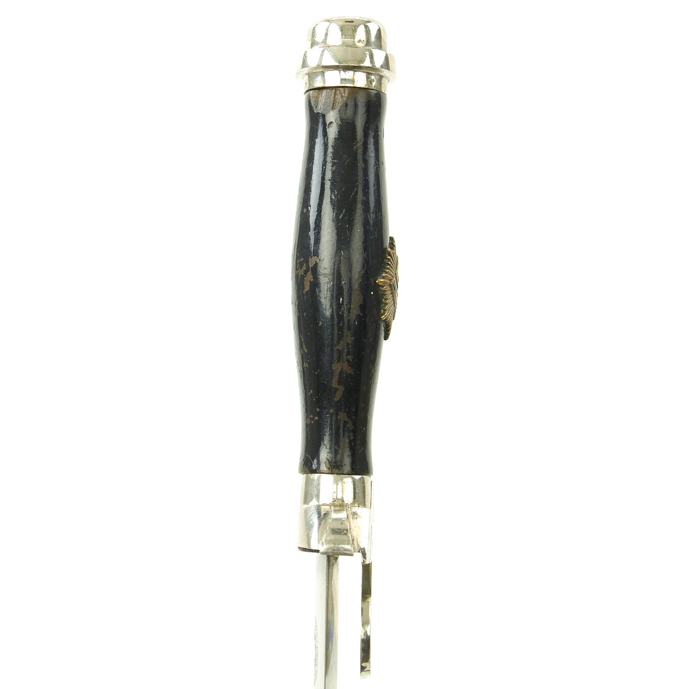 The grip is a fine ebony example. It retains much of the original sheen finish and is in excellent condition. The insignia is the style with a background sunburst. Some of the silvering has worn from the surfaces, revealing the copper base metal beneath. The enamel swas has a couple of hits here and there but we don't see any metal showing so the enamel remains intact.
