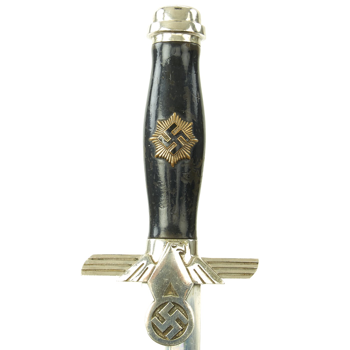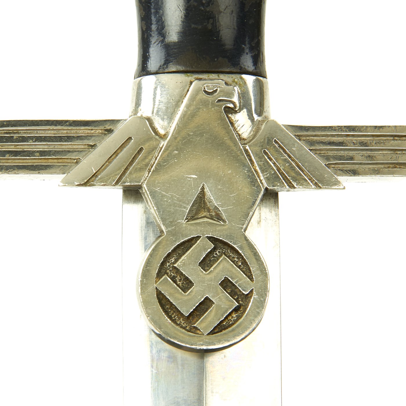 The pommel is in the characteristic derby shape with an equatorial band. The crossguard features a stubby-winged Art Deco-style eagle clutching a smooth wreath and swas. The quillons are decorated with cut lines and the ends are cut at 45 angles, presumably to impart a look of motion.