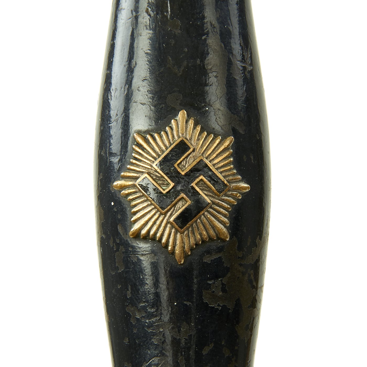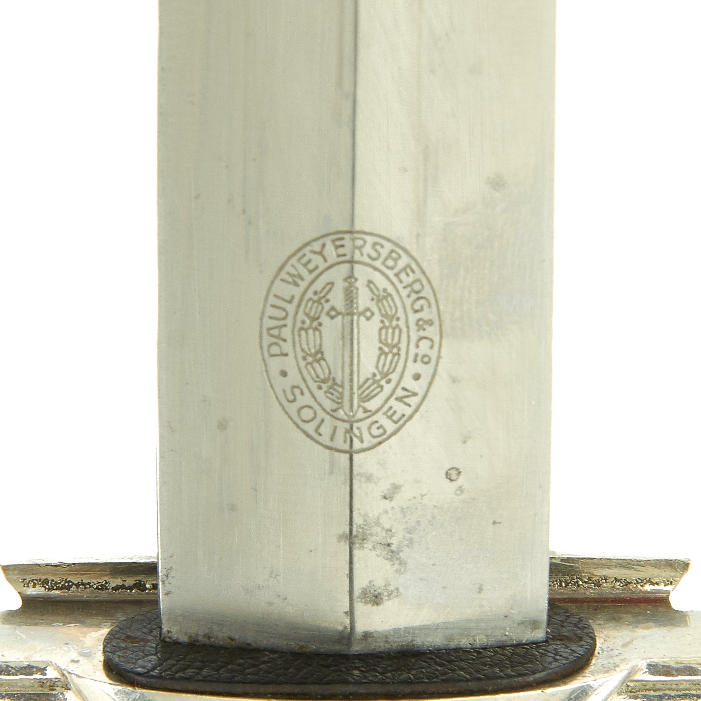 This great example was made by Paul Weyersberg of Solingen, the legendary "City of Blades" in western Germany. The reverse ricasso is etched with PAUL WEYERSBERG & Co. / SOLINGEN in double ovals around the firms trademark "Sword-and-Wreath" logo, which was the only marking they used during the Third Reich era. This company was one of many in Solingen owned by members of the Weyersberg family. The company survived the war, but ceased production in 1955. For more information please see GERMAN KNIFE AND SWORD MAKERS by J. Anthony Carter. The original leather blade washer is in place.