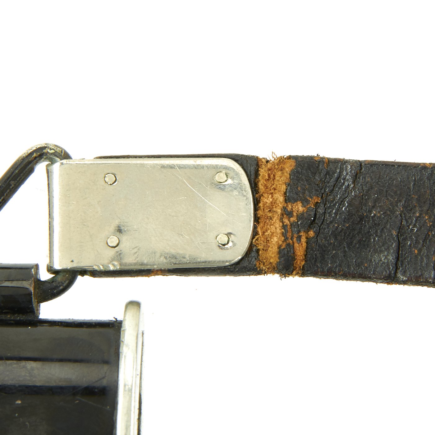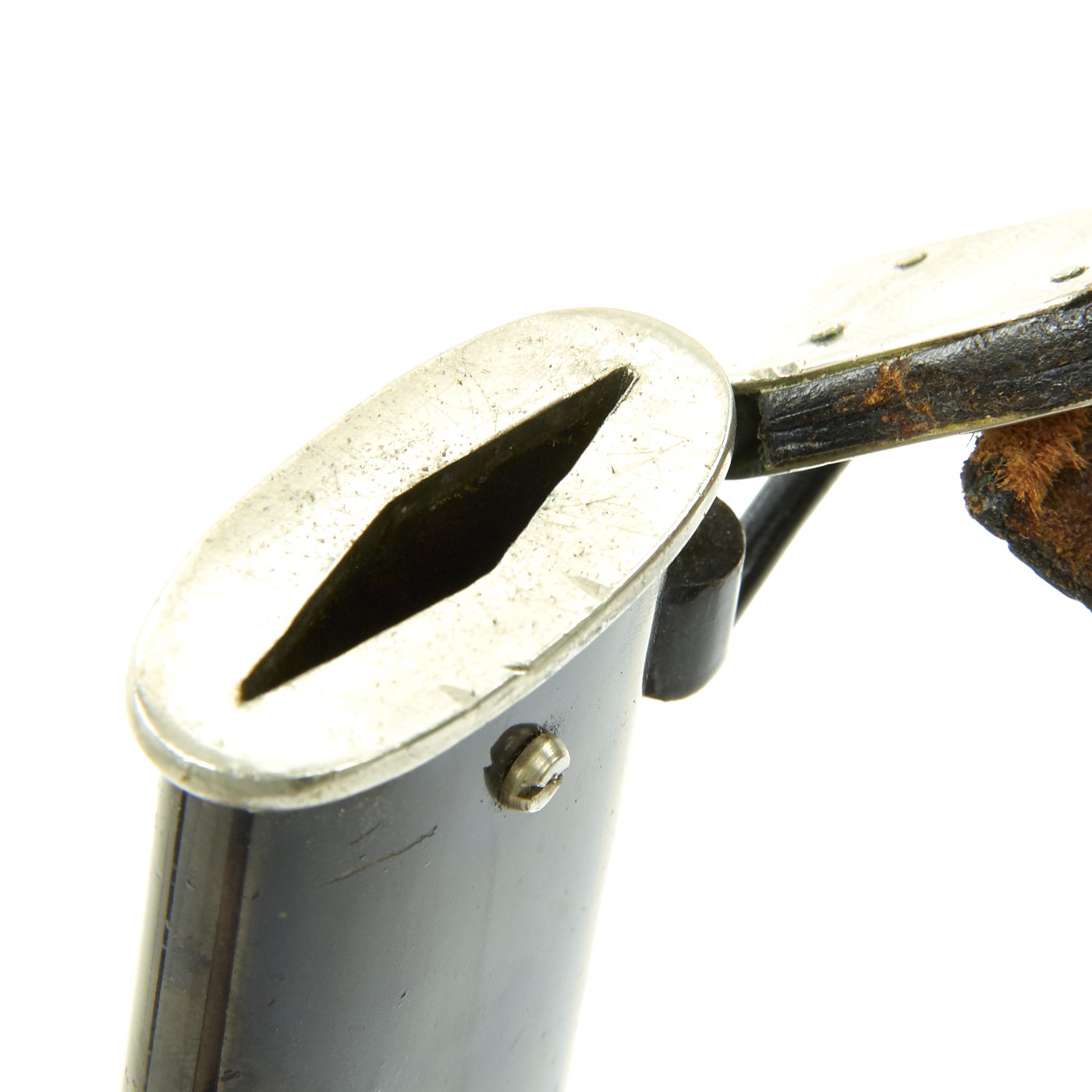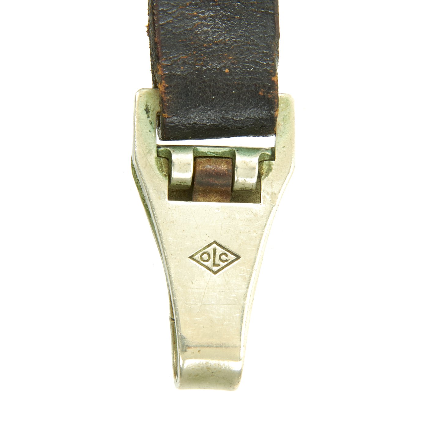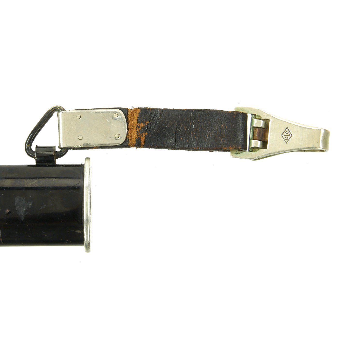 The scabbard has wonderful, original black paint. This paint is 95% intact and other than some minor scrapes crazing is close to mint condition. Attached to the scabbard is the triangular hanger retainer wire. The hanger is attached, with a nickel clip and supple leather.One of the two leather straps has separated from the base connection. The snap clip is perfectly nickel plated and olc marked.