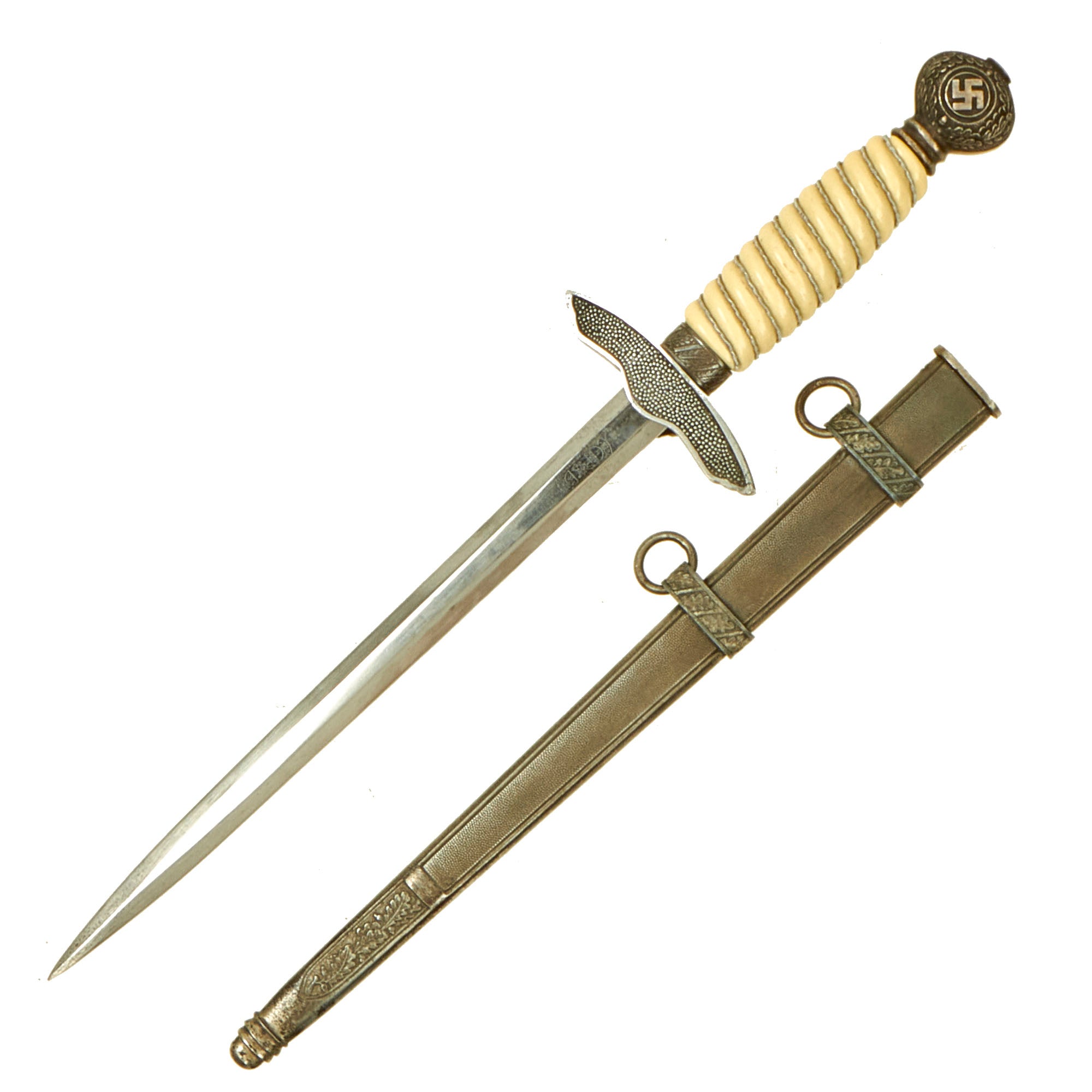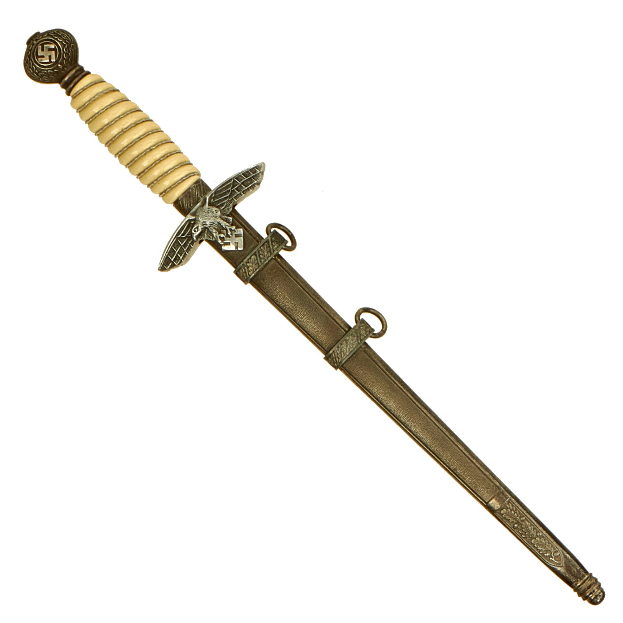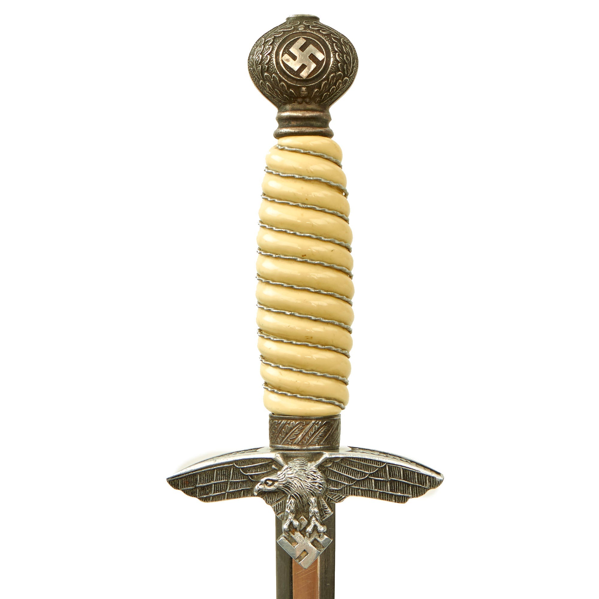 Original Item: Only One Available. This is a very nice example of a wartime production 2nd Model Luftwaffe dagger, complete with its original scabbard. It is a fine Solingen-Produced example made the rare maker Artur Schüttelhöfer & Co., Stahlwarenfabrik of Solingen. Unlike almost all that we see, the celluloid grip of this dagger is still the original ivory white color, which is very rare to see! Most fade to yellow and orange over the years due to the instability of the material. It has a nice slightly tapered shape, and is bound with bullion wrapped twisted wires. There is a bit of light staining, but no cracks, chips, or other issues.