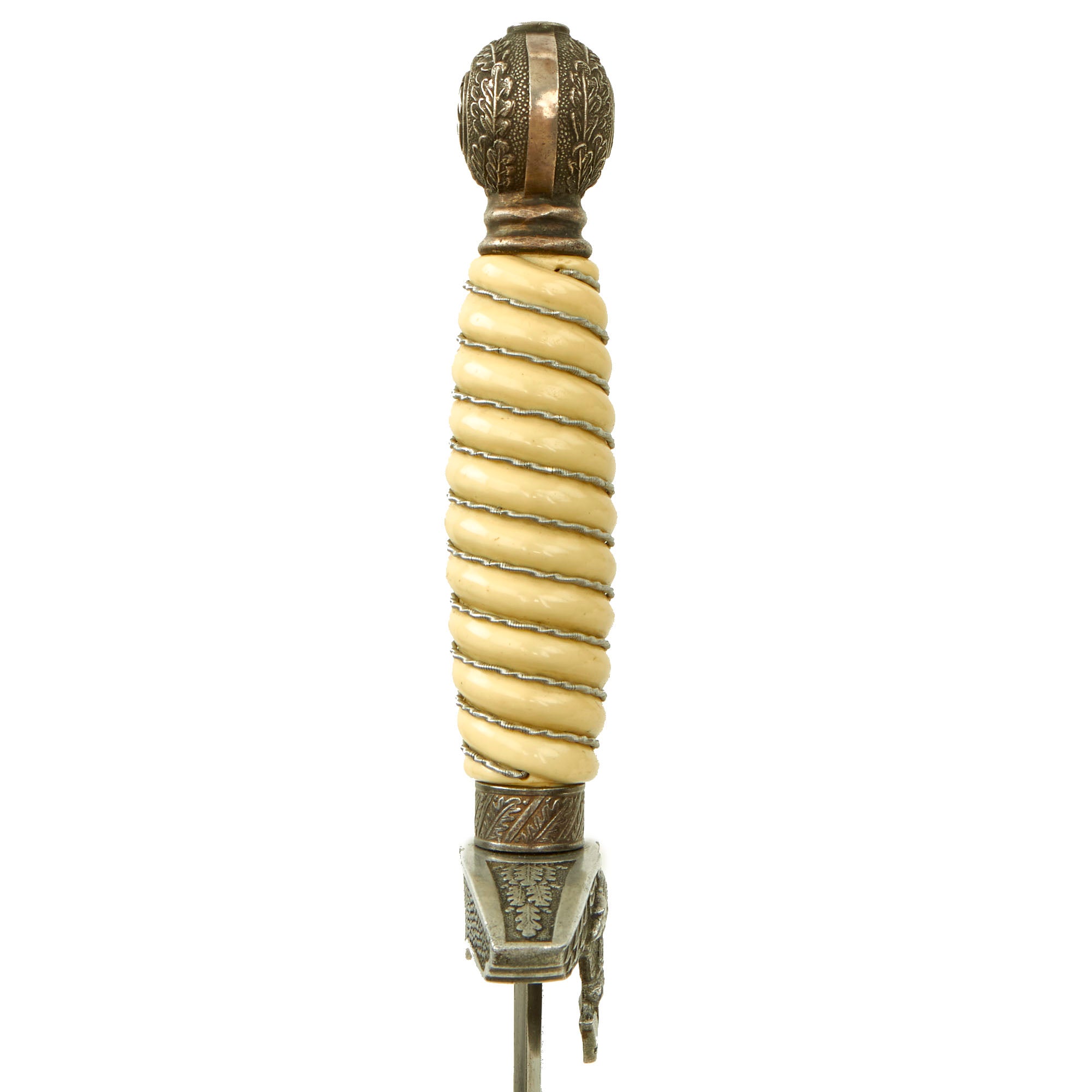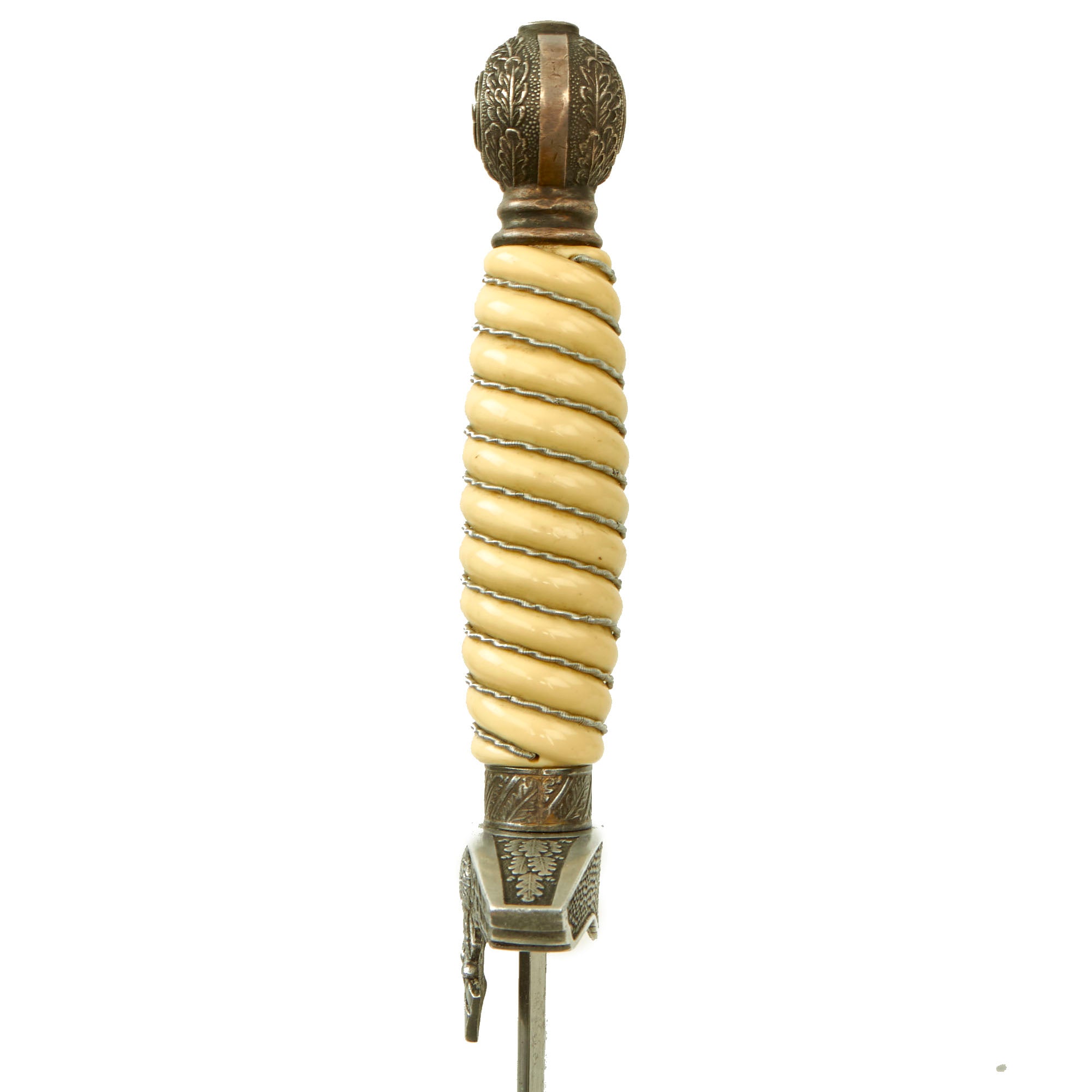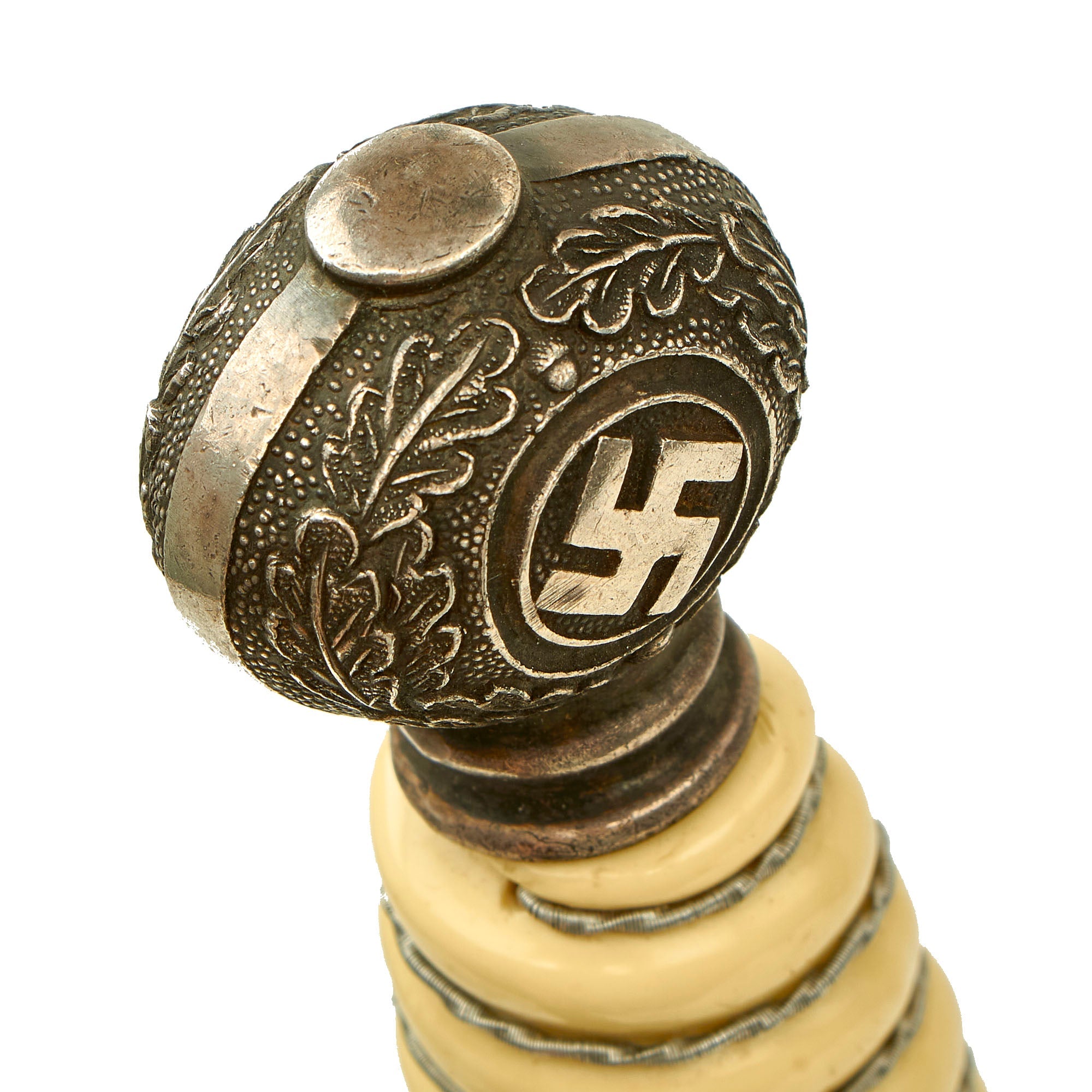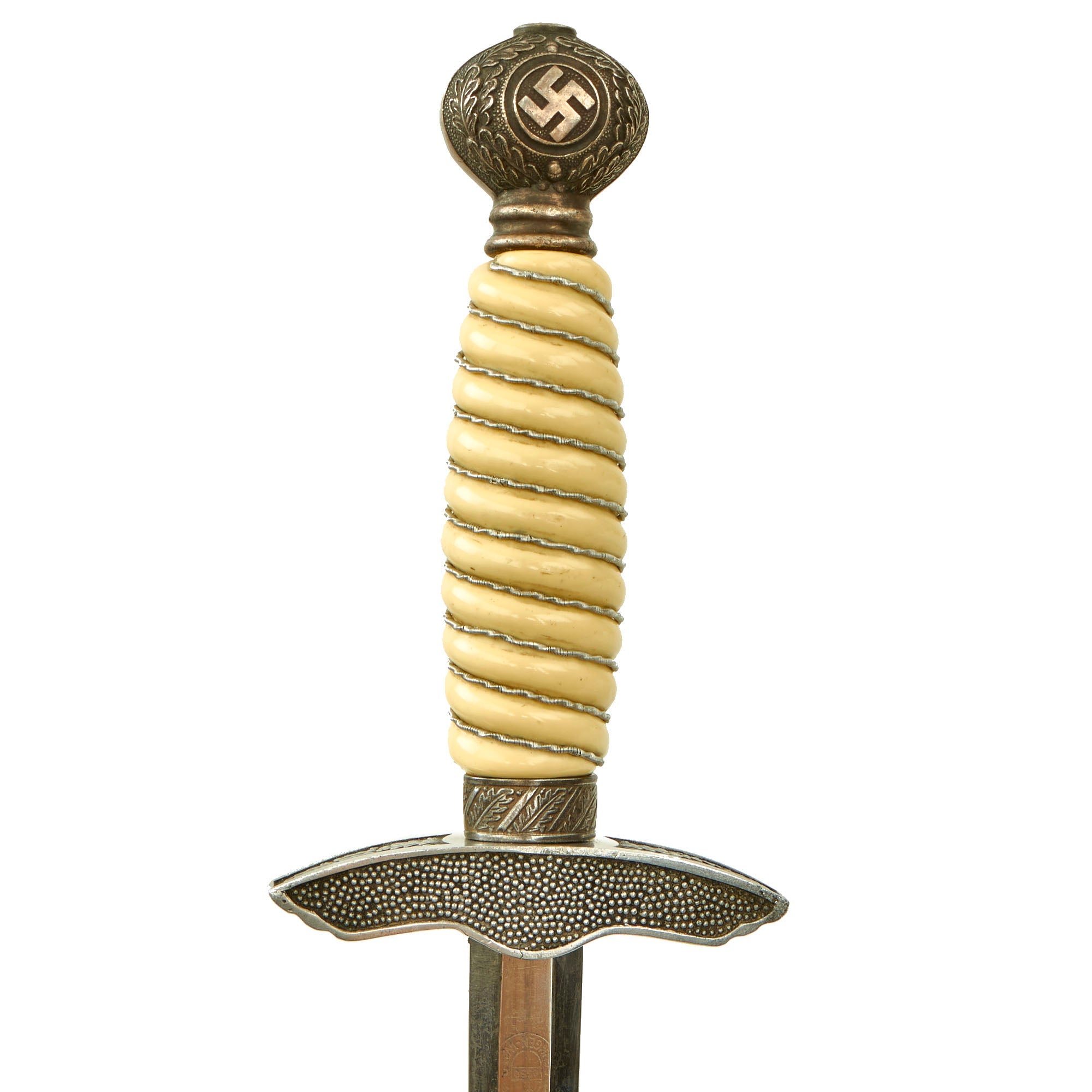 Original Item: Only One Available. This is a very nice example of a wartime production 2nd Model Luftwaffe dagger, complete with its original scabbard. It is a fine Solingen-Produced example made the rare maker Artur Schüttelhöfer & Co., Stahlwarenfabrik of Solingen. Unlike almost all that we see, the celluloid grip of this dagger is still the original ivory white color, which is very rare to see! Most fade to yellow and orange over the years due to the instability of the material. It has a nice slightly tapered shape, and is bound with bullion wrapped twisted wires. There is a bit of light staining, but no cracks, chips, or other issues.