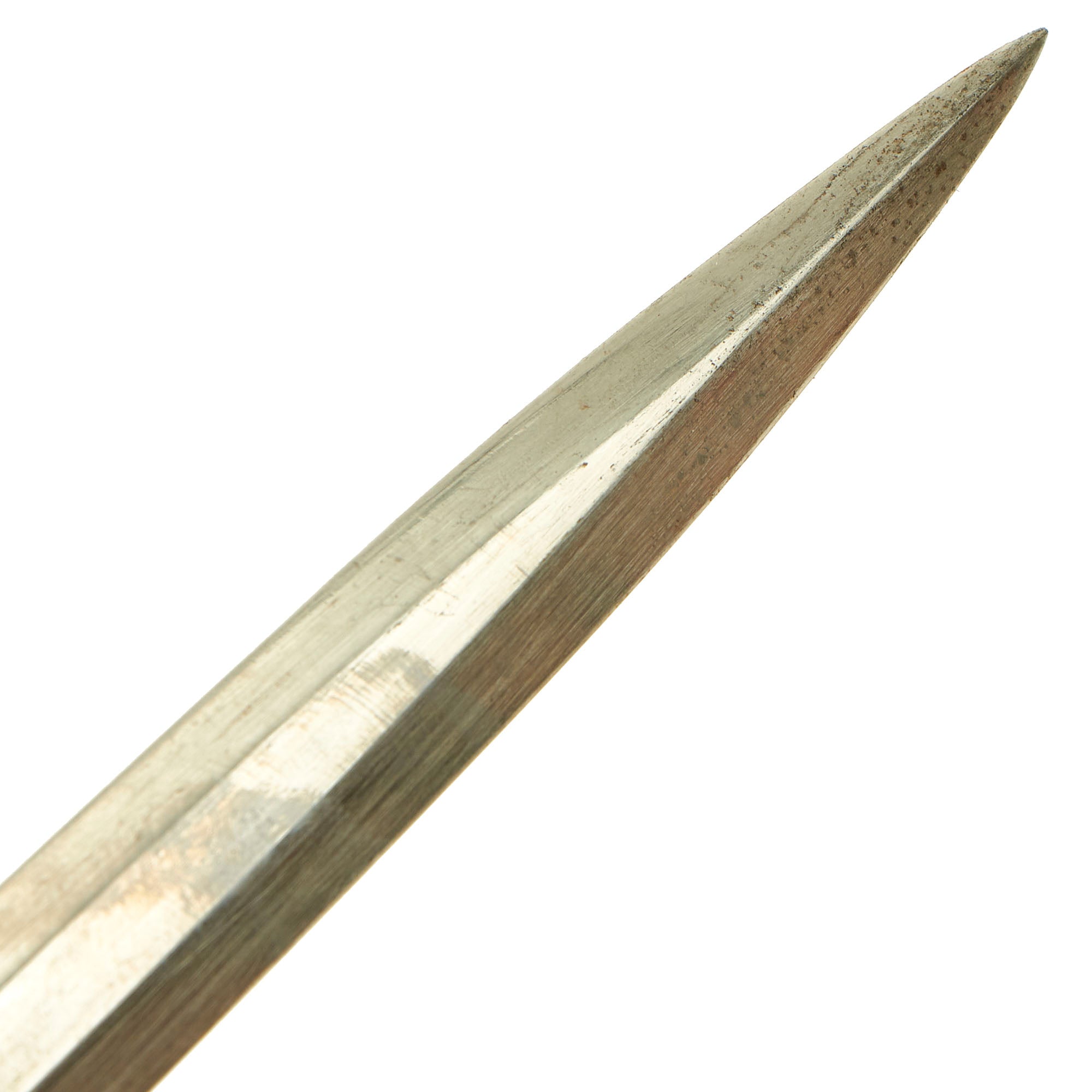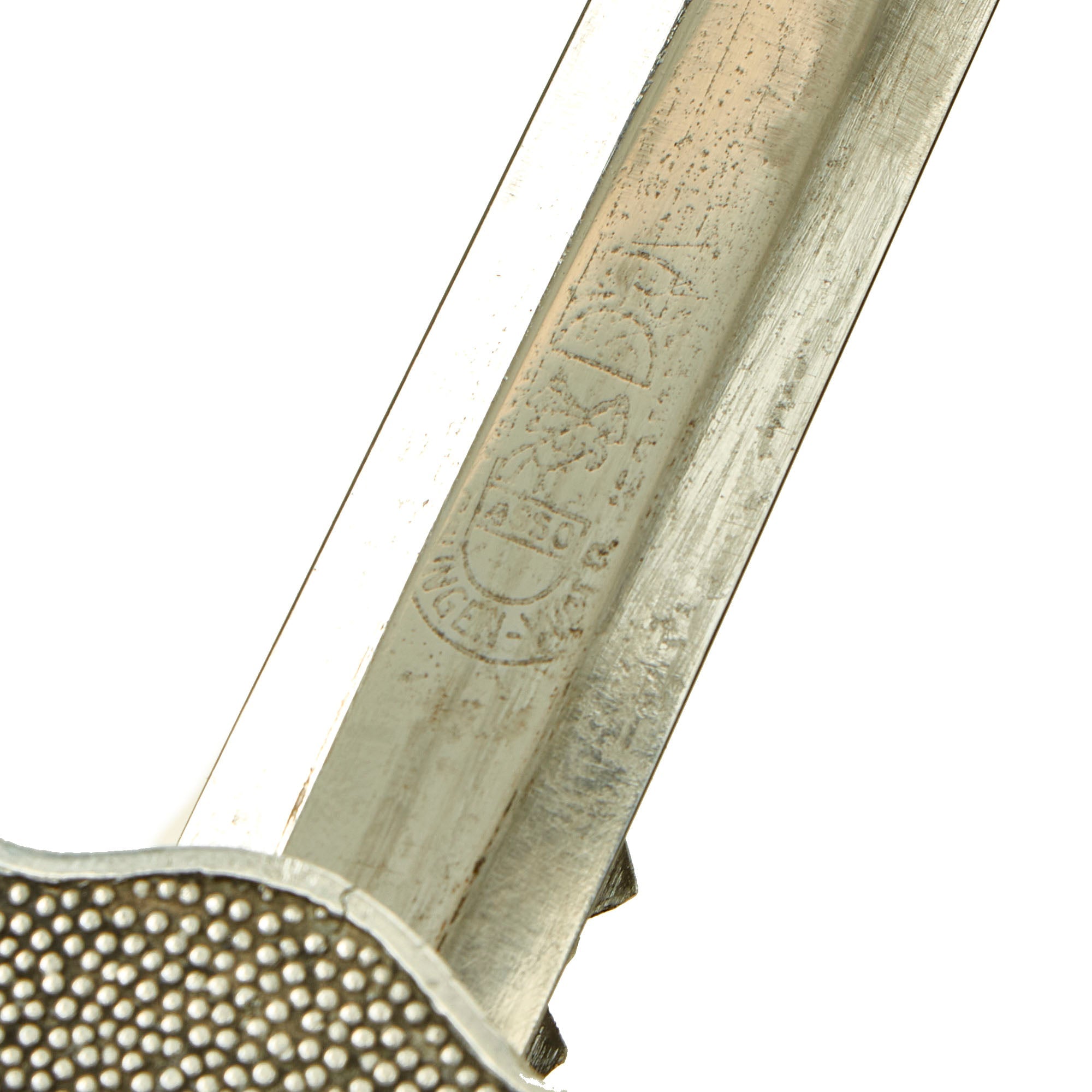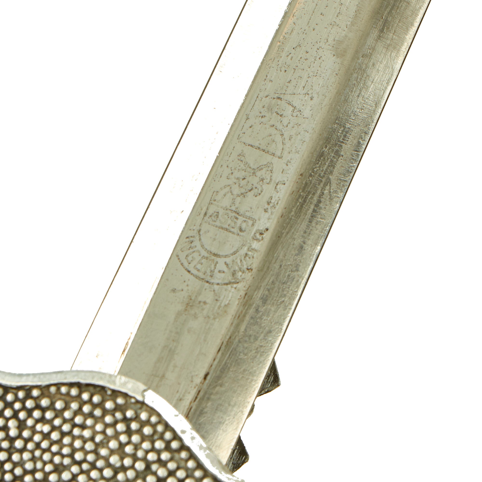 The blade on this example is not nickel plated, which is common for the 2nd model dagger blades. It is in good condition, but looks to have been cleaned / polished several times during its service life, which unfortunately has completely removed the original factory final polish grind cross grain. It also has made any markings quite faint.
