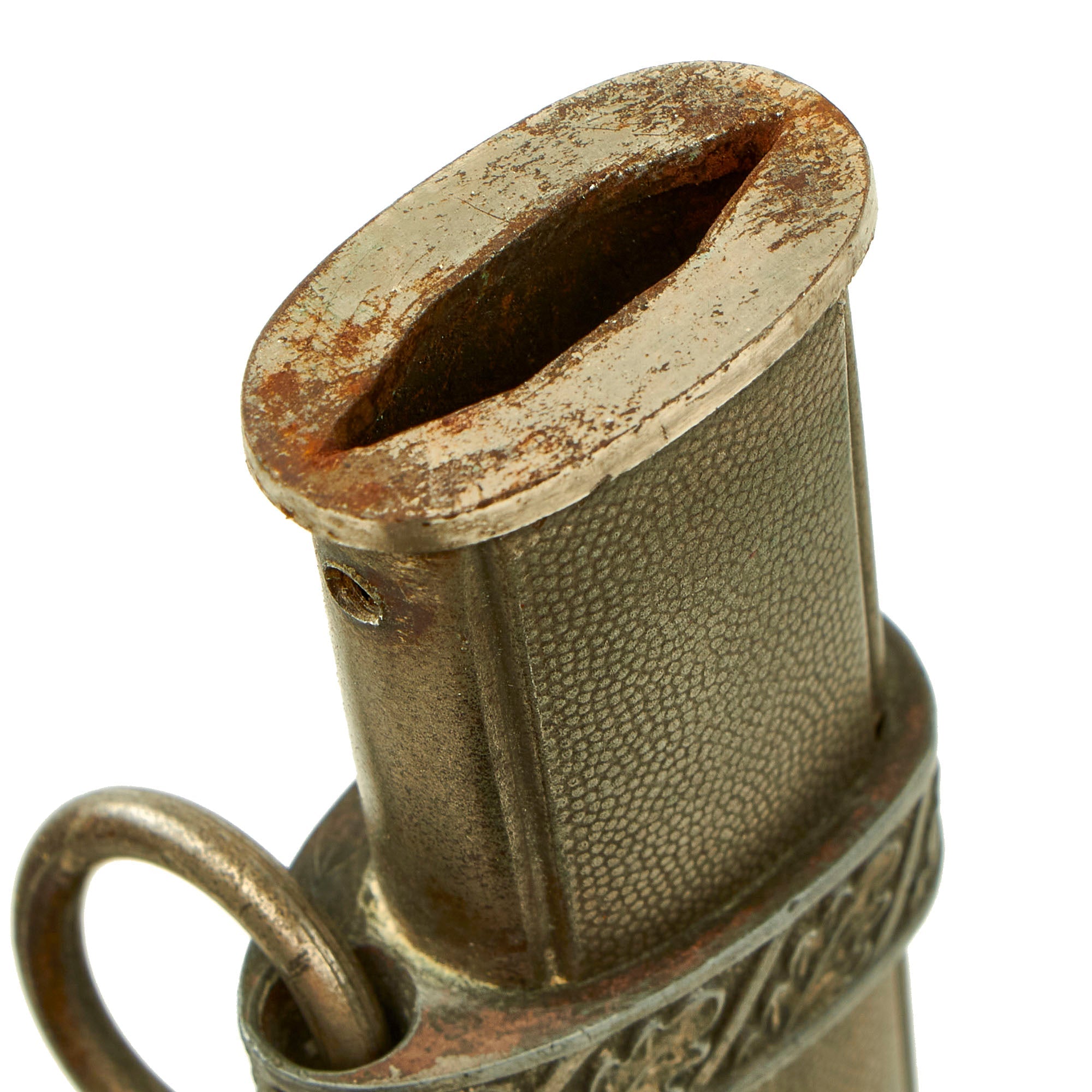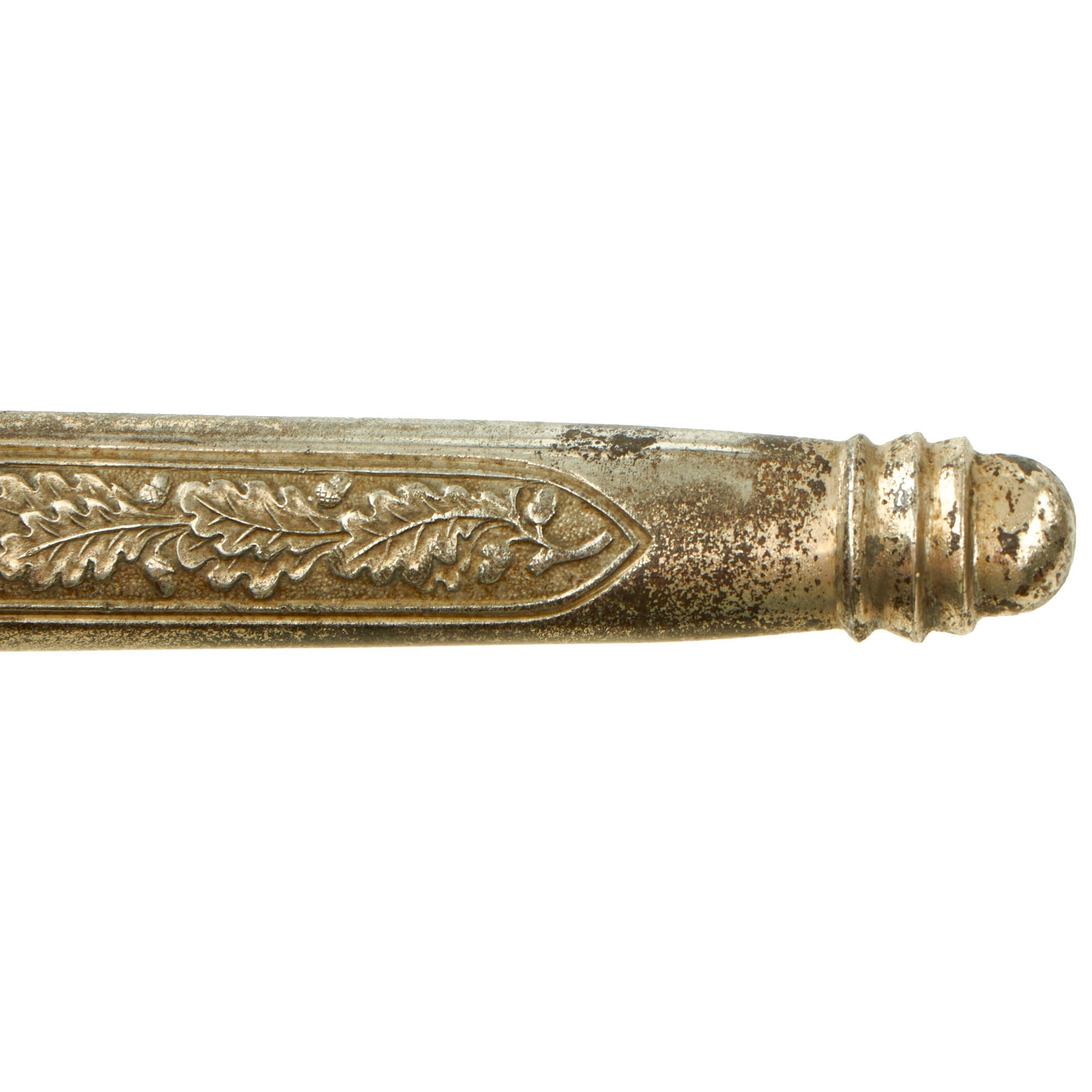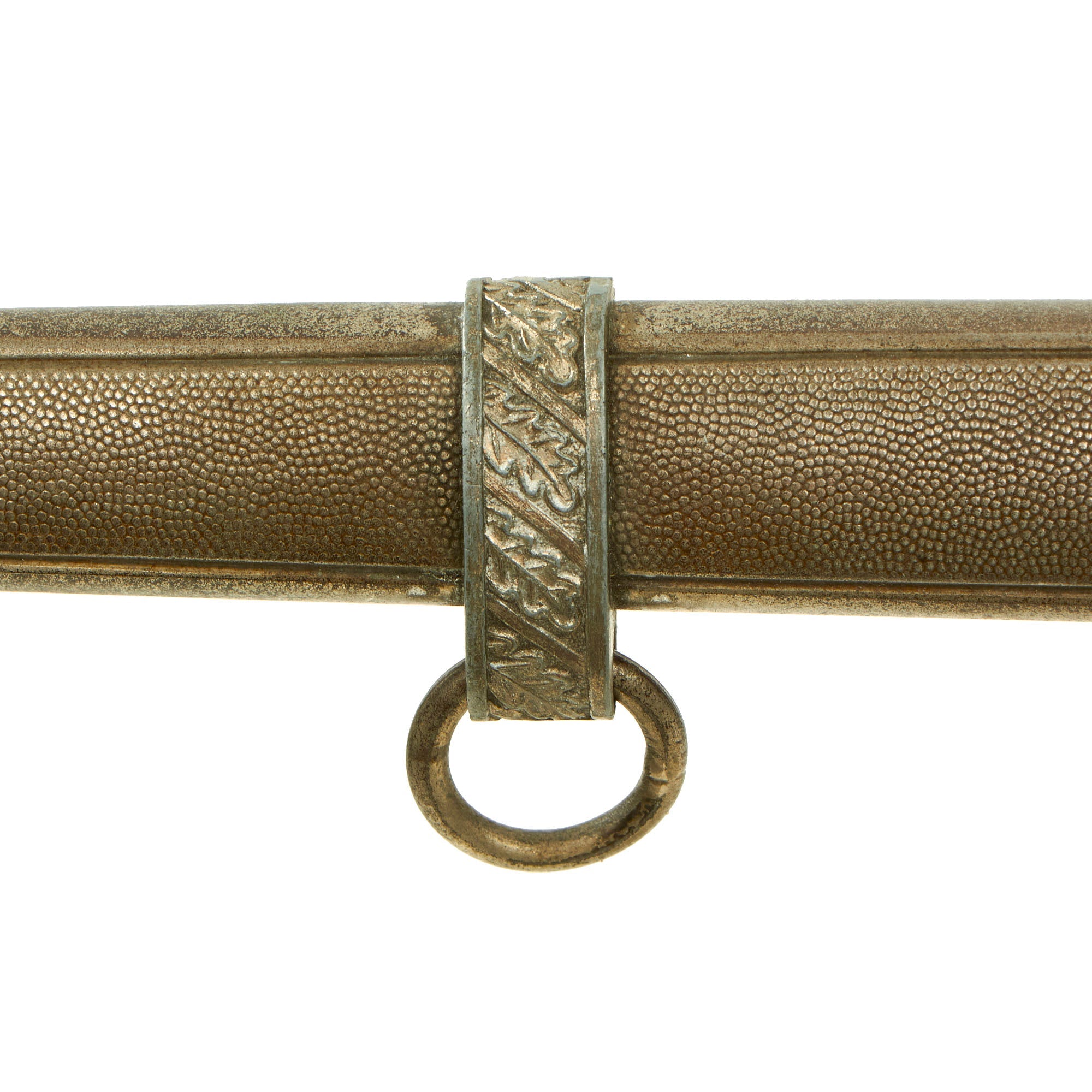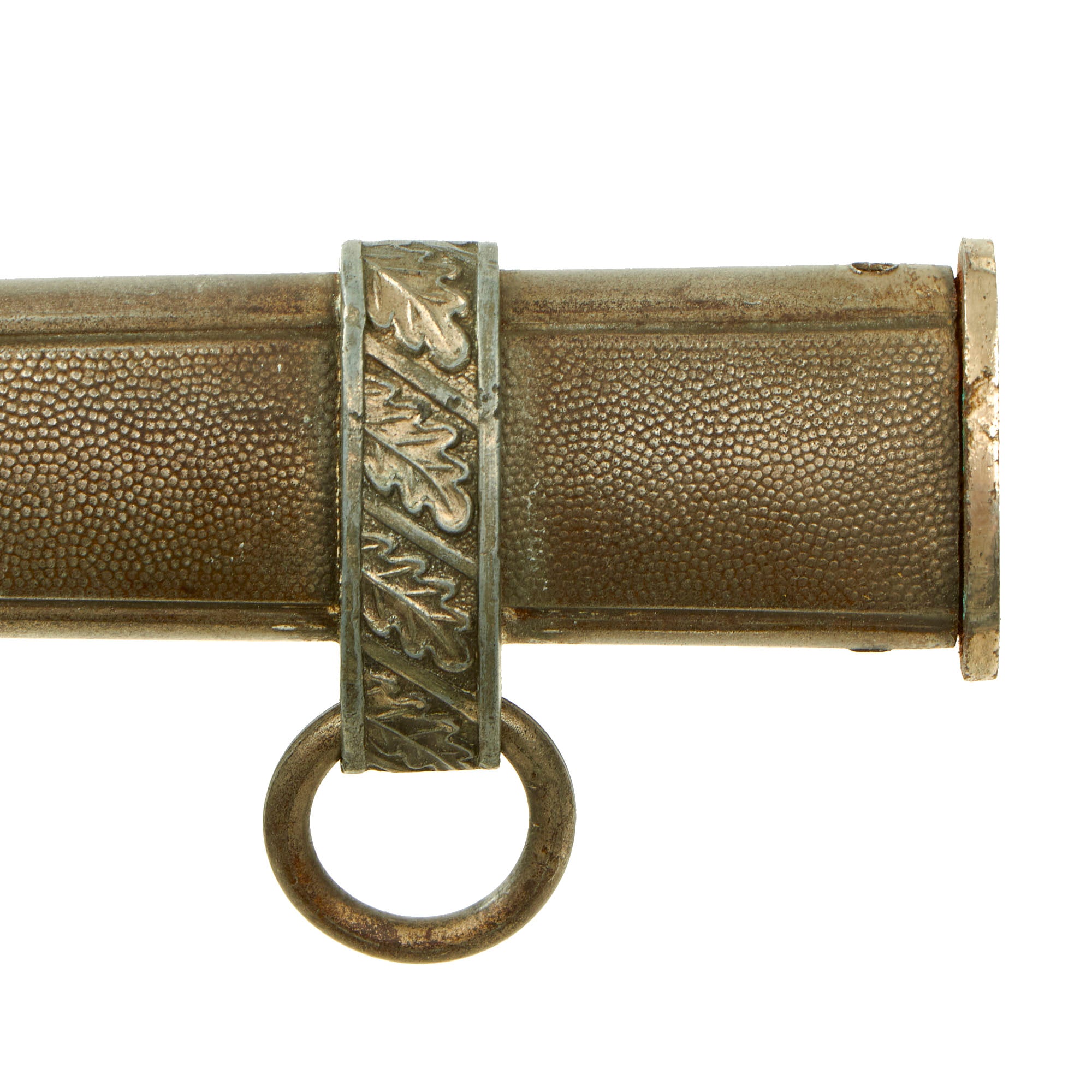 This scabbard is a fine, straight example, having much of the plated finish retained, showing some light patination where it is worn away. The steel shell shows no denting, and the pebbled panels and oak leaves and acorns near the bottom are still crisp. The bands are zinc alloy, and are well defined and have outstanding hand enhanced oak leaves tipped at a 45 degree angle, with some wear. There is very little wear around the hanger rings, and the throat is the narrow style, retained by screws on the narrow sides of the scabbard, both of which are missing.