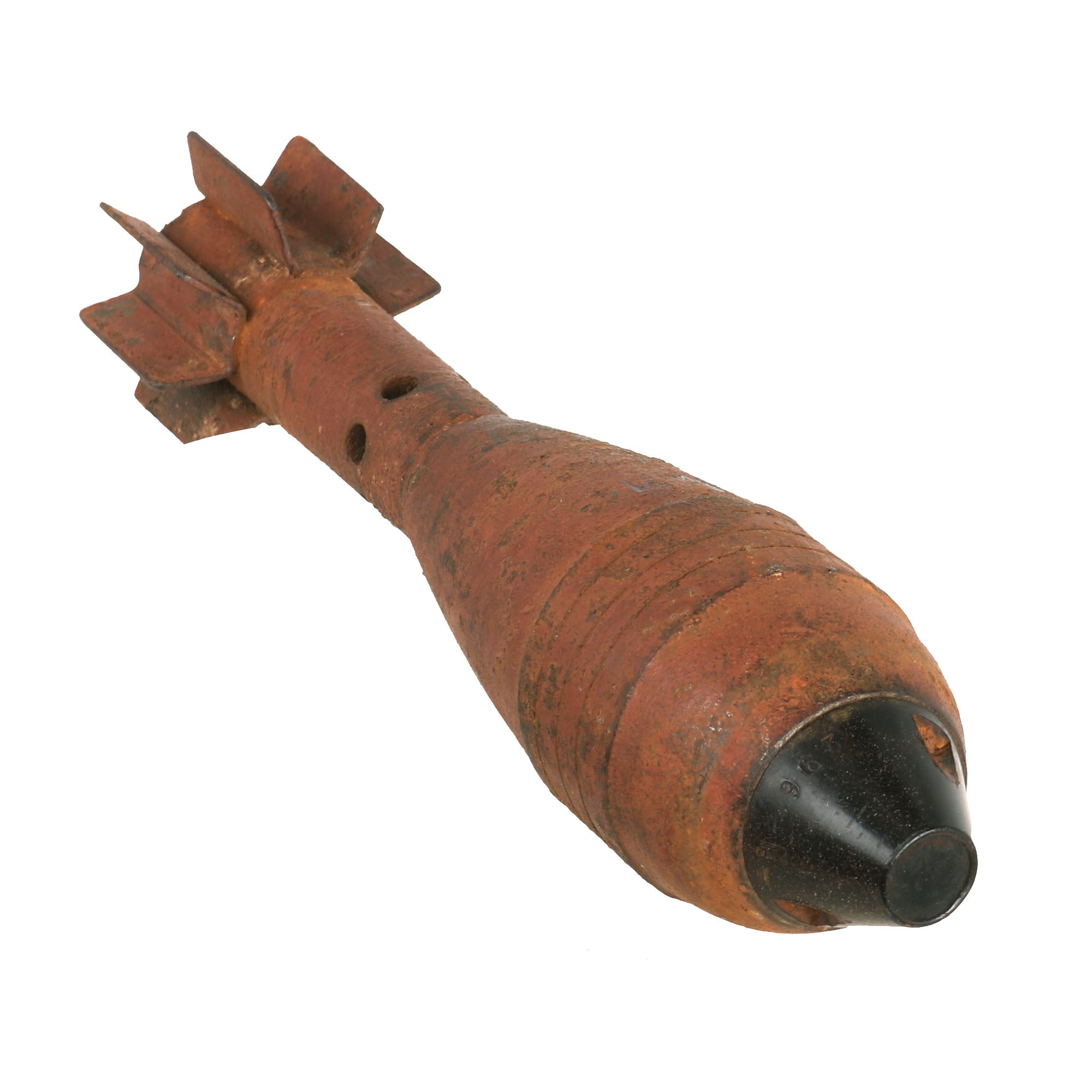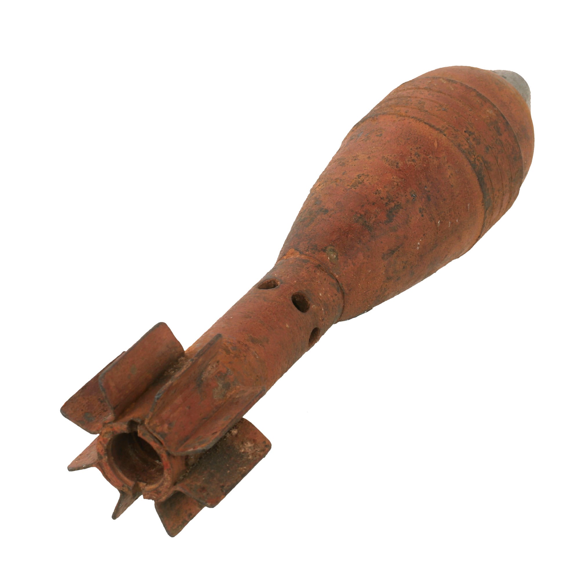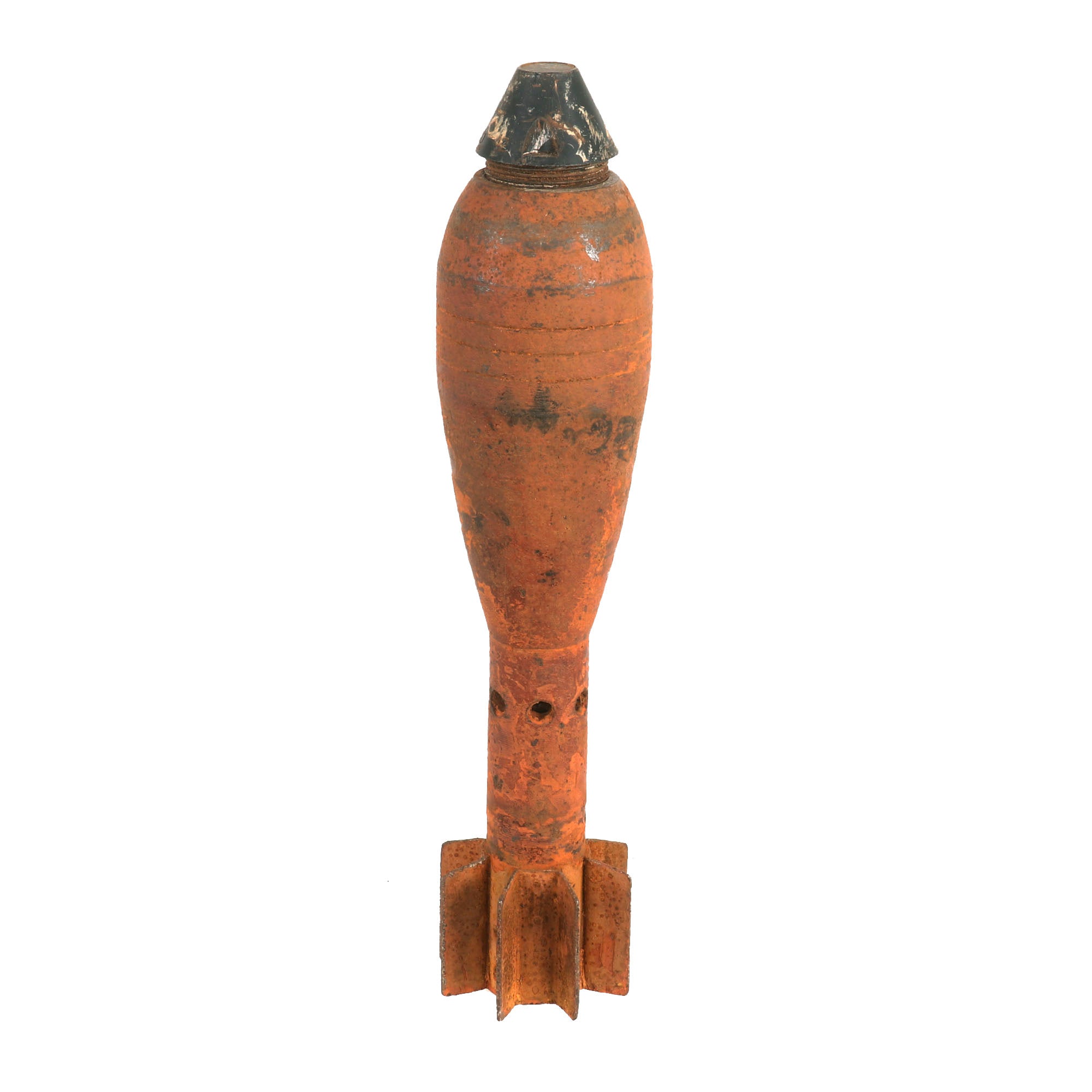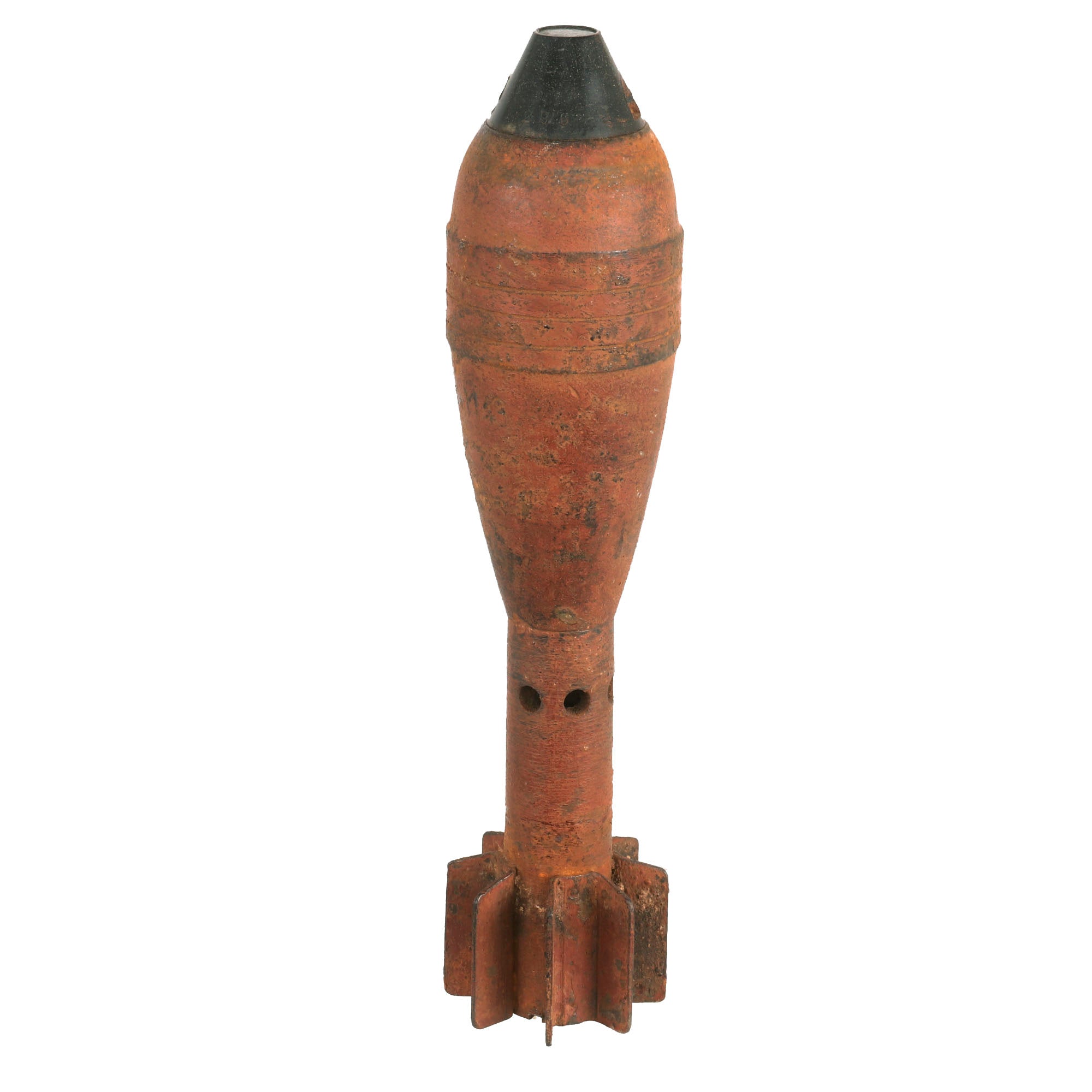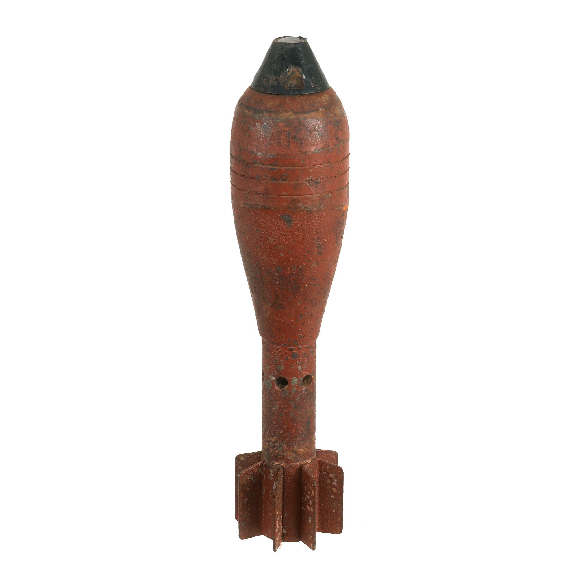 Original Item: Only One Available. This is a lovely totally genuine 5cm mortar round steel transportation case for the 5 cm Leichter Granatwerfer 36 (light grenade launcher). The rounds it carried are High Explosive anti personnel bombs with a finned tail, of 8 blades, that would carry the cartridge. The bodies are manufactured from 4mm thick mild steel, with a screw threaded fuze hole that would accept a quick acting aluminum or Bakelite Wgr. Z. 38 nose fuse. The body would have contained a bursting charge of TNT, of approximately 4 1/2 ounces in weight. Muzzle velocity was 246 feet-per-second with a range of 55-558 yards.