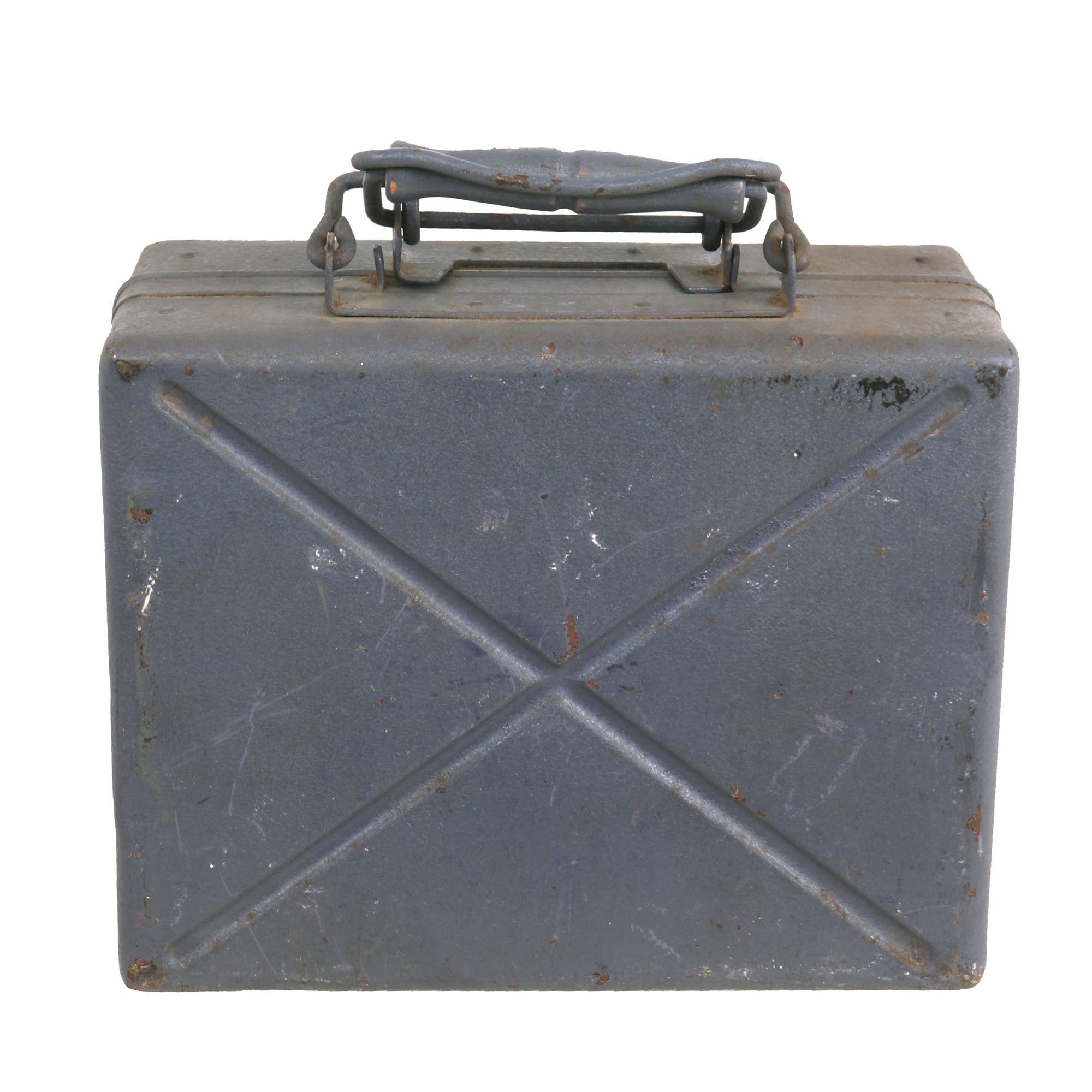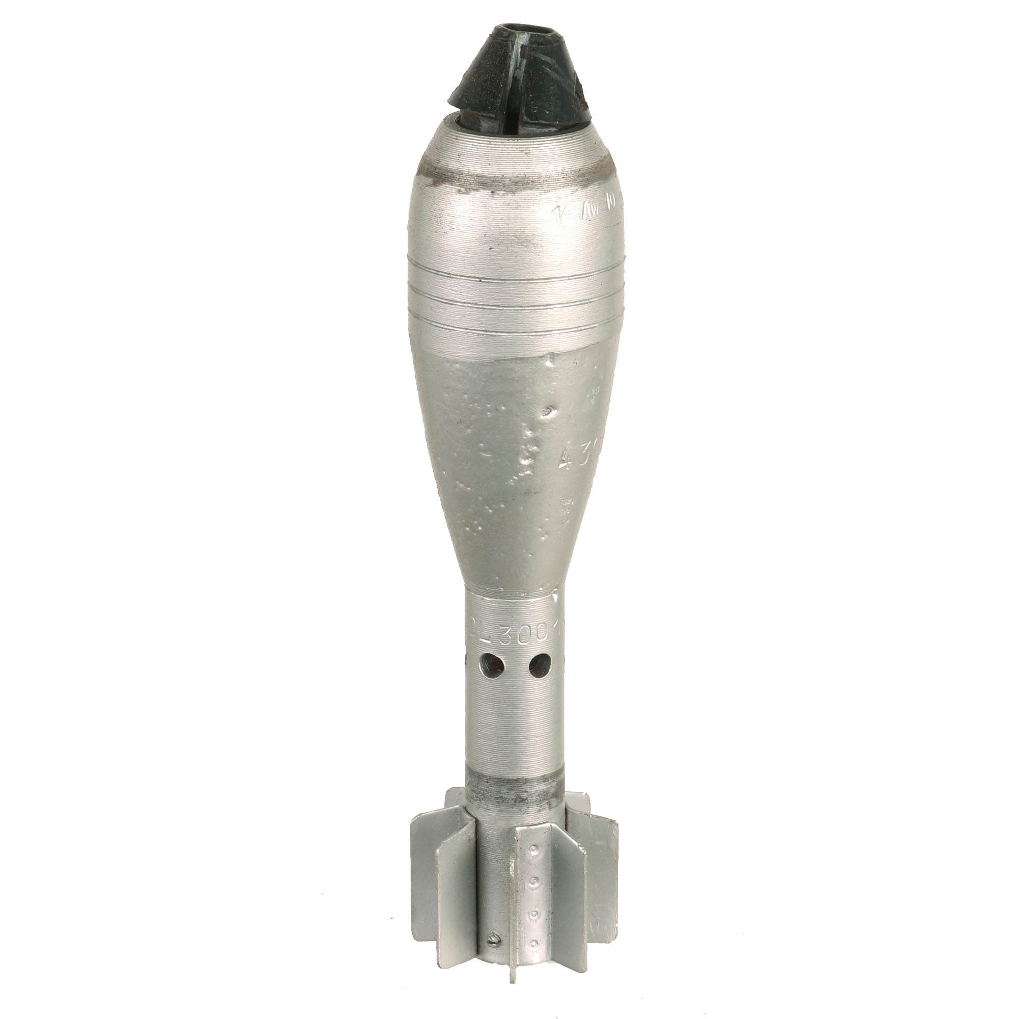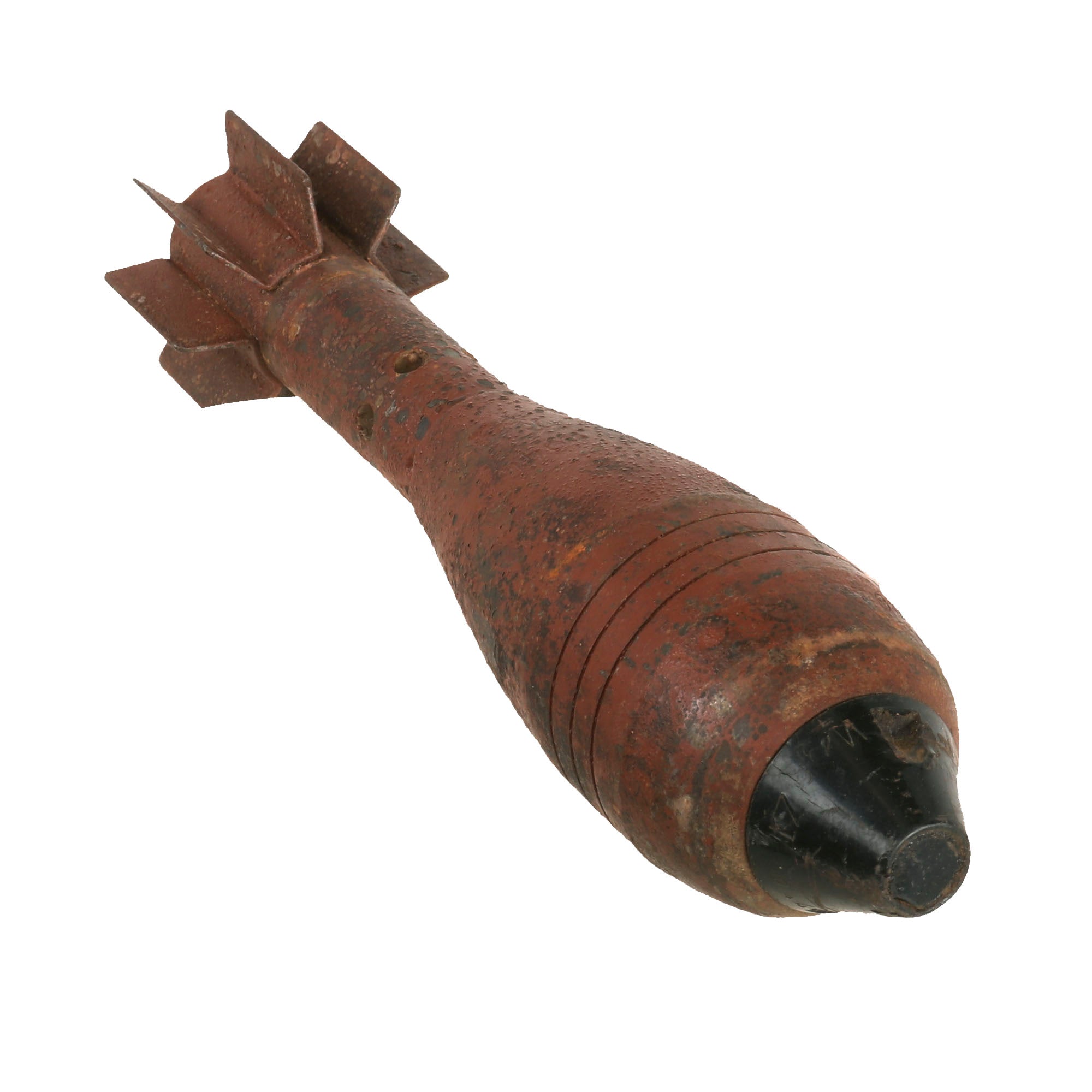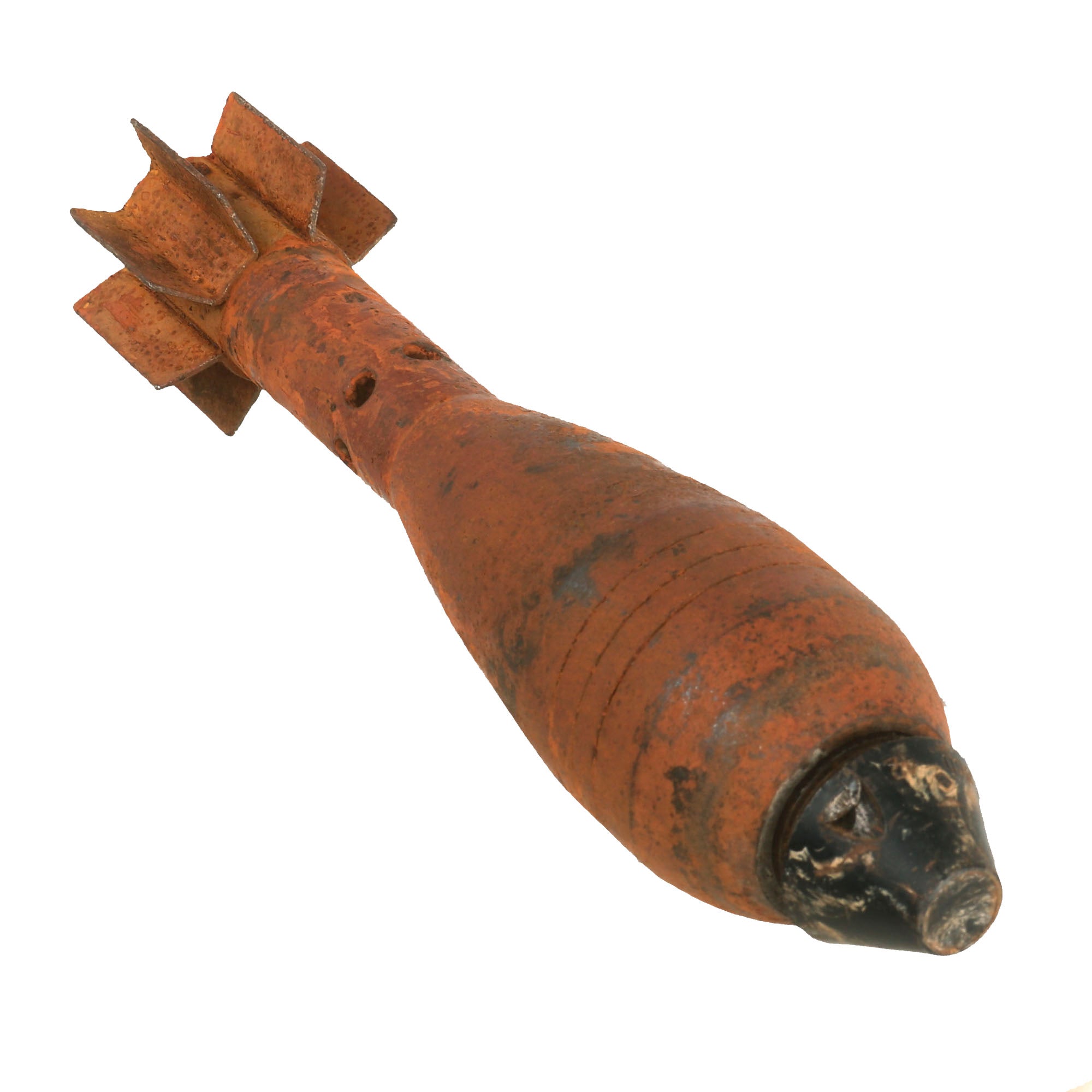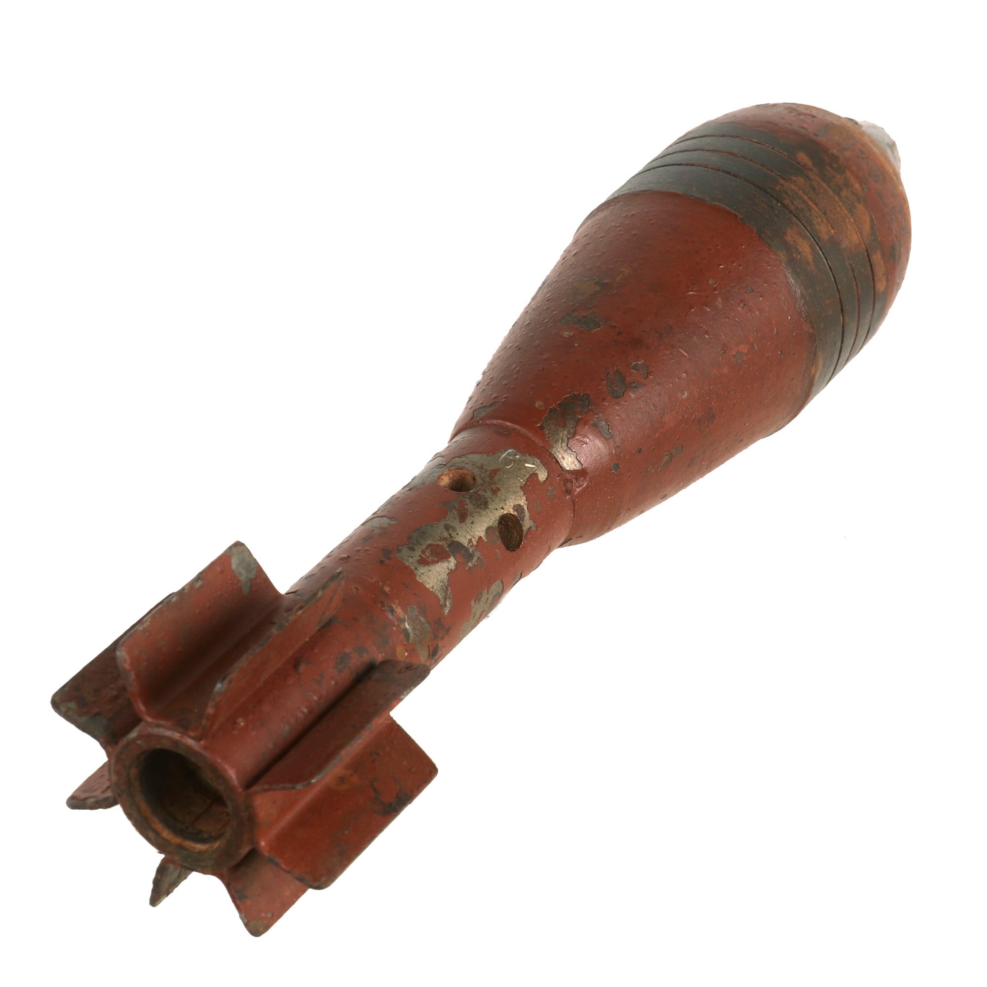 Original Item: Only One Available. This is a lovely totally genuine 5cm mortar round steel transportation case for the 5 cm Leichter Granatwerfer 36 (light grenade launcher). The rounds it carried are High Explosive anti personnel bombs with a finned tail, of 8 blades, that would carry the cartridge. The bodies are manufactured from 4mm thick mild steel, with a screw threaded fuze hole that would accept a quick acting aluminum or Bakelite Wgr. Z. 38 nose fuse. The body would have contained a bursting charge of TNT, of approximately 4 1/2 ounces in weight. Muzzle velocity was 246 feet-per-second with a range of 55-558 yards.