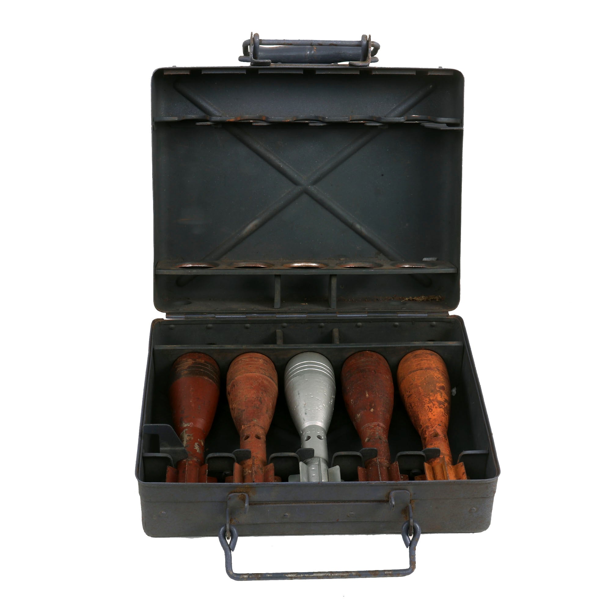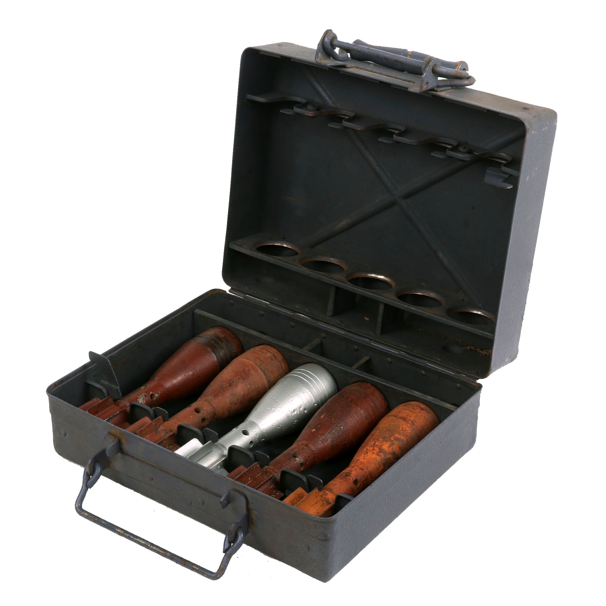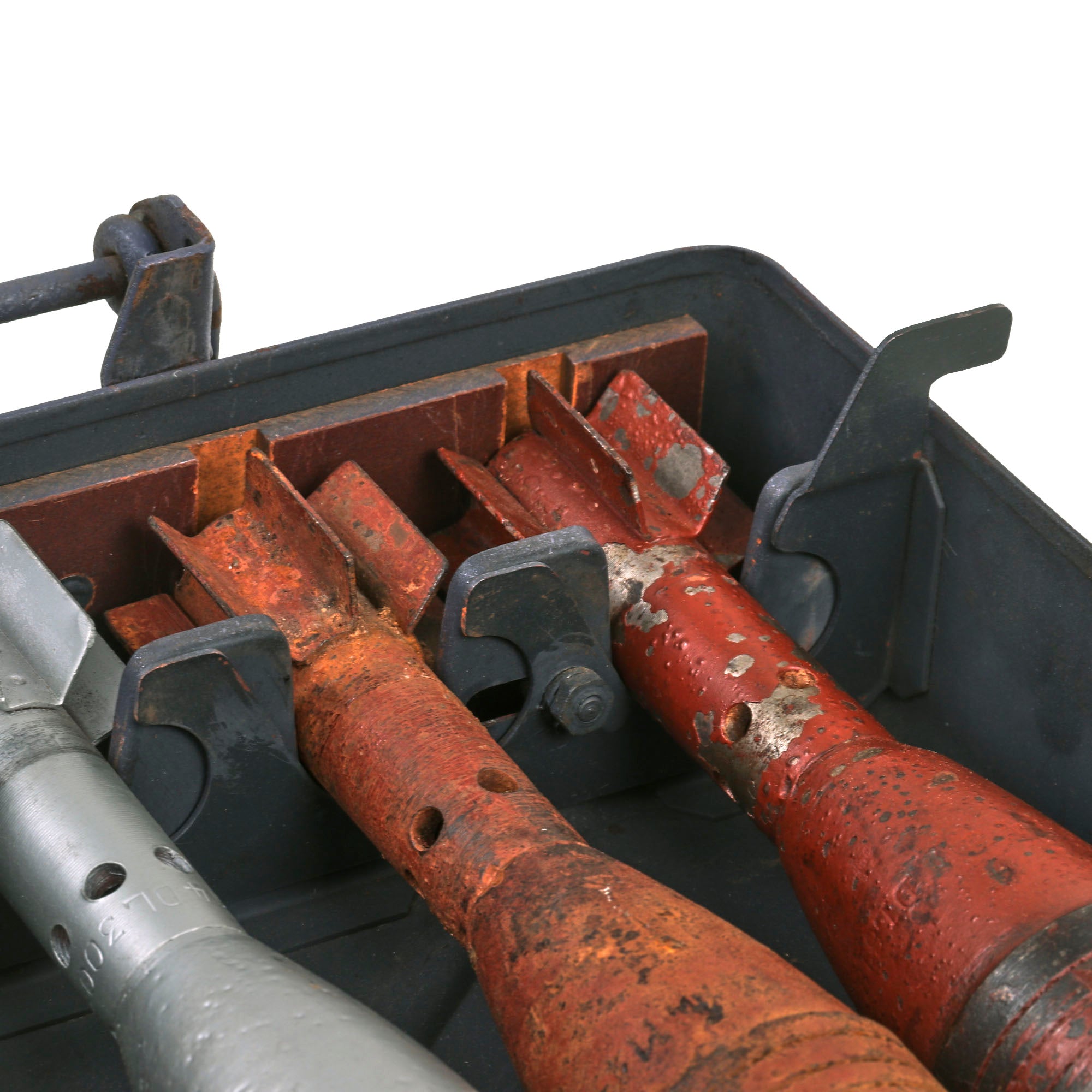 The mortar case is offered in good condition and shows signs of age and rust. It is now painted what looks to be Luftwaffe gray, but we believe this may have been done post war. On the interior all of the original spacers and pads are present, and the locking mechanisms that hold the tails of the rounds in place are both fully functional, top and bottom. Included with are FIVE inert 5cm mortar rounds with bakelite fuses, which vary in condition.