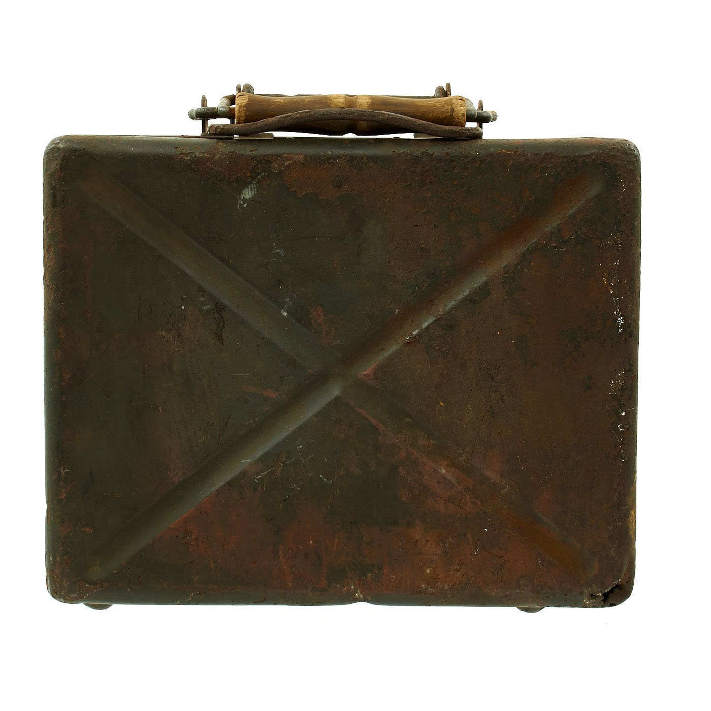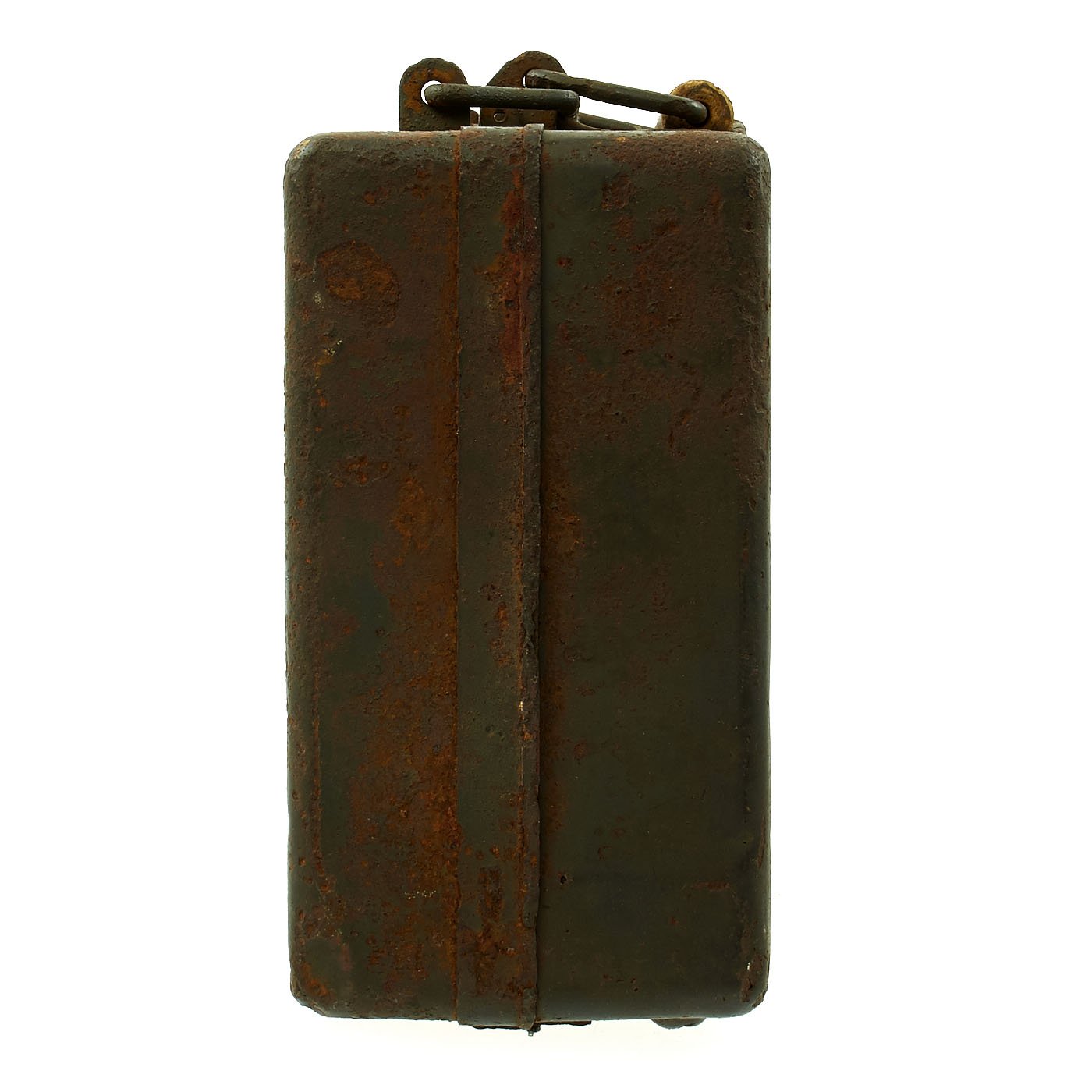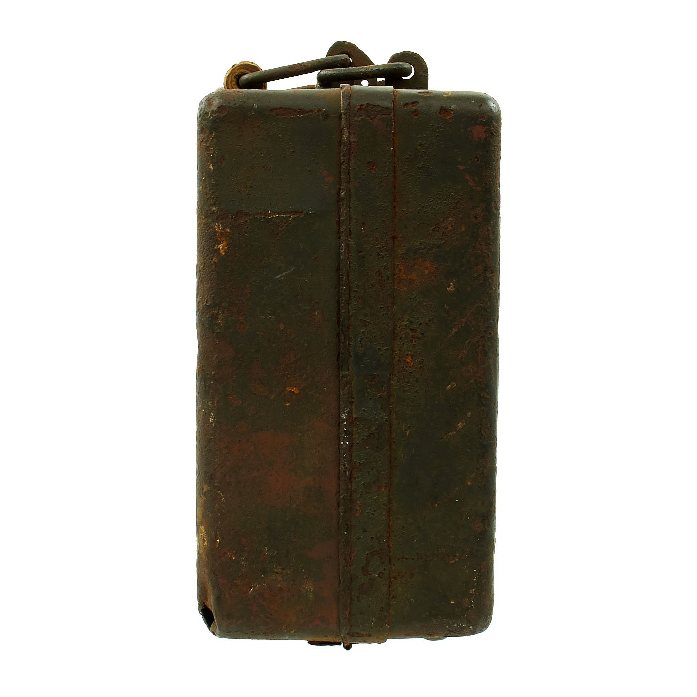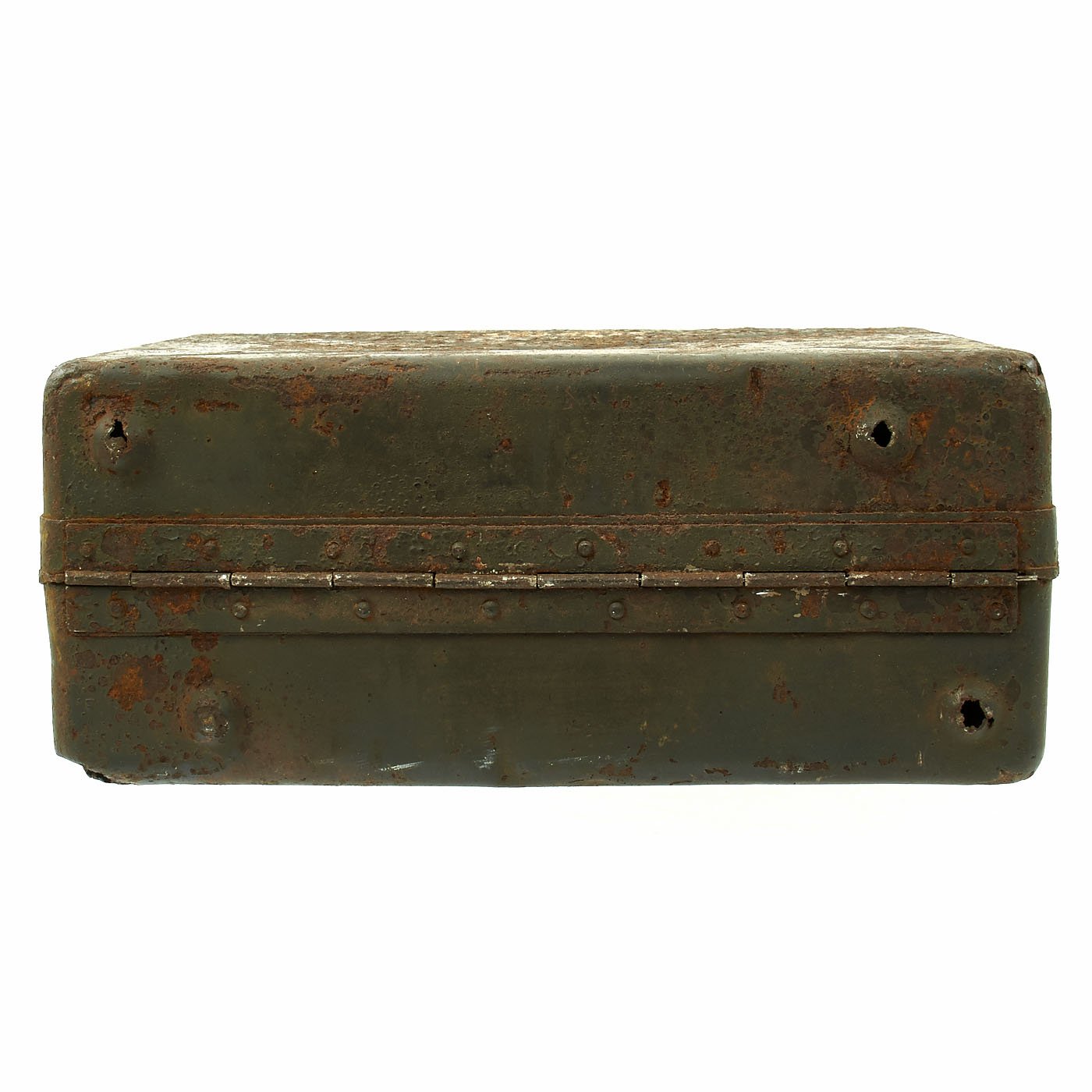 Original Item: Only One Available. 5cm mortar round steel transportation case for the 5 cm Leichter Granatwerfer 36 (lighter grenade launcher). The rounds it carried are High Explosive anti personnel bombs with a finned tail, of 8 blades, that would carry the cartridge. The bodies are manufactured from 4mm thick mild steel, with a screw threaded fuze hole that would accept a quick acting aluminum or Bakelite Wgr. Z. 38 nose fuse. The body would have contained a bursting charge of TNT, of approximately 4 1/2 ounces in weight. Muzzle velocity was 246 feet-per-second with a range of 55-558 yards. The bombs would be transported in this a specially designed steel transit case with capacity of 10 bombs. Box measures 12" x 9" x 5".
