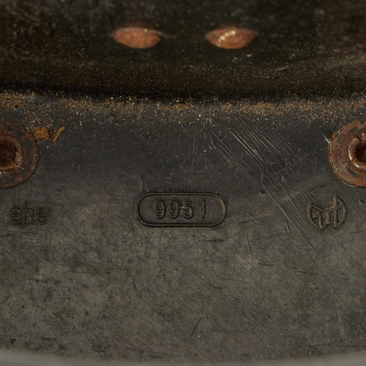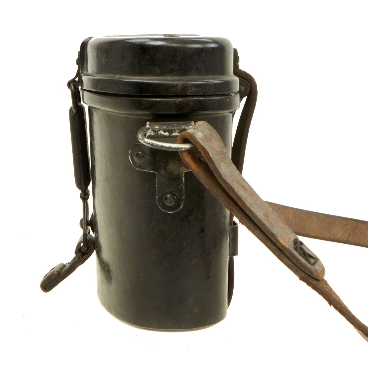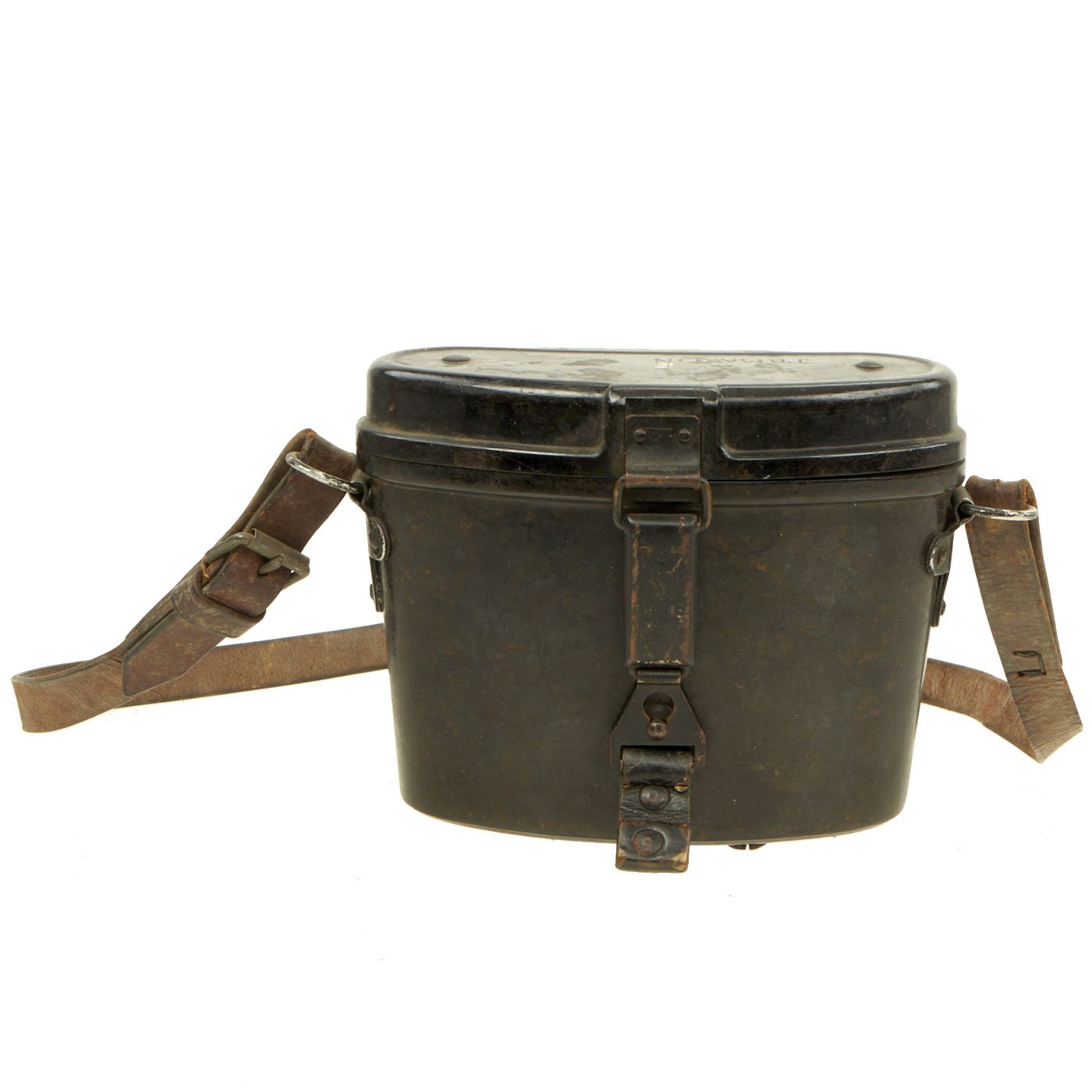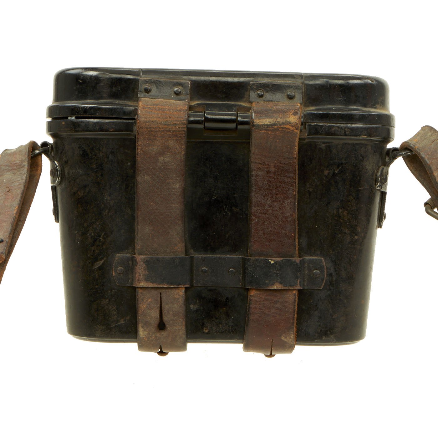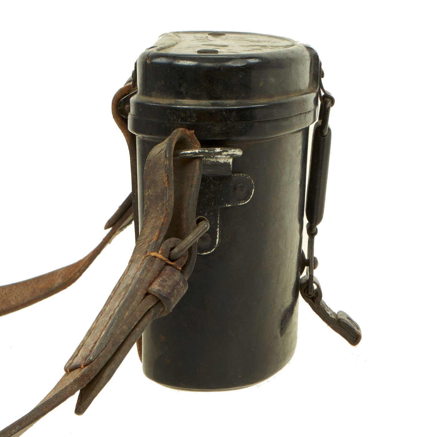 The included bakelite case is in very good condition, and still has an intact leather carry strap and leather belt straps, though they may be wartime replacements. The case closure works perfectly, and it measures 7"W x 5 1/2"H x 3 1/2" overall. The top has had J.B. MARTIN scratched in, probably the name of the soldier that brought it back. Inside the case are mold numbers, as well as maker code ehe, for H. Römmler of Spremberg / Nieder Lothringen. This was a known plastic maker during WWII, who also produced bakelite buttstocks for the MG 34.