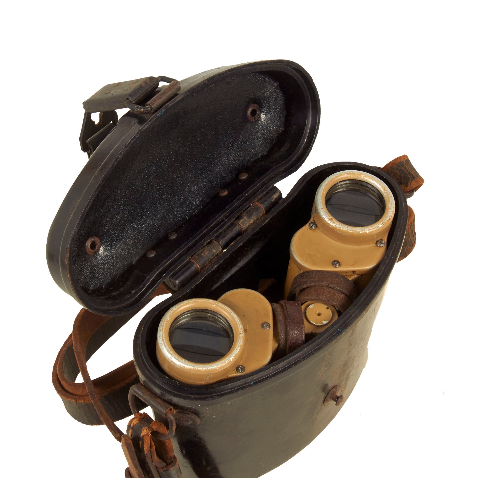 The use of the three letter code, indicates that these were made after 1940. ddx represents Voighlander & Sons of Brunswick. The included Bakelite carry case is in wonderful condition and still retains the original belt strap, though the carry straps are unfortunately broken.