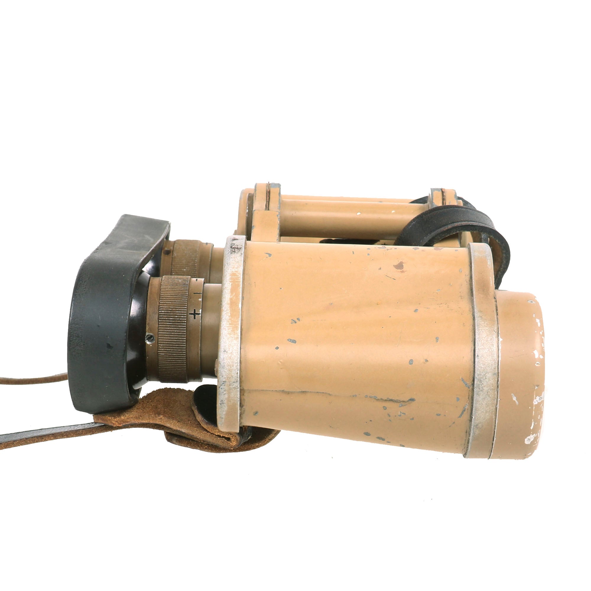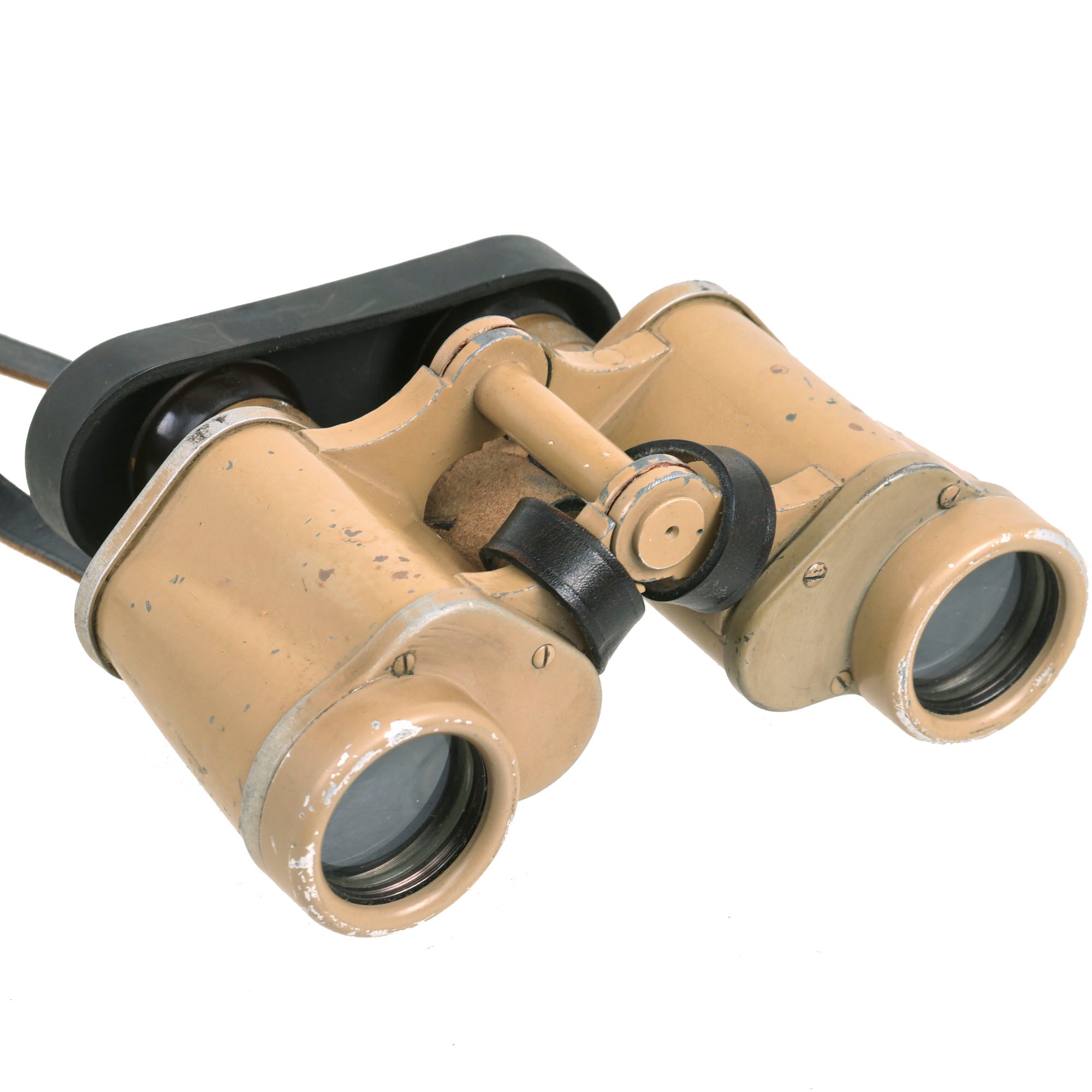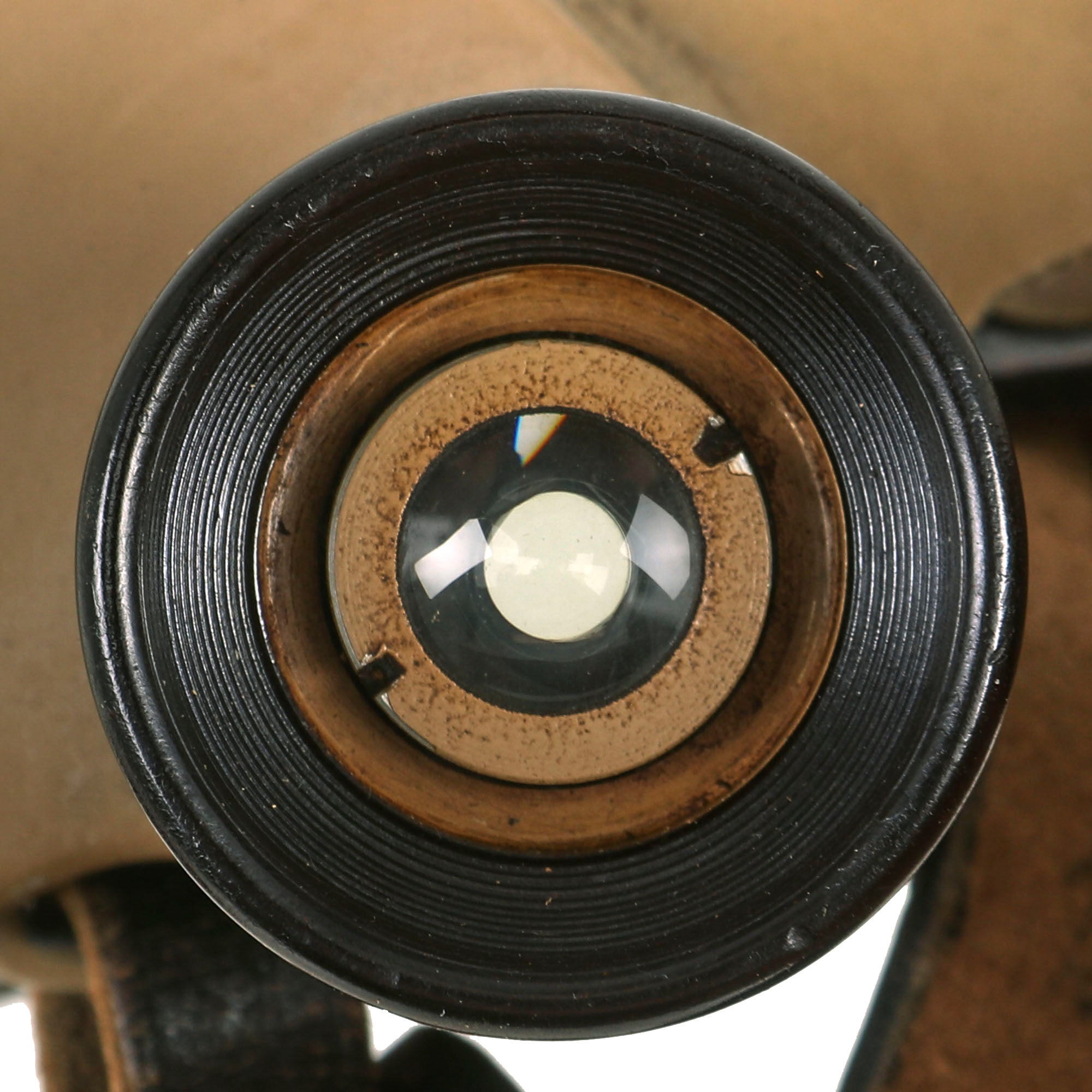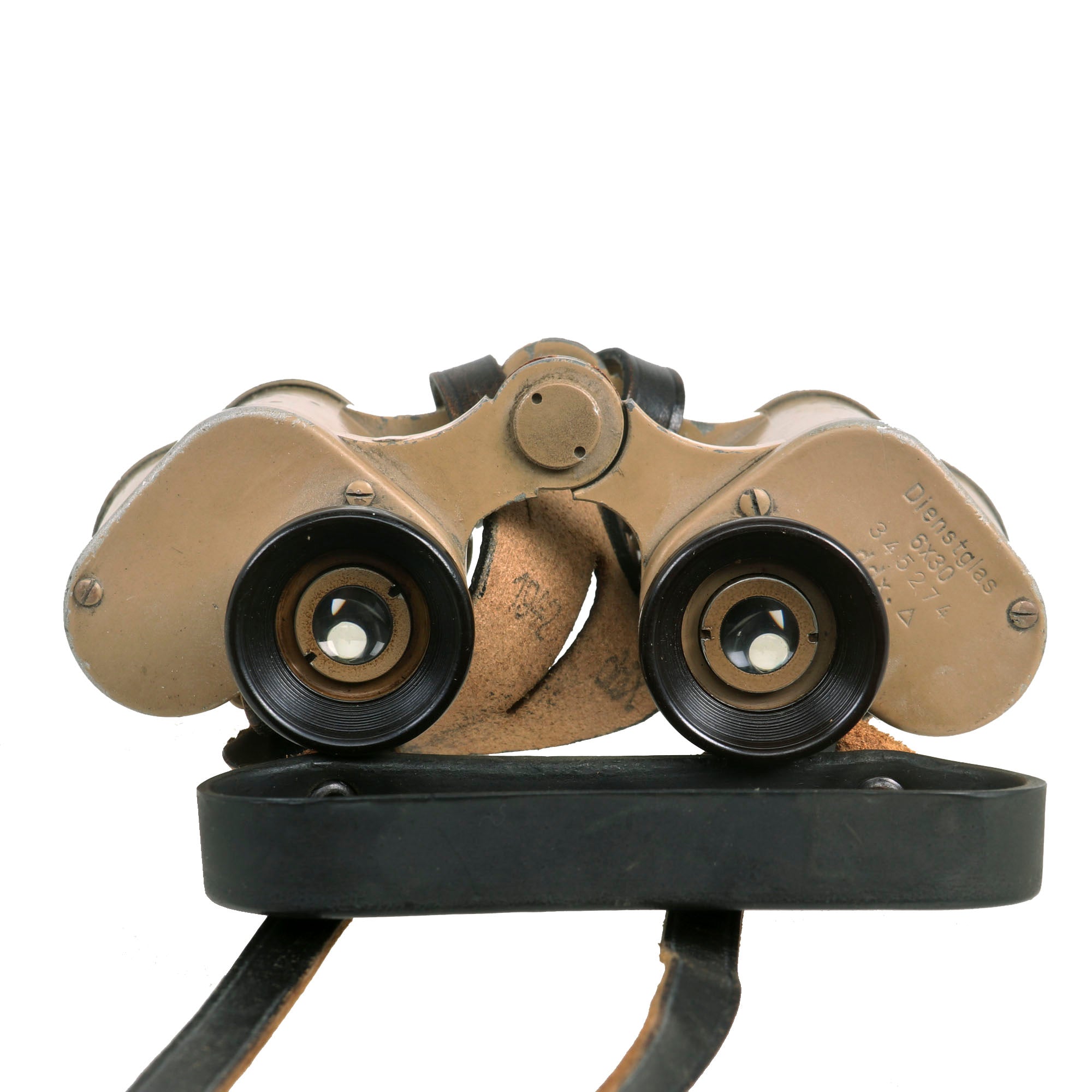 Original Item: Only One Available. The 6x30 Dienstglas (Service Glass) was one of the most used German issued binoculars of WWII. This example is fully functional, with mostly clear optics, and working adjustments. Unfortunately the rubber eyepiece cover is torn on one side from the leather neck strap. It is nicely marked as follows on the base of the right barrel: