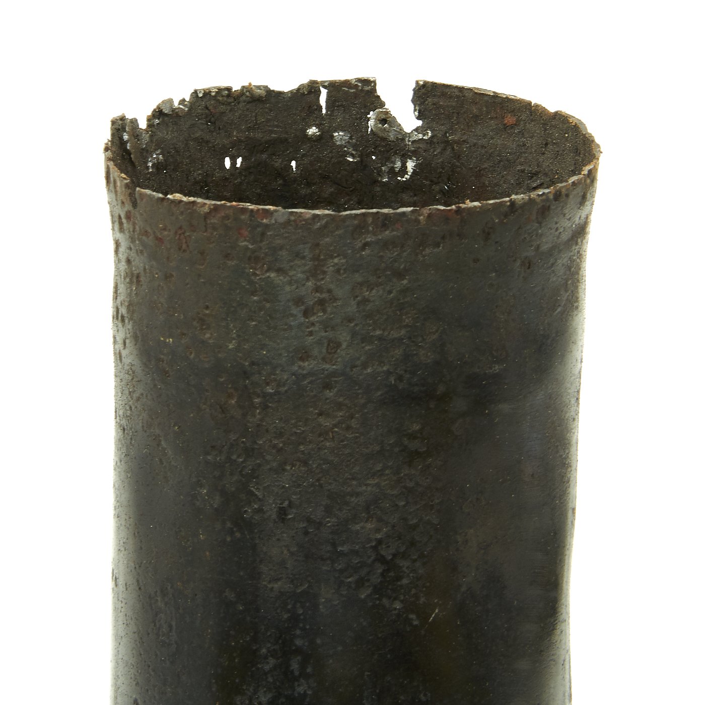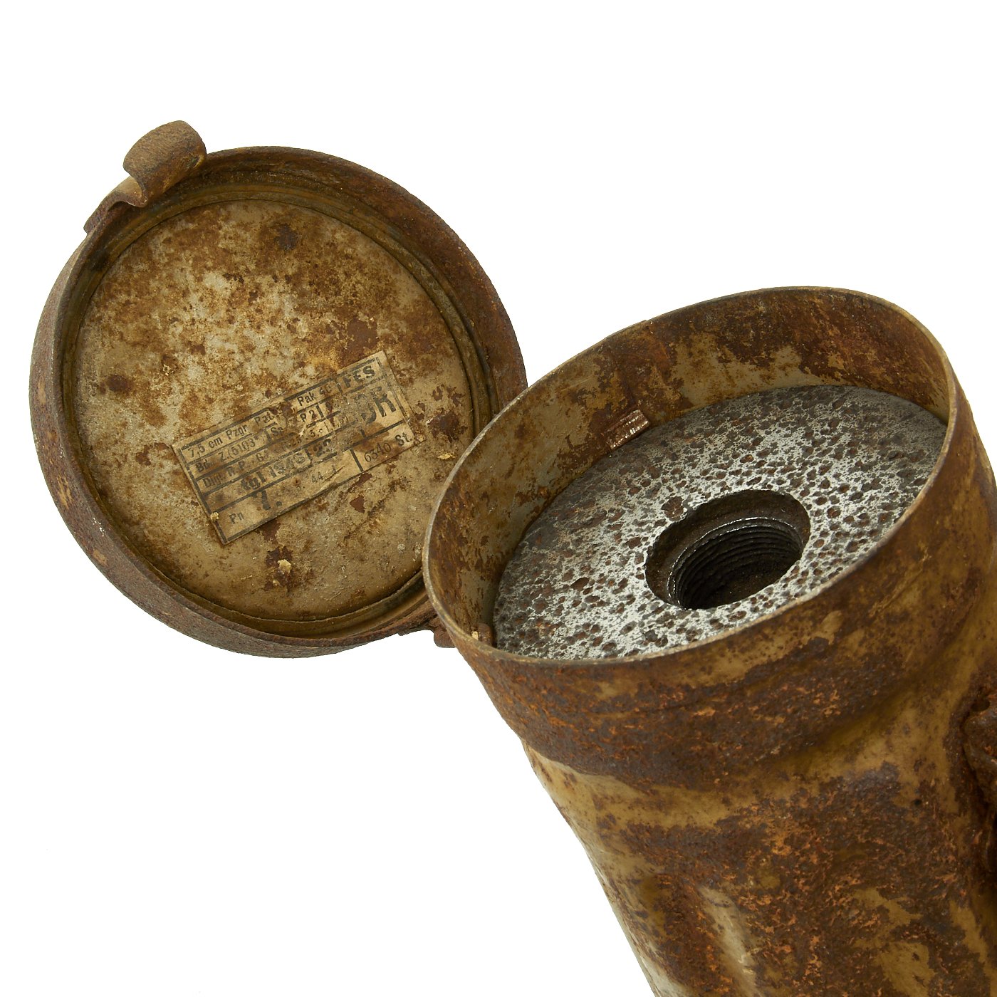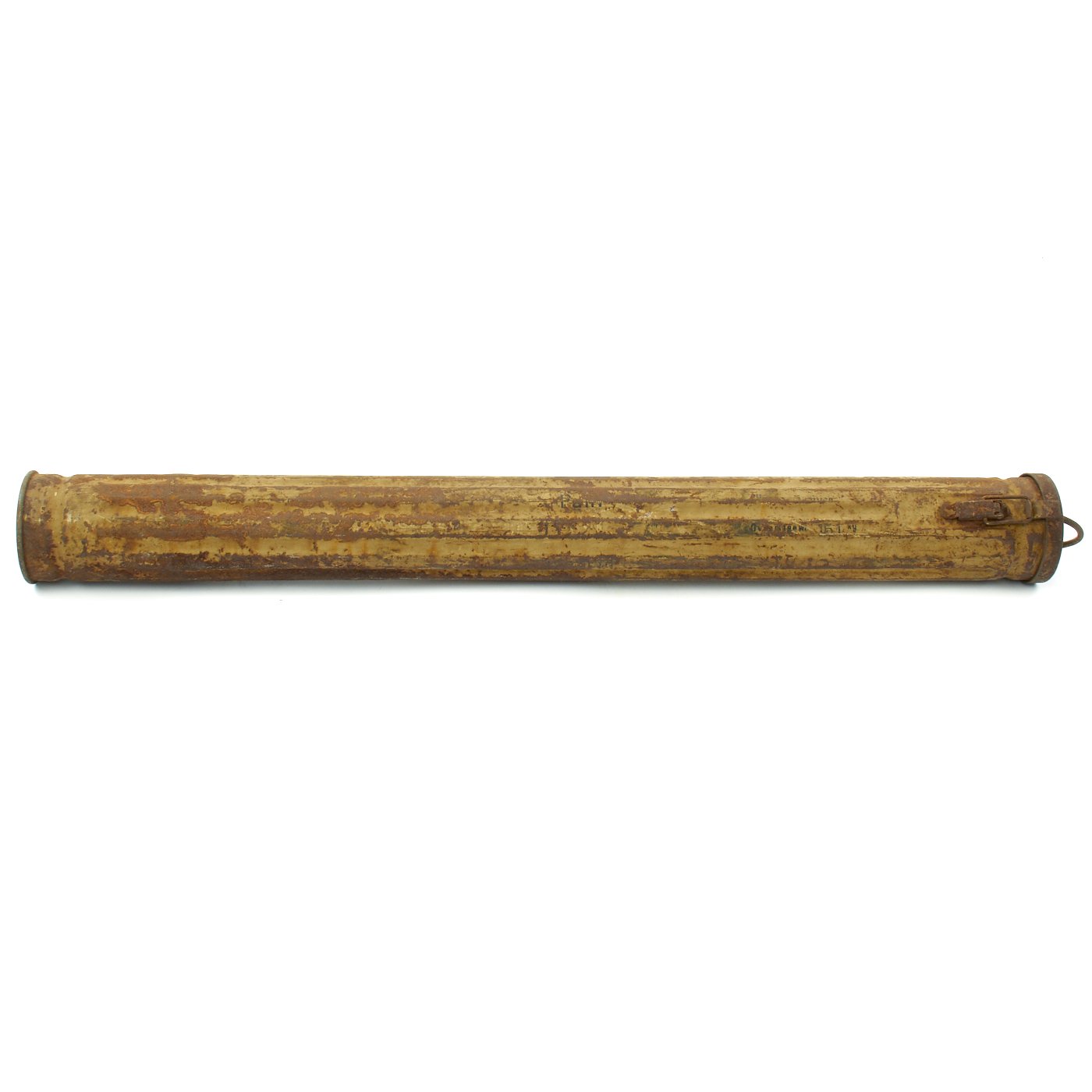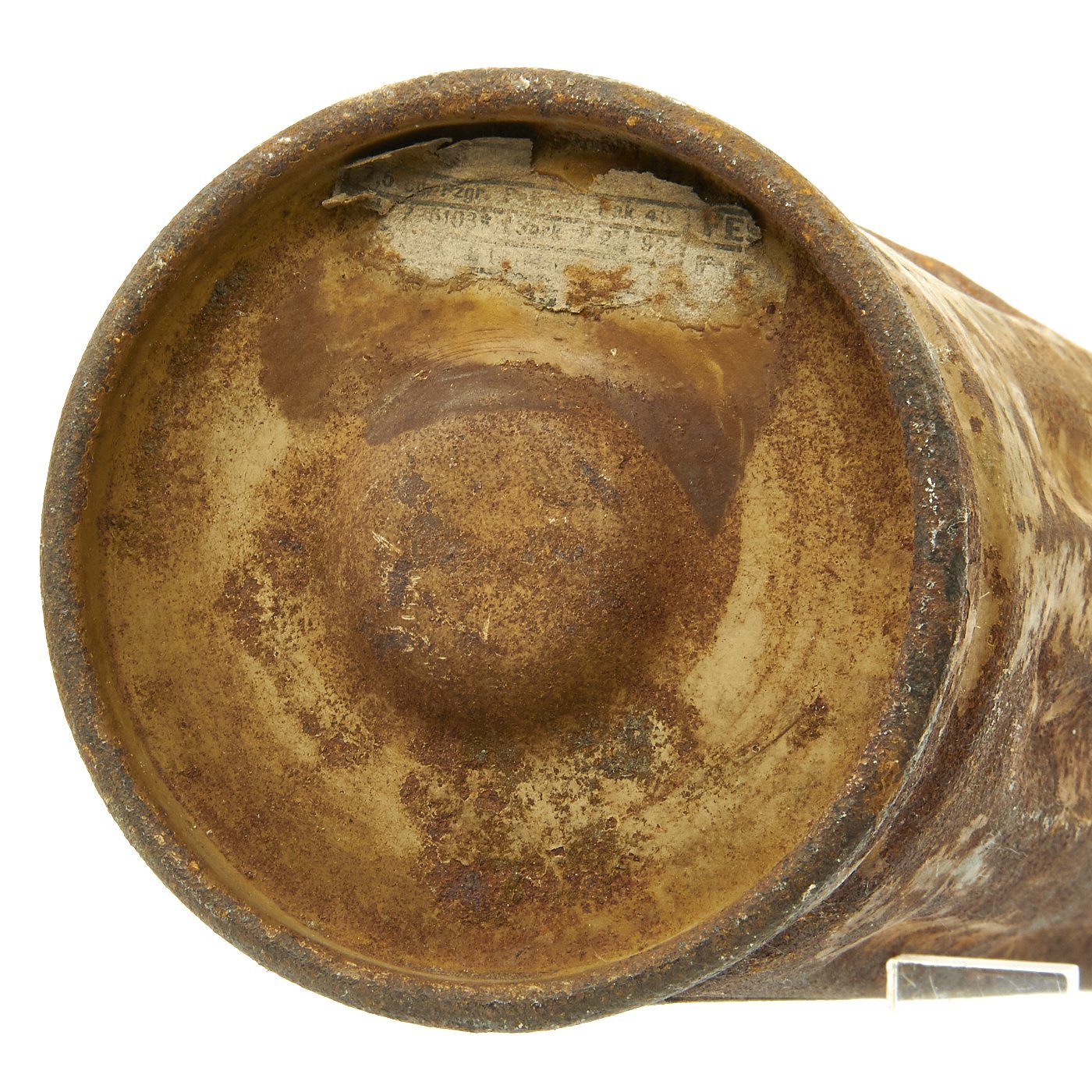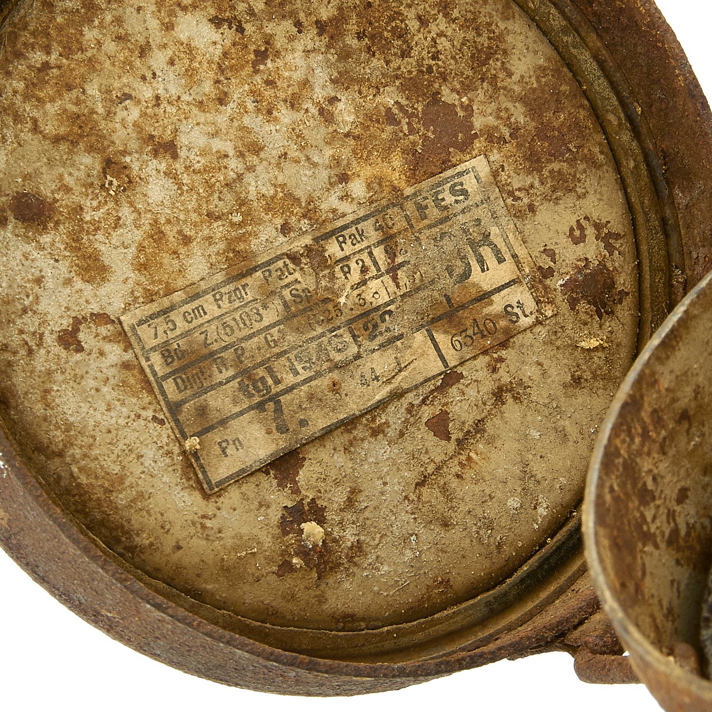 This shell without projectile is offered in good condition. Also included in an original shell transit tube which has original dunkelgelb ordnance paint and is nicely marked 7.5 cm Pak 40 with 1943 dated. Inside the cap is a genuine paper data label dated 1943.