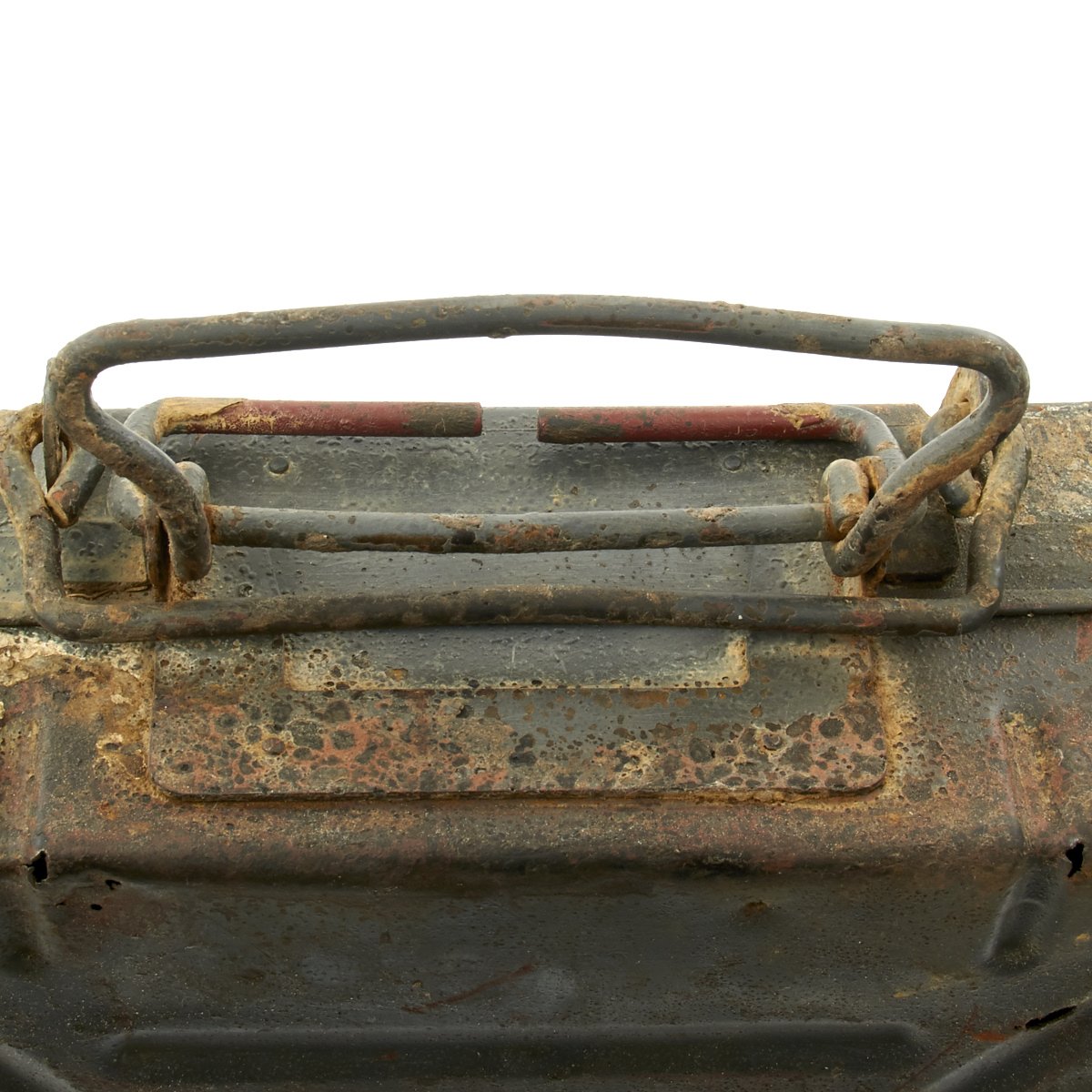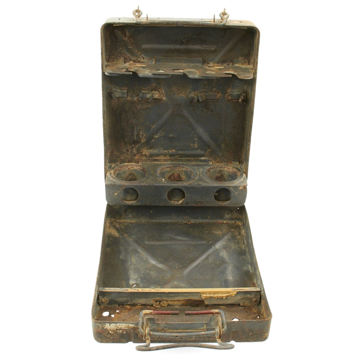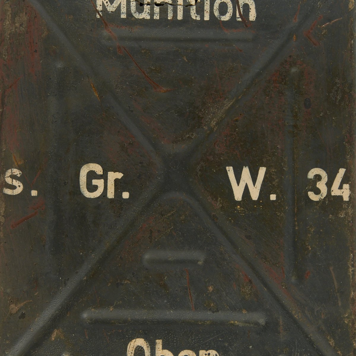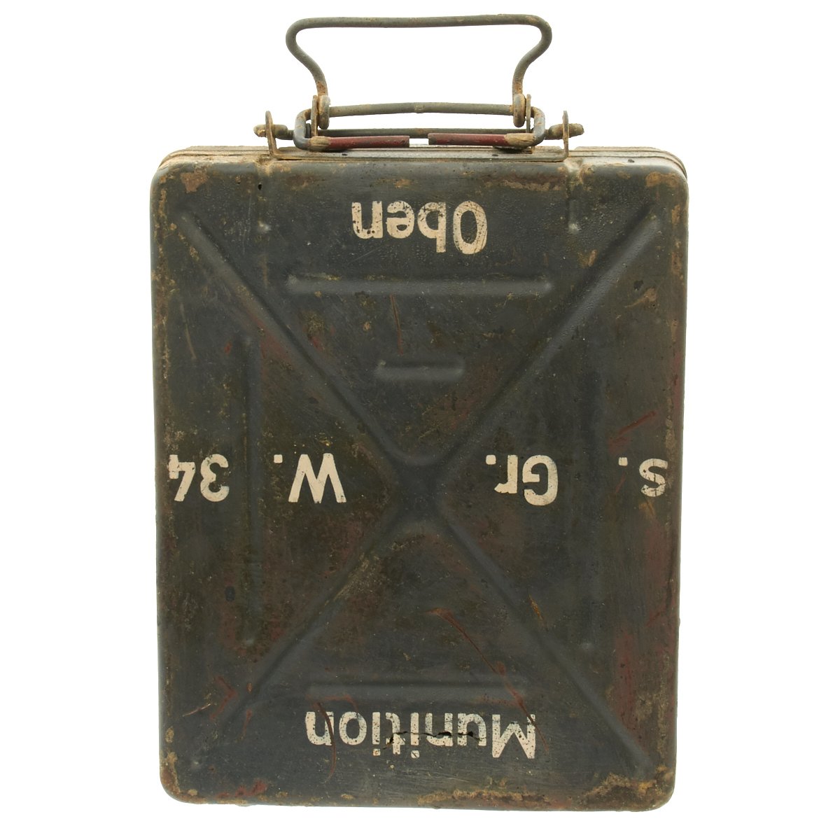Original Item: Very Few Available. Fantastic totally genuine 8cm mortar round steel transportation case for the 8cm Wgr.34 rounds. These rounds were fired by the 8cm Gr.W.34 and were streamlined high explosive anti-personnel fragmentation round. Box measures 11" x 14" x 4".