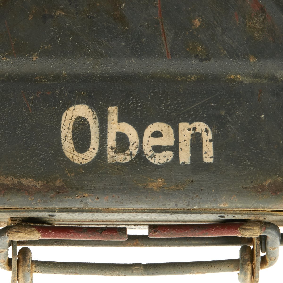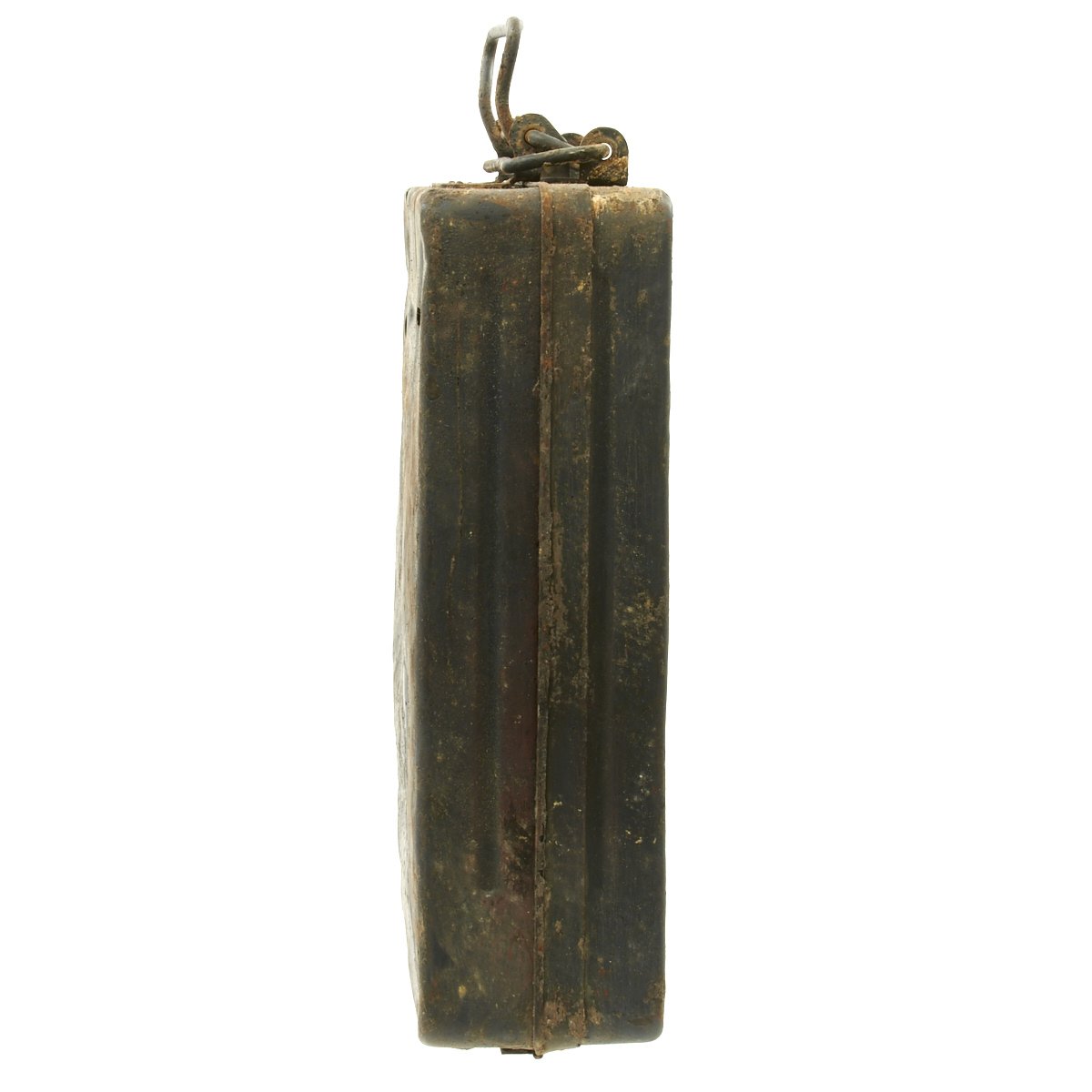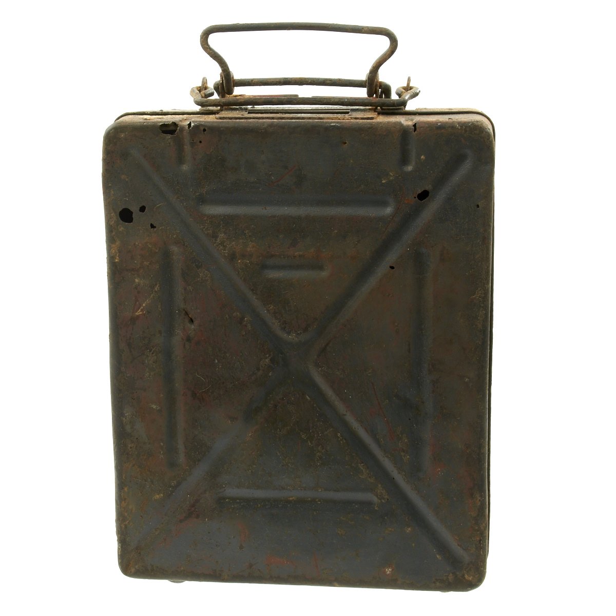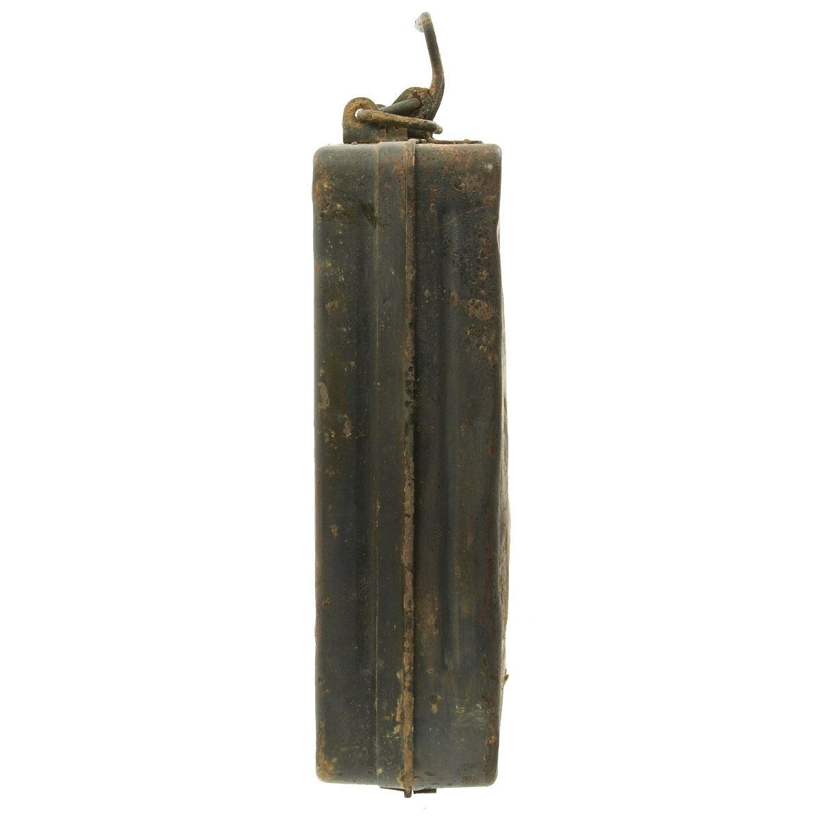 Original Item: Very Few Available. Fantastic totally genuine 8cm mortar round steel transportation case for the 8cm Wgr.34 rounds. These rounds were fired by the 8cm Gr.W.34 and were streamlined high explosive anti-personnel fragmentation round. Box measures 11" x 14" x 4".