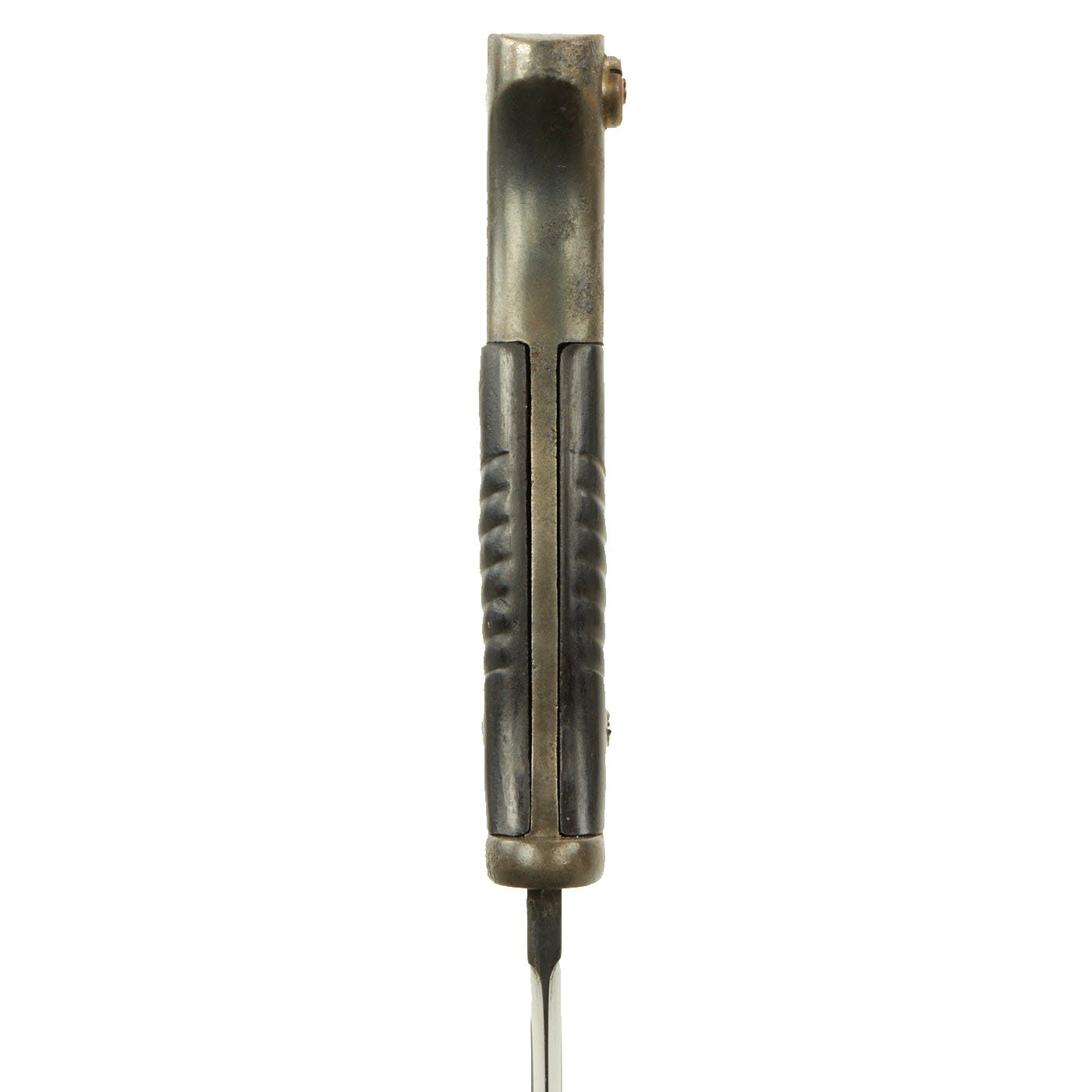 Condition is very good, though there are definitely areas of oxidation from exposure. This looks like a bayonet that saw little use, staying in the scabbard, however it may have been stored outside for some time, as there is oxidation to the exterior. The grips are intact, and the bayonet has a functional locking button.