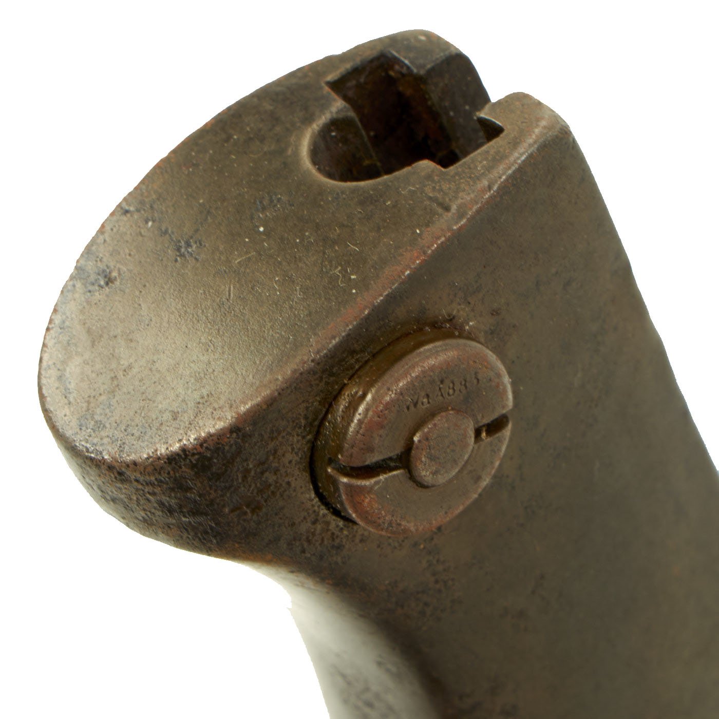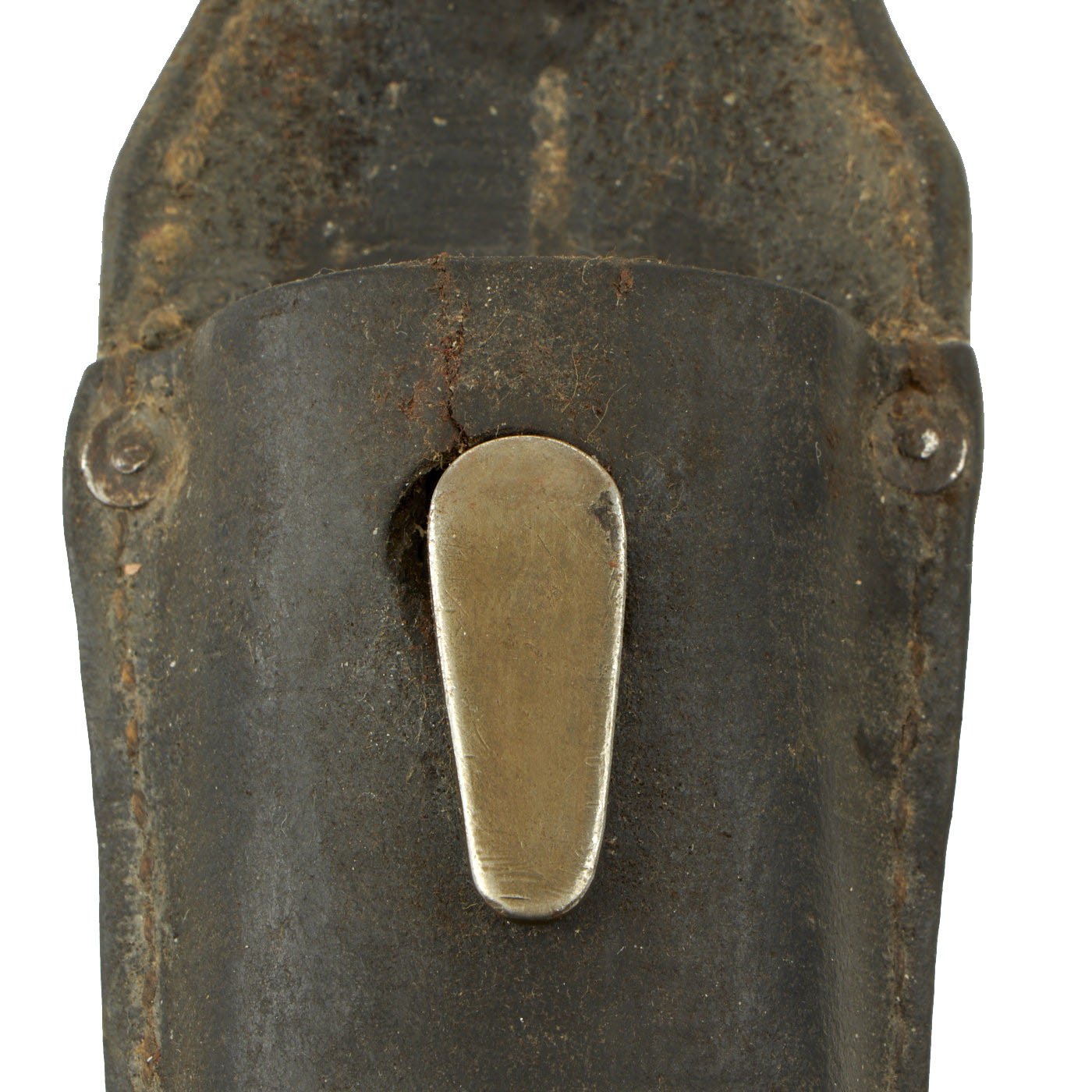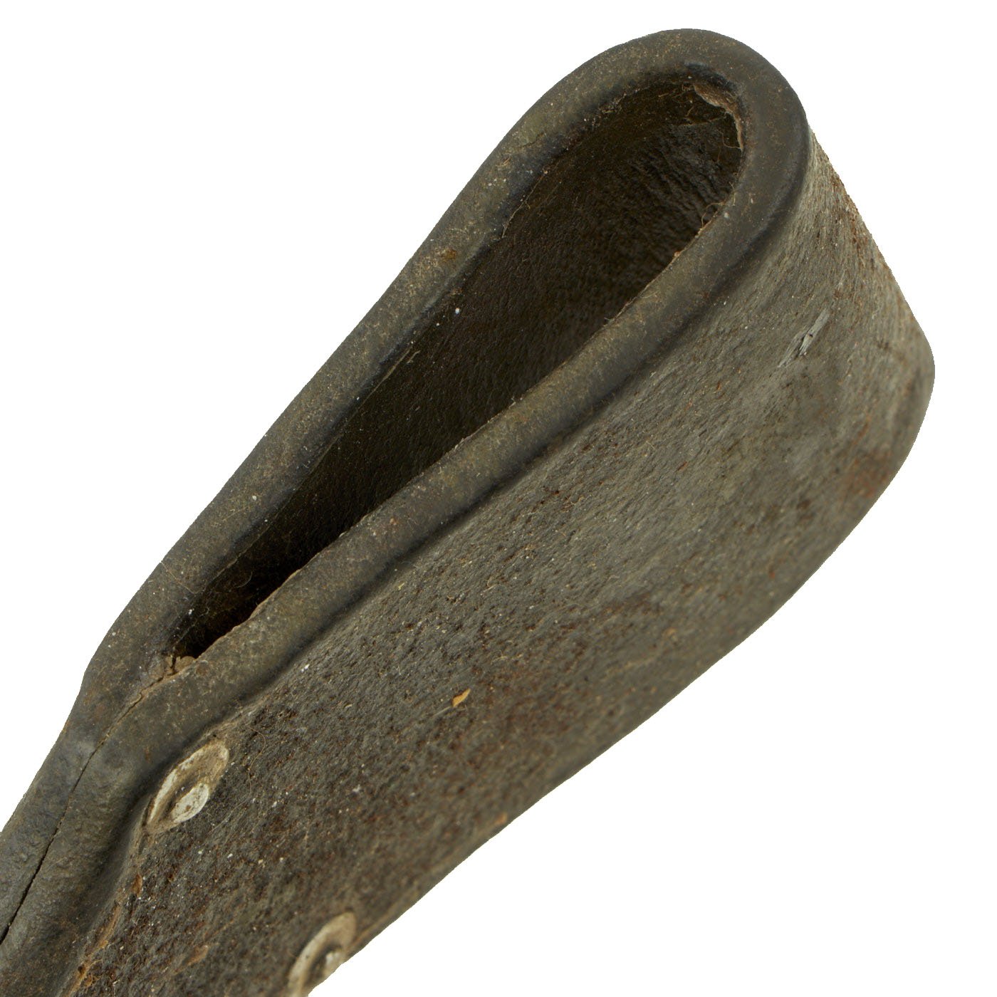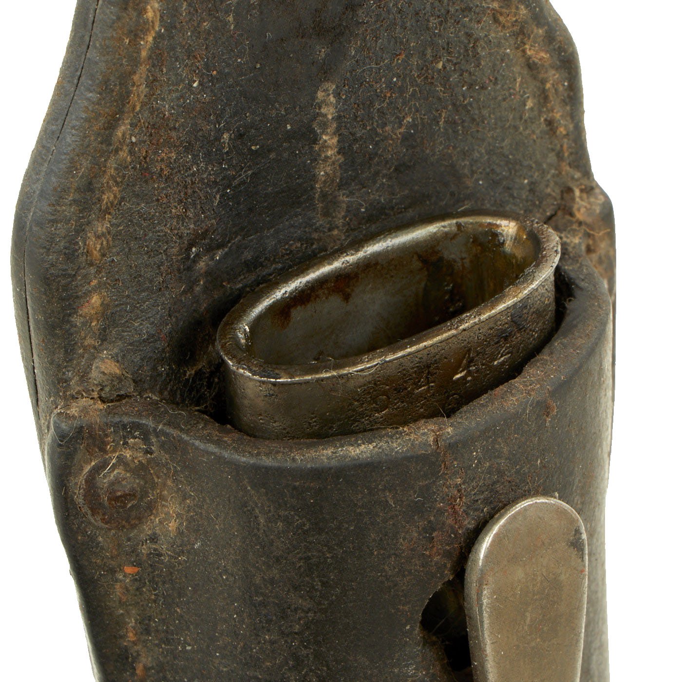 Bayonet and scabbard come complete with an original leather frog, which fits the scabbard nicely. The frog definitely shows age and wear, with most of the original finish worn. It still has intact stitching, with steel rivets on the bottom, and aluminum on the top. There is a fainted maker marking on the back, however all we can make out definitively is the date, 1937.