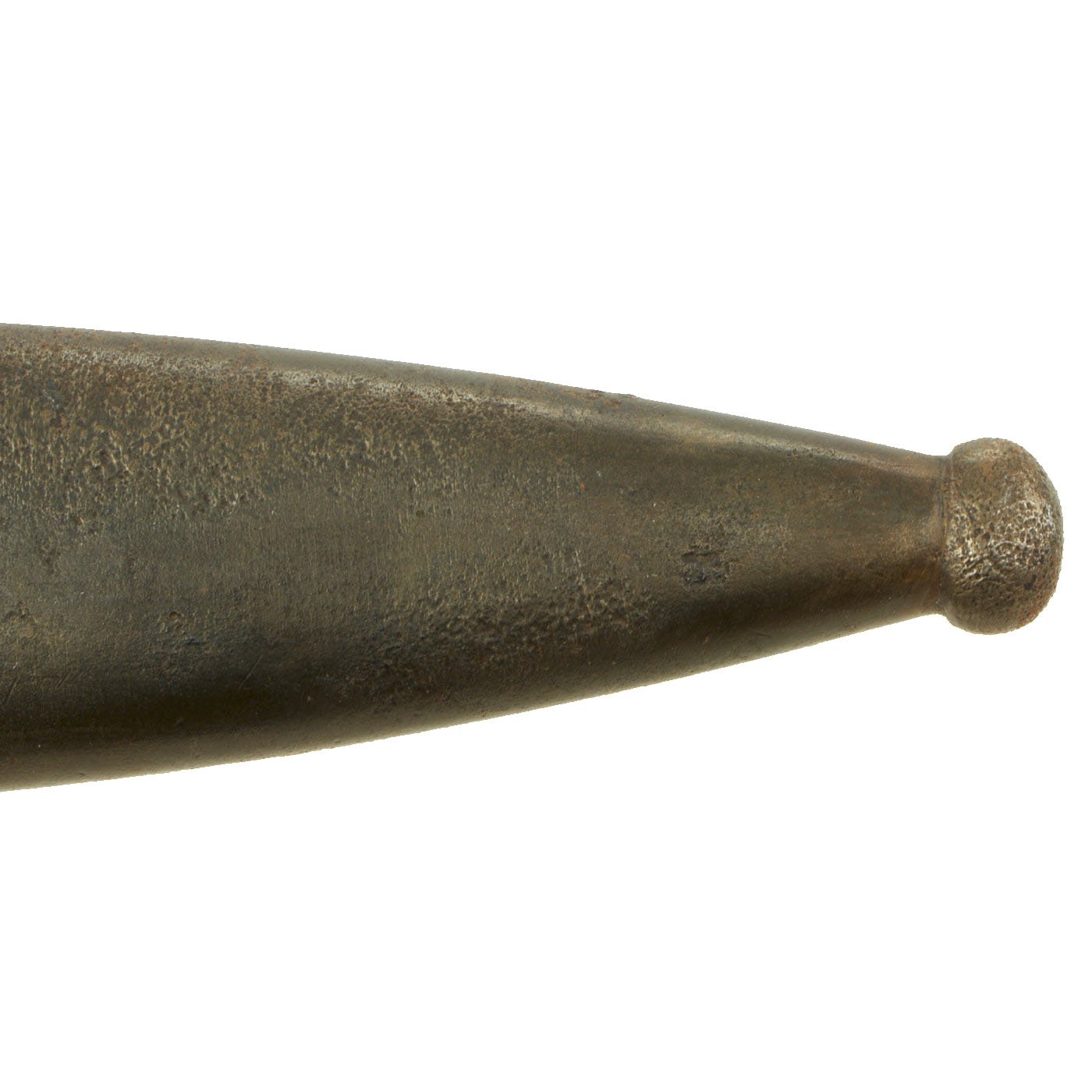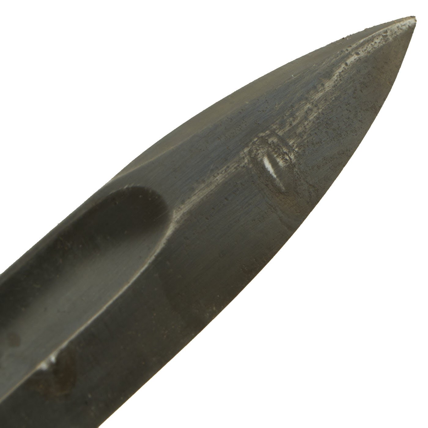 The blade has the original factory "sharpening", which did not really make the blade sharp: that was up to the soldier. There are no real signs of use on the blade, wear from cleaning and the scabbard runners. The black bakelite grip scales are in very good condition, with no chips, and just some light scratches and dents. The handle shows surface oxidation, however the proof marks are still visible. The scabbard has lost finish, and has a dent on the rear side. It also has a lot of oxidation and light surface pitting, especially on the back side, in contrast to the blade.
