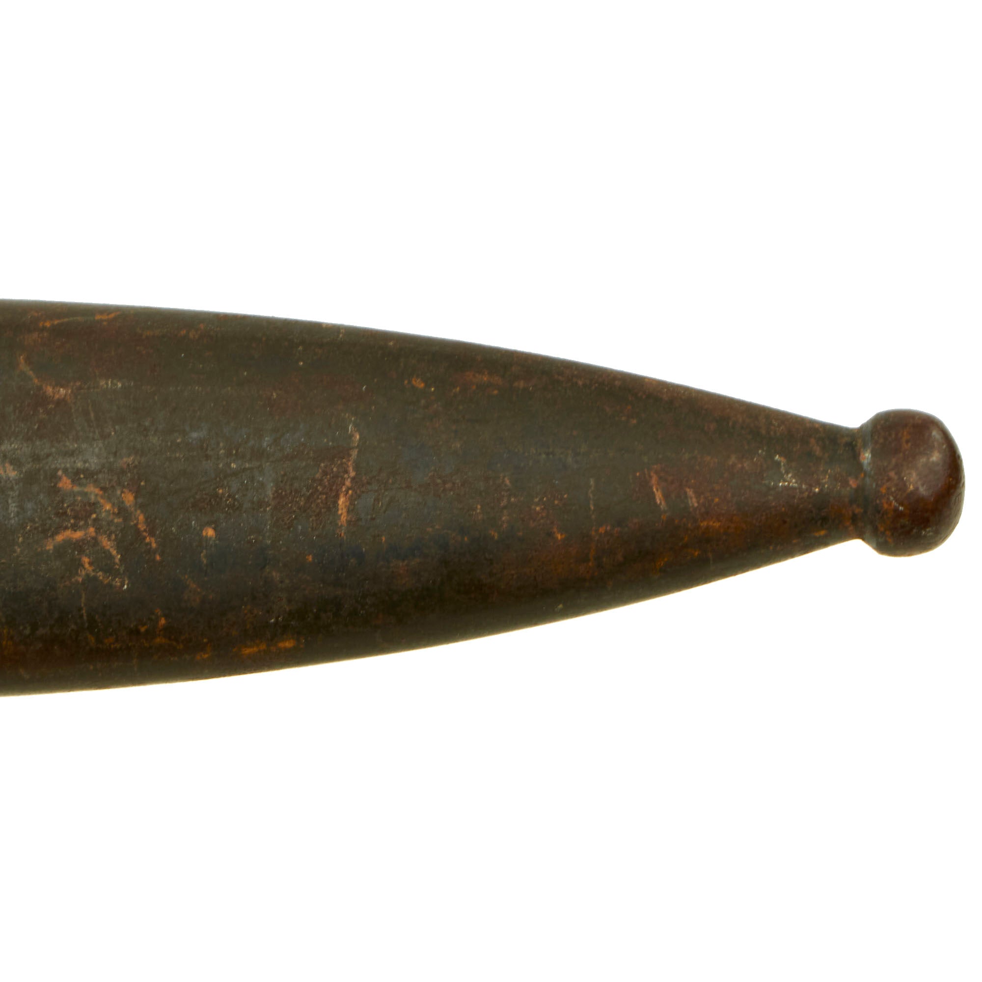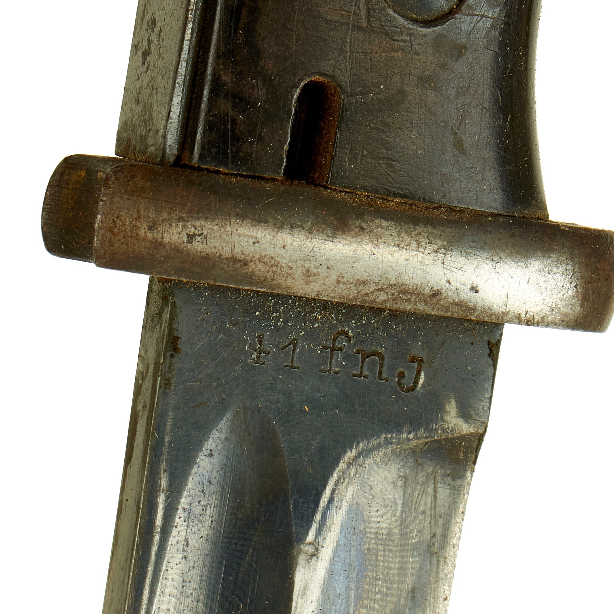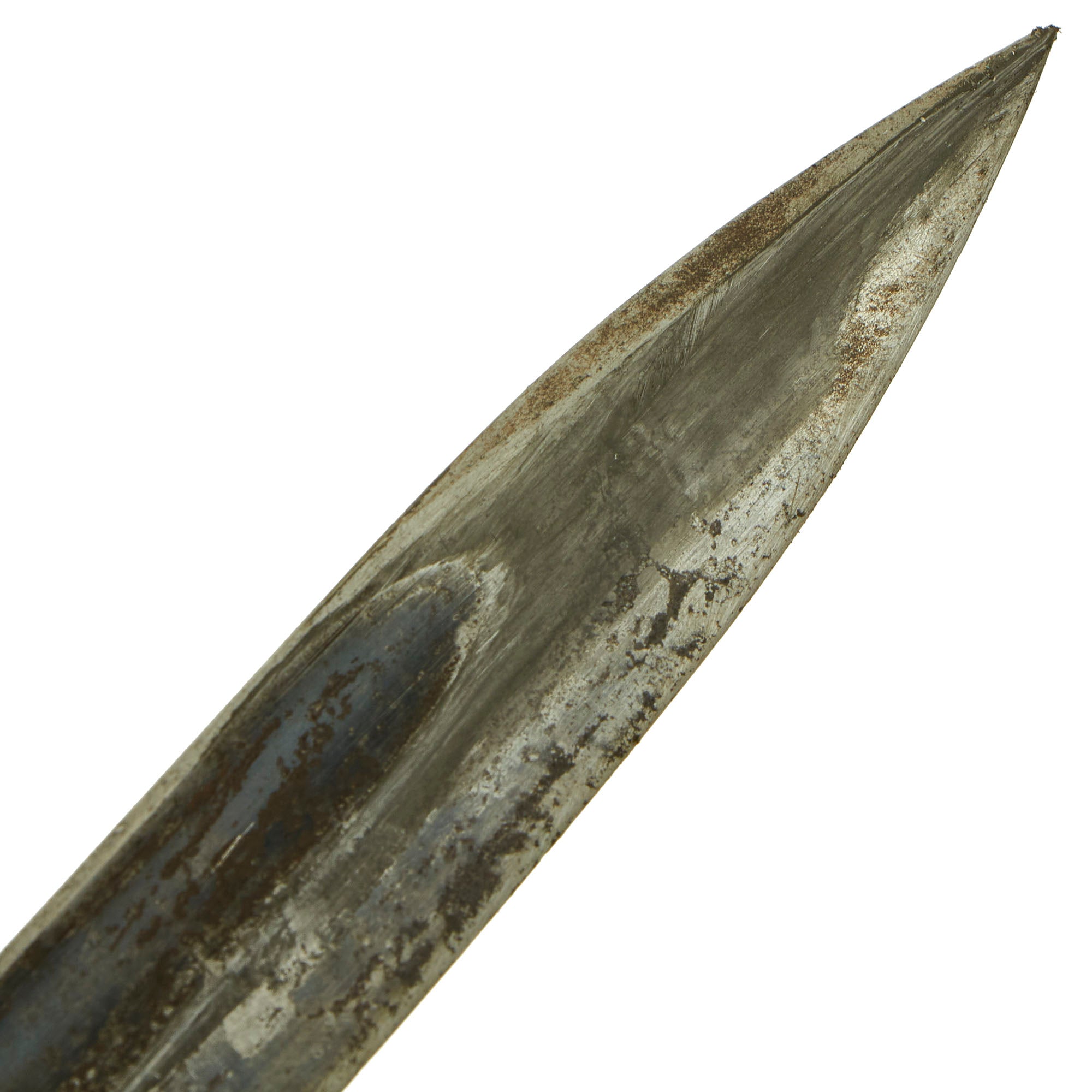 Condition is very good with lots of the original bluing on blade, with the bakelite grips intact and a working locking button. The blade on this example has been sharpened, so this is a bayonet that was actually used in service. The bakelite grips show minor wear from service, with no major cracks, chips, or dents. The bayonet and scabbard do have some spots of light surface rust from use and exposure in the field. There are a few on the blade itself, but they are very minor.