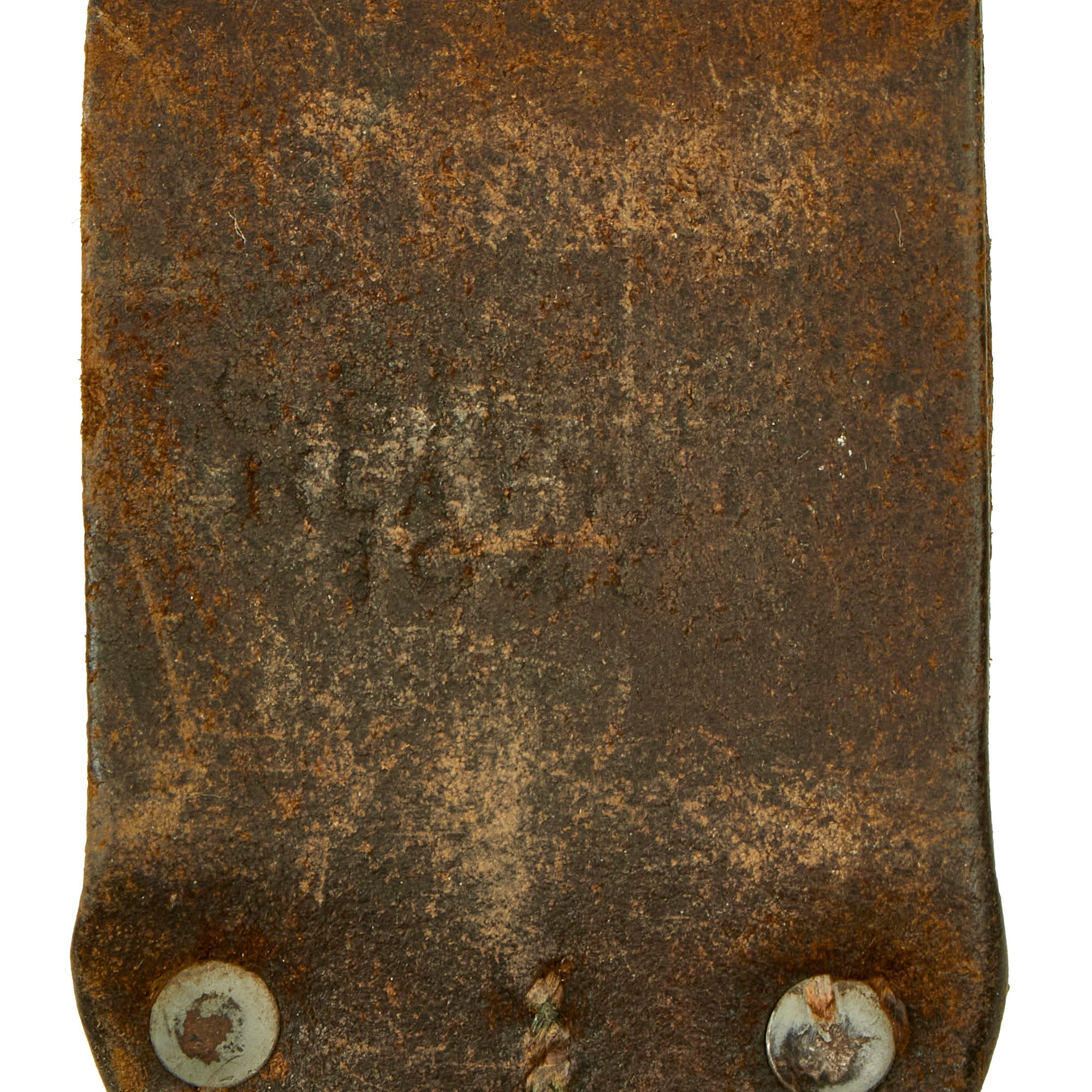 Bayonet and scabbard come complete with an original black leather frog, which fits the scabbard nicely. It is marker marked and dated on the back G.SINGER / KLATTAU / 1940, and is an early pattern bayonet frog, though the securing strap was cut off at some point. It is in good service used condition, with intact aluminum rivets and stitching, showing wear to the finish and leather from field use.