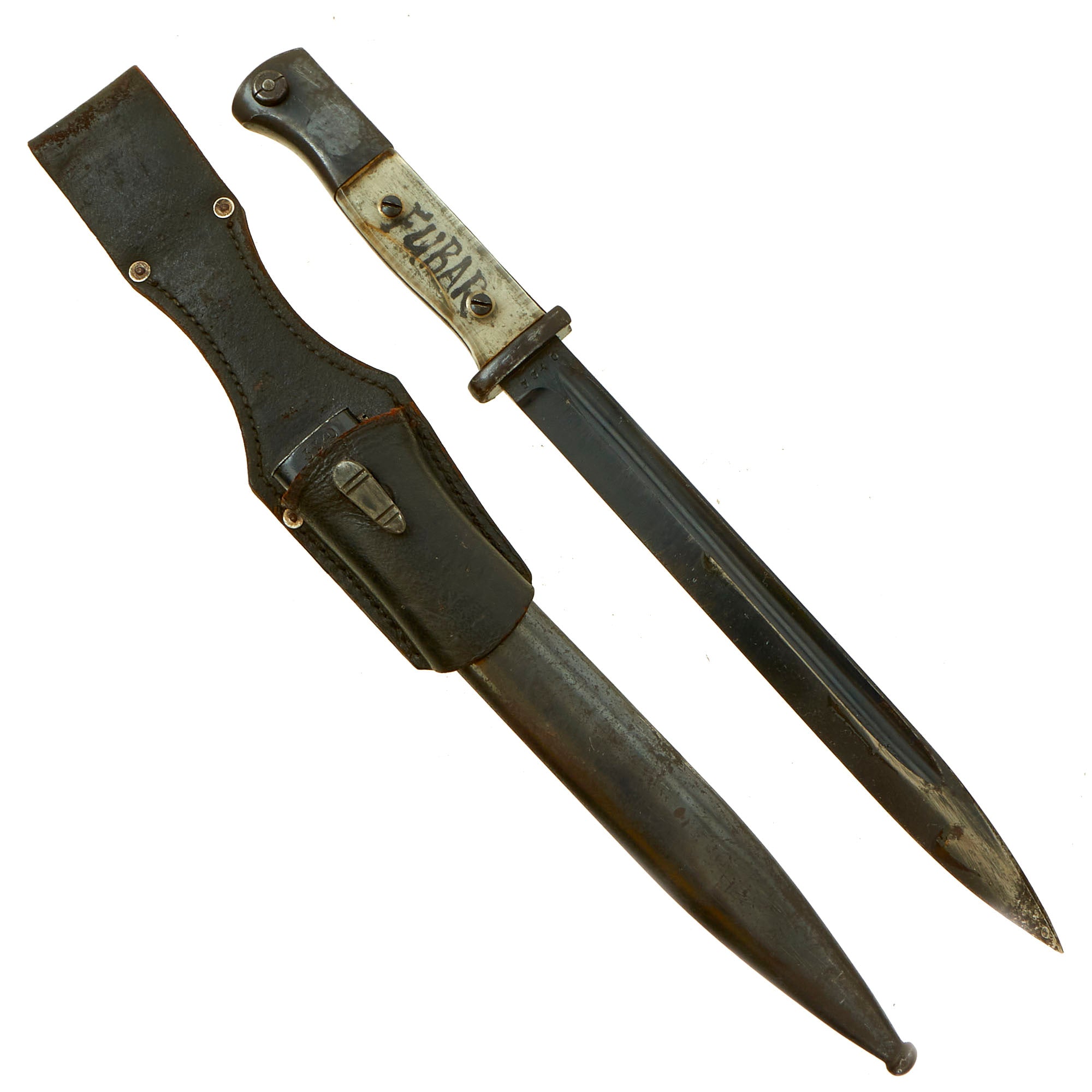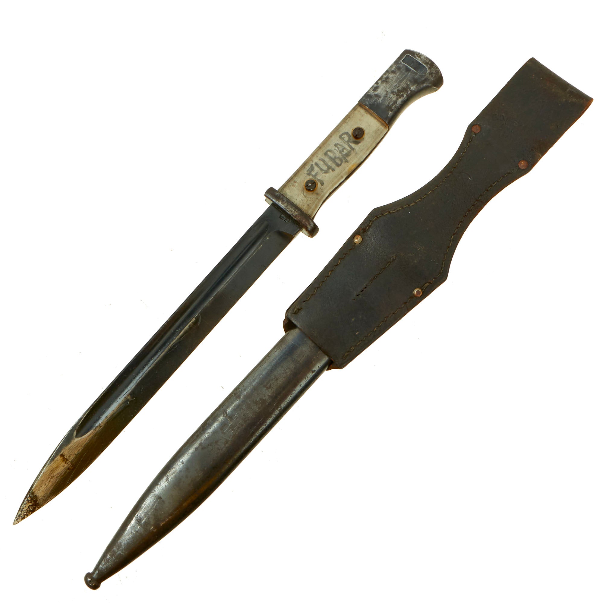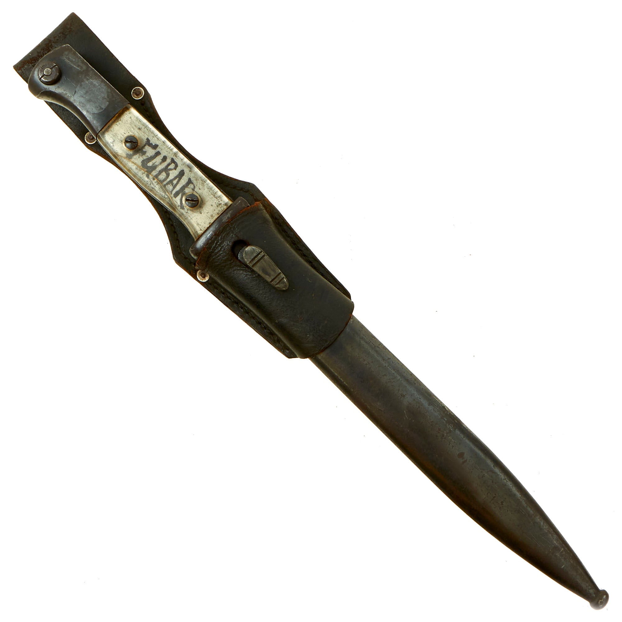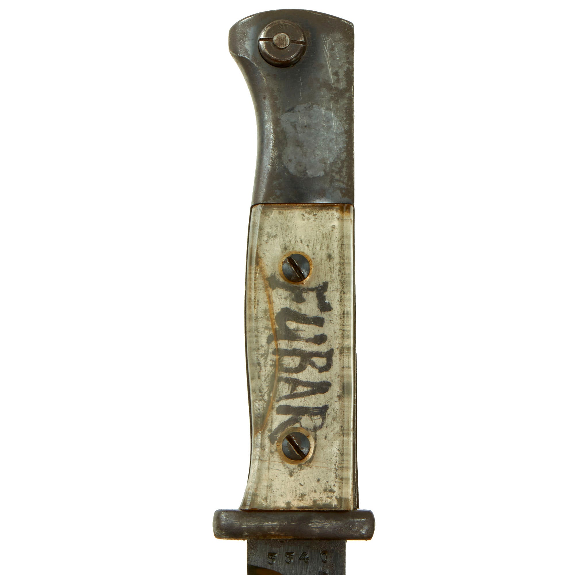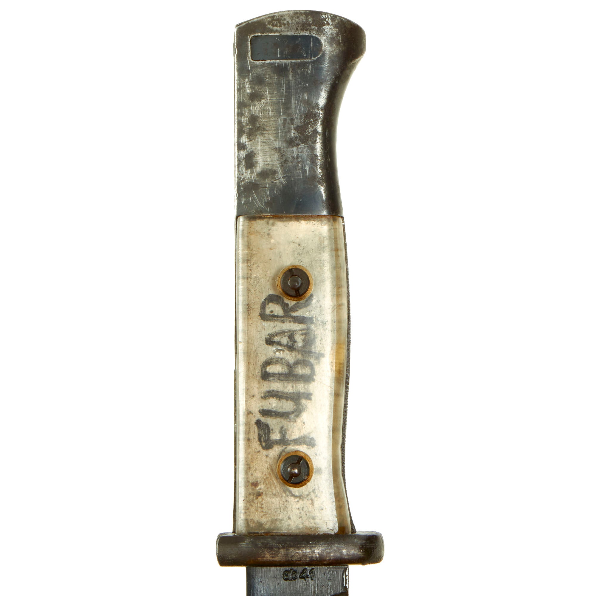 Grip material: Clear Plexiglass with “FUBAR” written in black on the tang. A definite sign that this was altered by a US G.I.