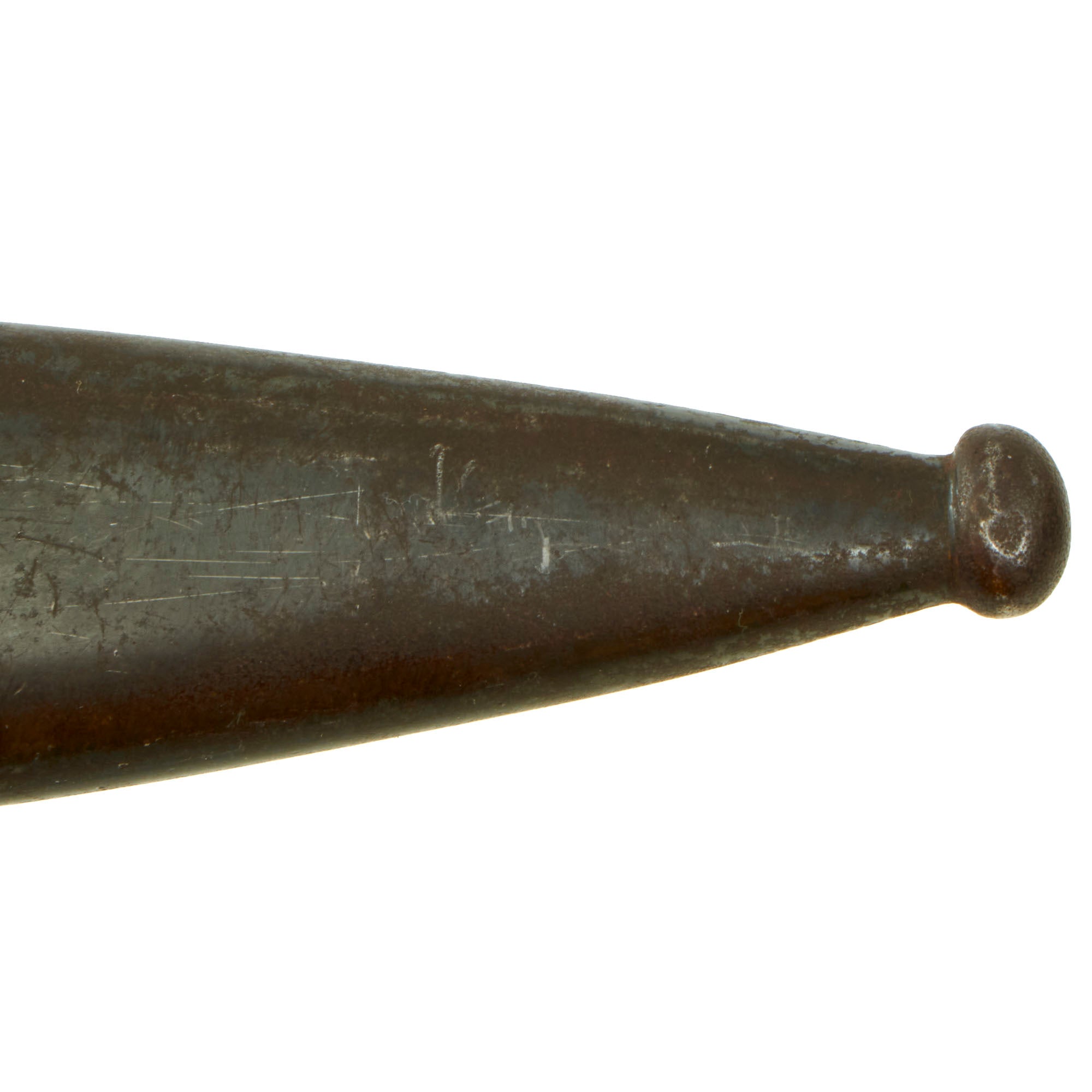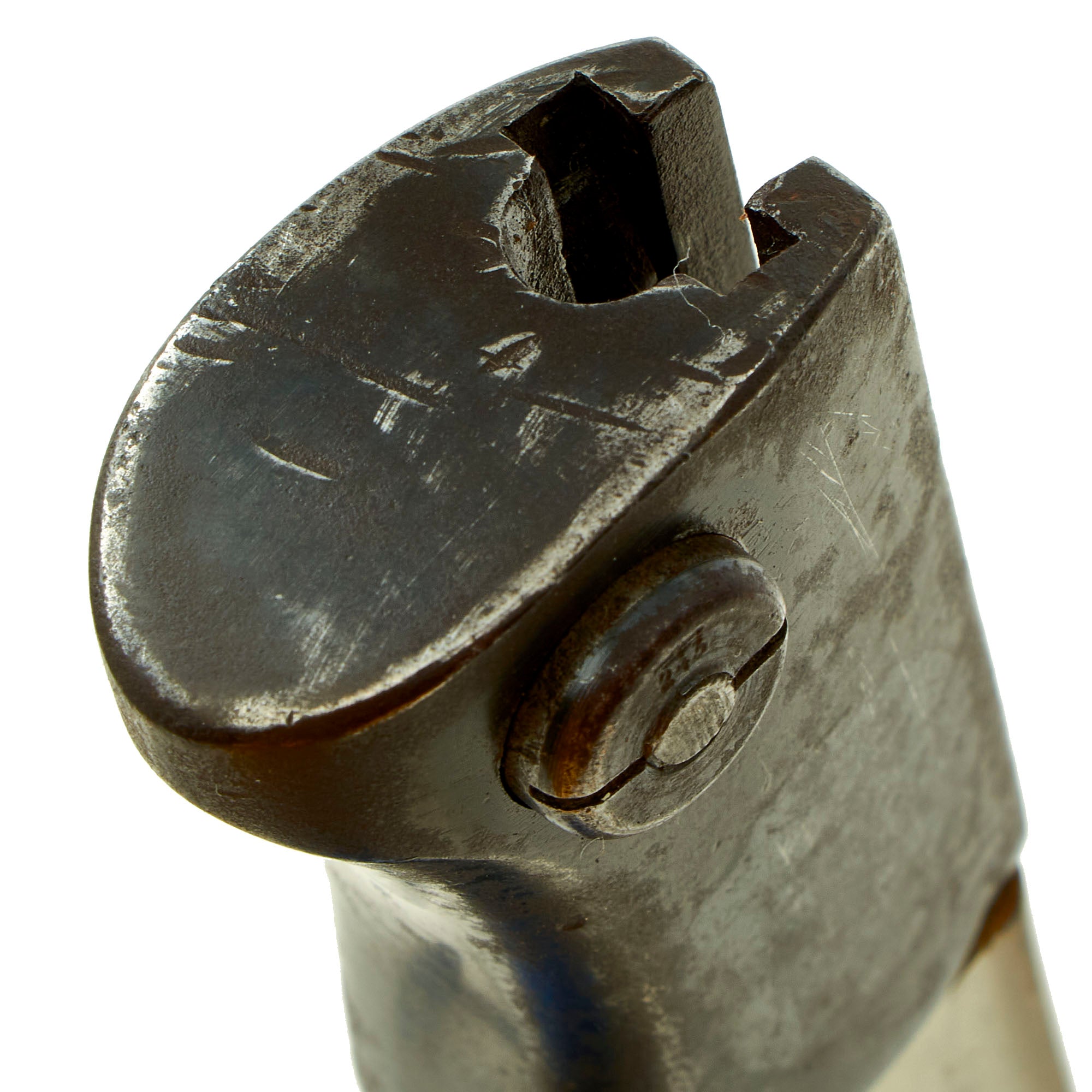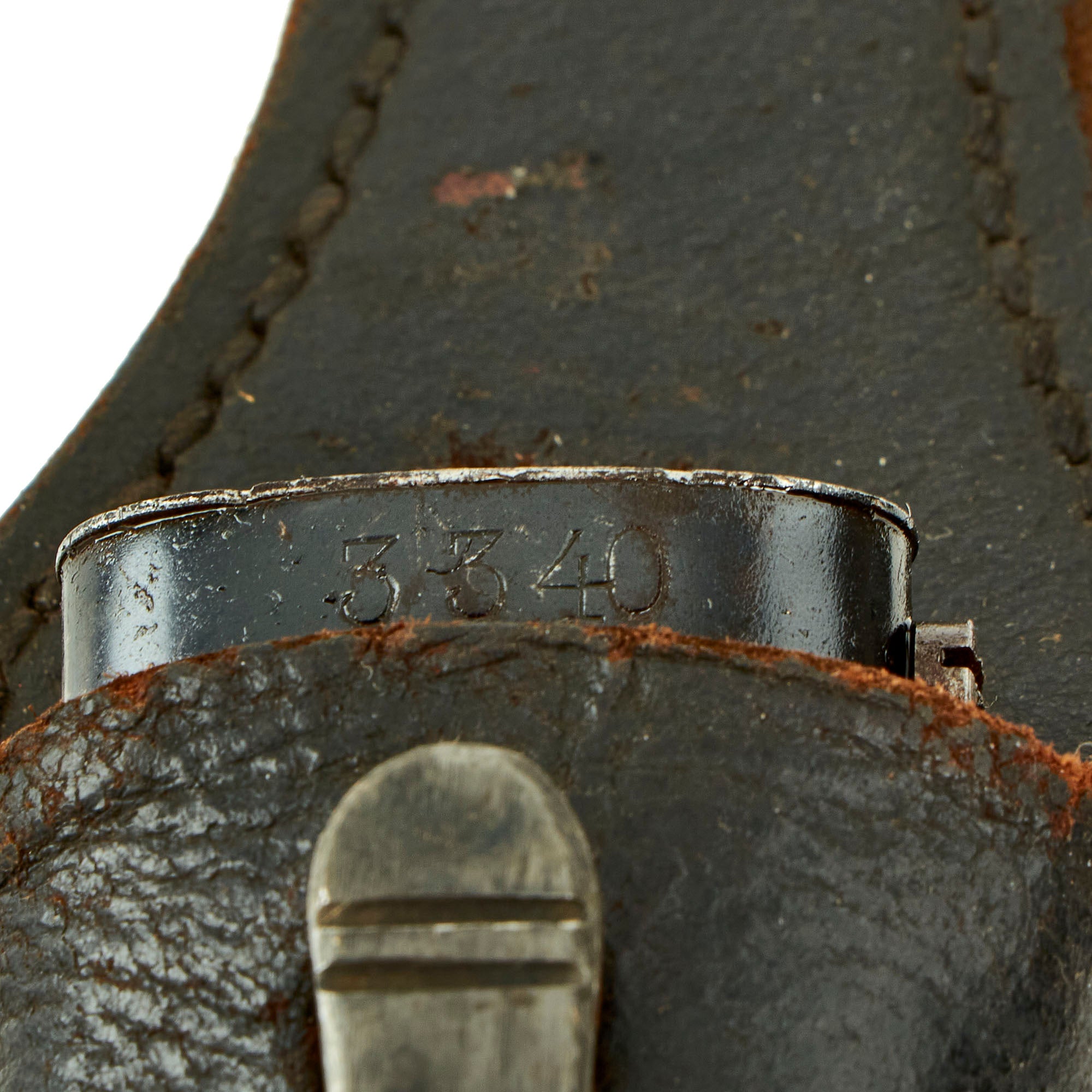 The scabbard and blade bear matching serial numbers 3340, and the pommel is Waffenamt marked. The blade ricasso is also marked with German three letter code ab over 41, which is also present on the scabbard. This indicates 1941 manufacture by Mundlos AG in Magdeburg-Nord. This company was a maker of sewing-machines in peacetime, but in 1941 was pressed into service to make 98K bayonets and mortar bodies.