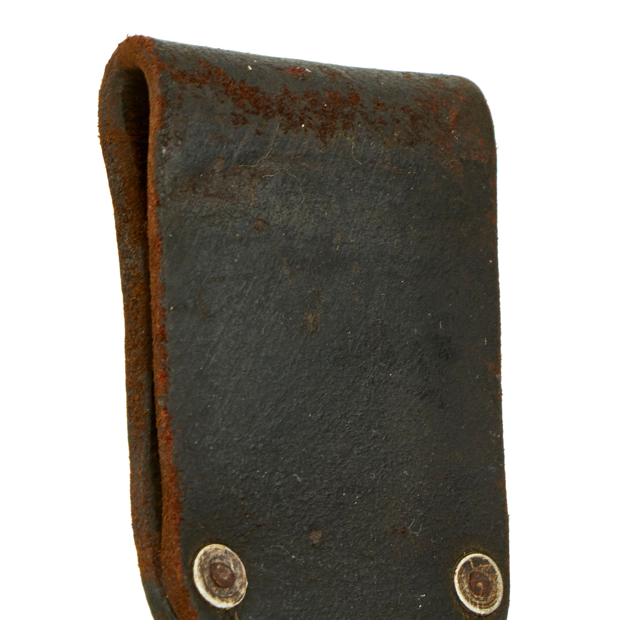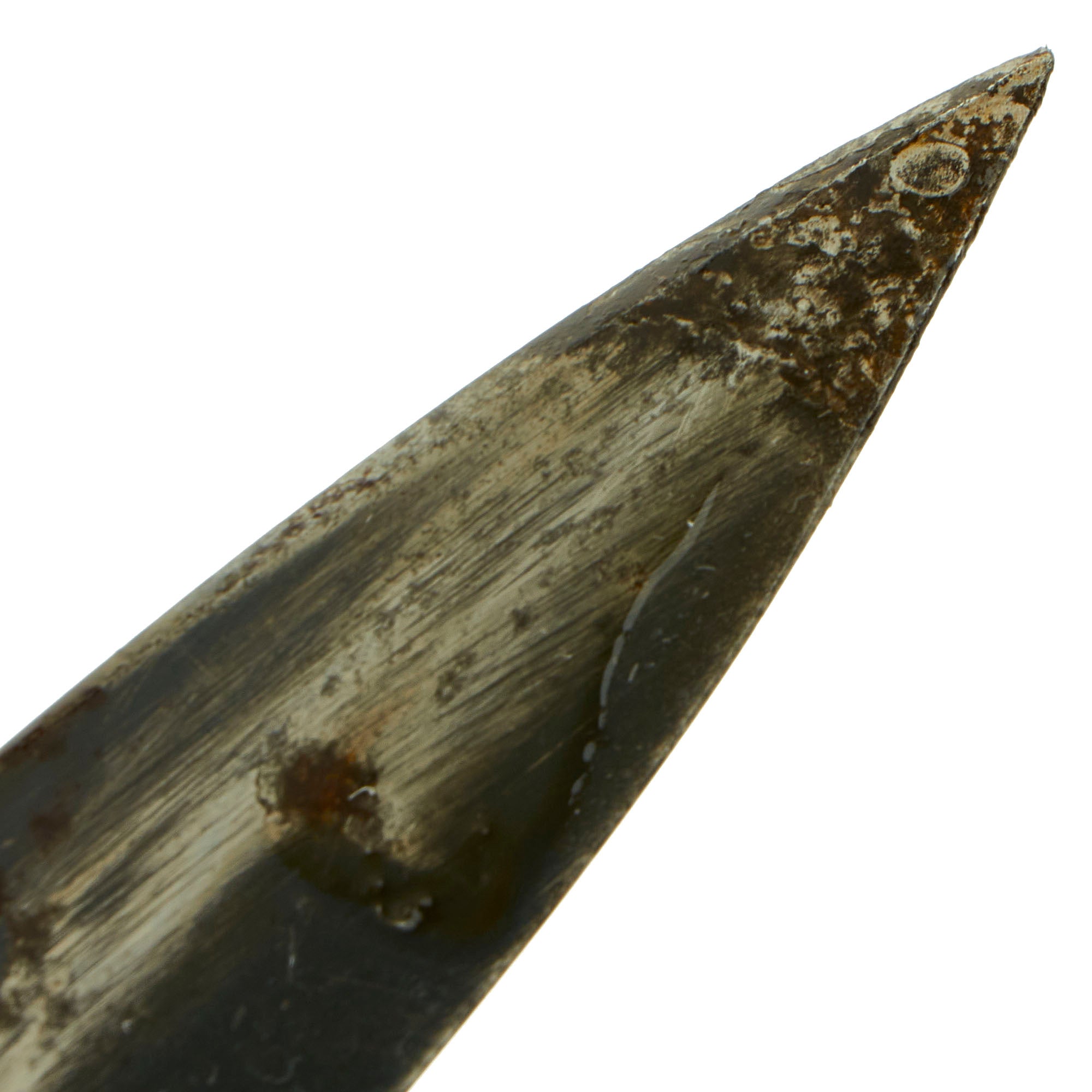 The total length of the K98 bayonet was 15.2 inches, far shorter than the 20 inch long GEW98 bayonet. The blade was also straighter in shape and the hand guard was omitted. The K98 bayonet was usually carried in a leather frog, or Seitengewehrtragetasche, on the left side on the equipment belt in combination with the shovel and its carrier. The maker marks on k98 bayonets where stamped onto the top of the blade. On the reverse the batch number and suffix were stamped.