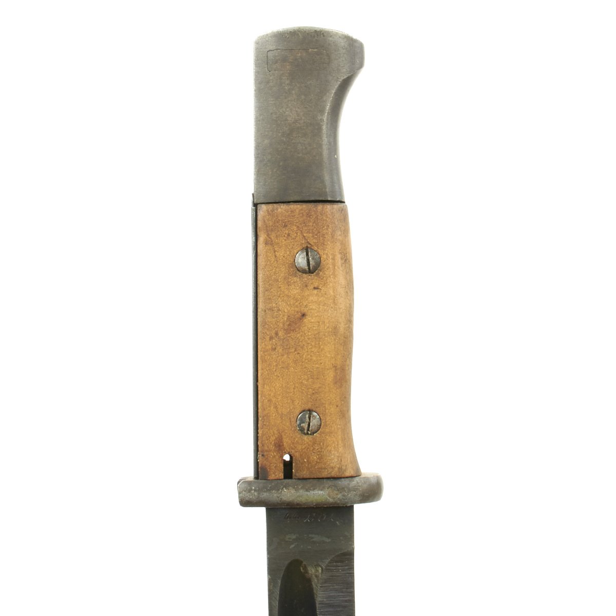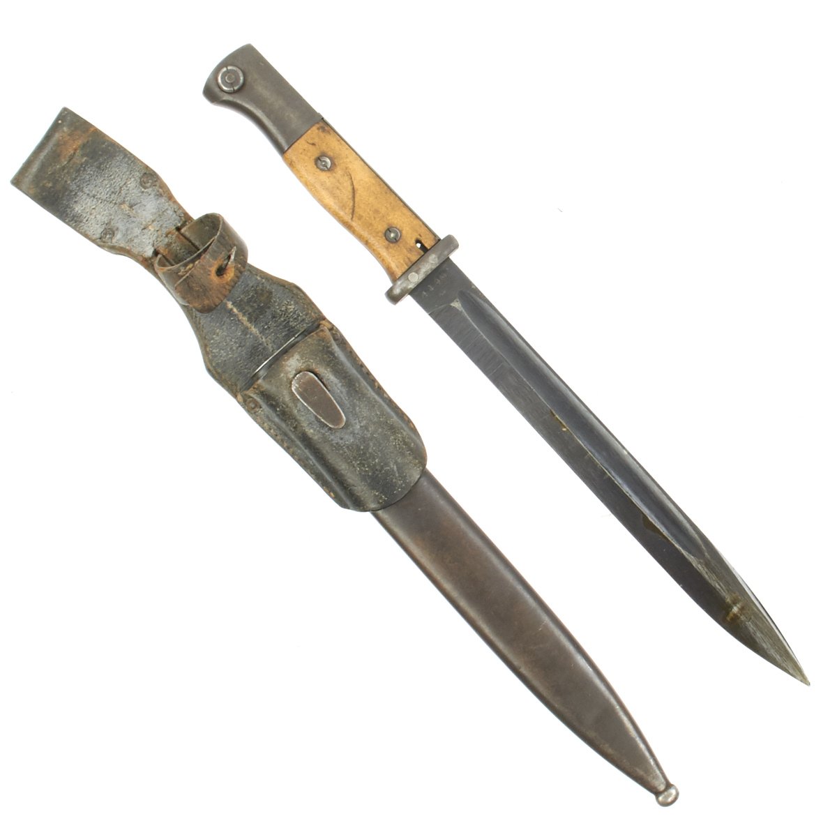 The total length of the K98 bayonet was 15.2 inches, far shorter than the 20 inch long GEW98 bayonet. The blade was also straighter in shape and the hand guard was omitted. The K98 bayonet was carried in a leather frog, or Seitengewehrtragetasche, on the left side on the equipment belt in combination with the shovel and its carrier. The maker marks on k98 bayonets where stamped onto the top of the blade. On the reverse the batch number and suffix were stamped.