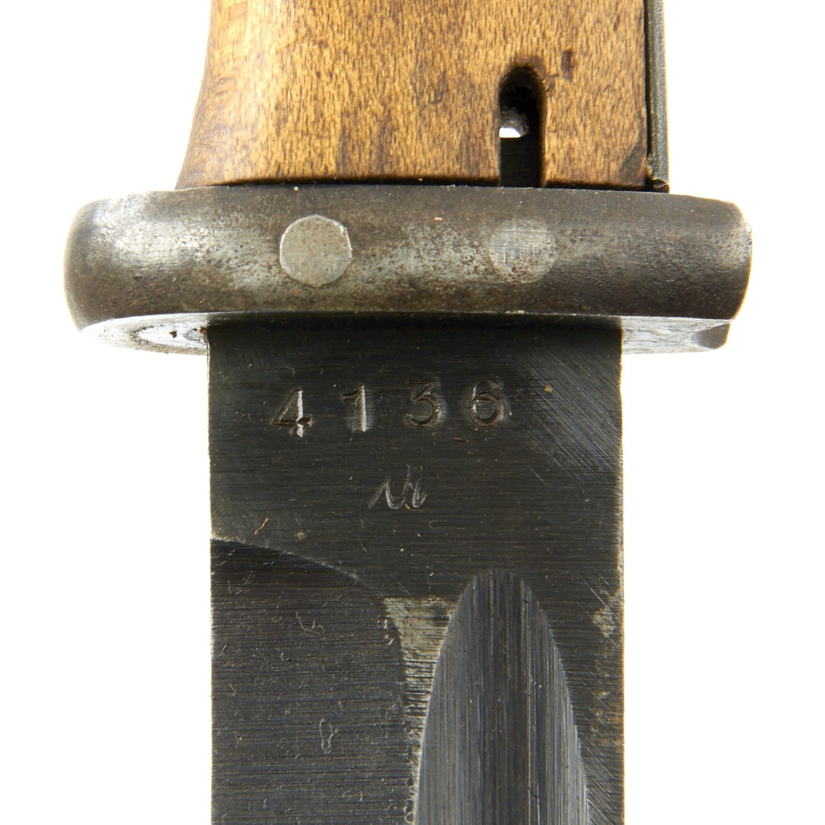Condition is excellent with original bluing on blade, wood grips intact and a working locking button. The blade has also never been sharpened, so it was most likely never issued in the field. The wood grip scales are in great shape, with no chips, and just some light scratches. The scabbard and blade bear matching serial numbers 4136 / u, and the pommel is Waffenamt marked. The blade ricasso is also marked with German three letter code 44 cvl, indicating 1944 manufacture by the well-known maker Weyersberg Kirschbaum & Co of Solingen, the legendary "City of Blades" in Eastern Germany.