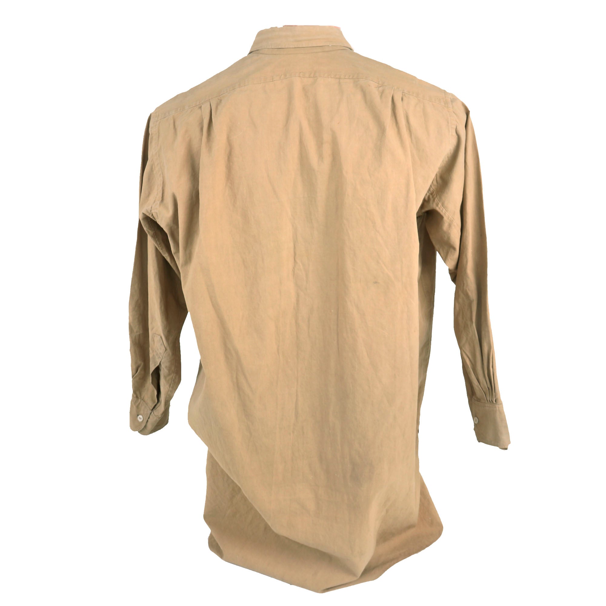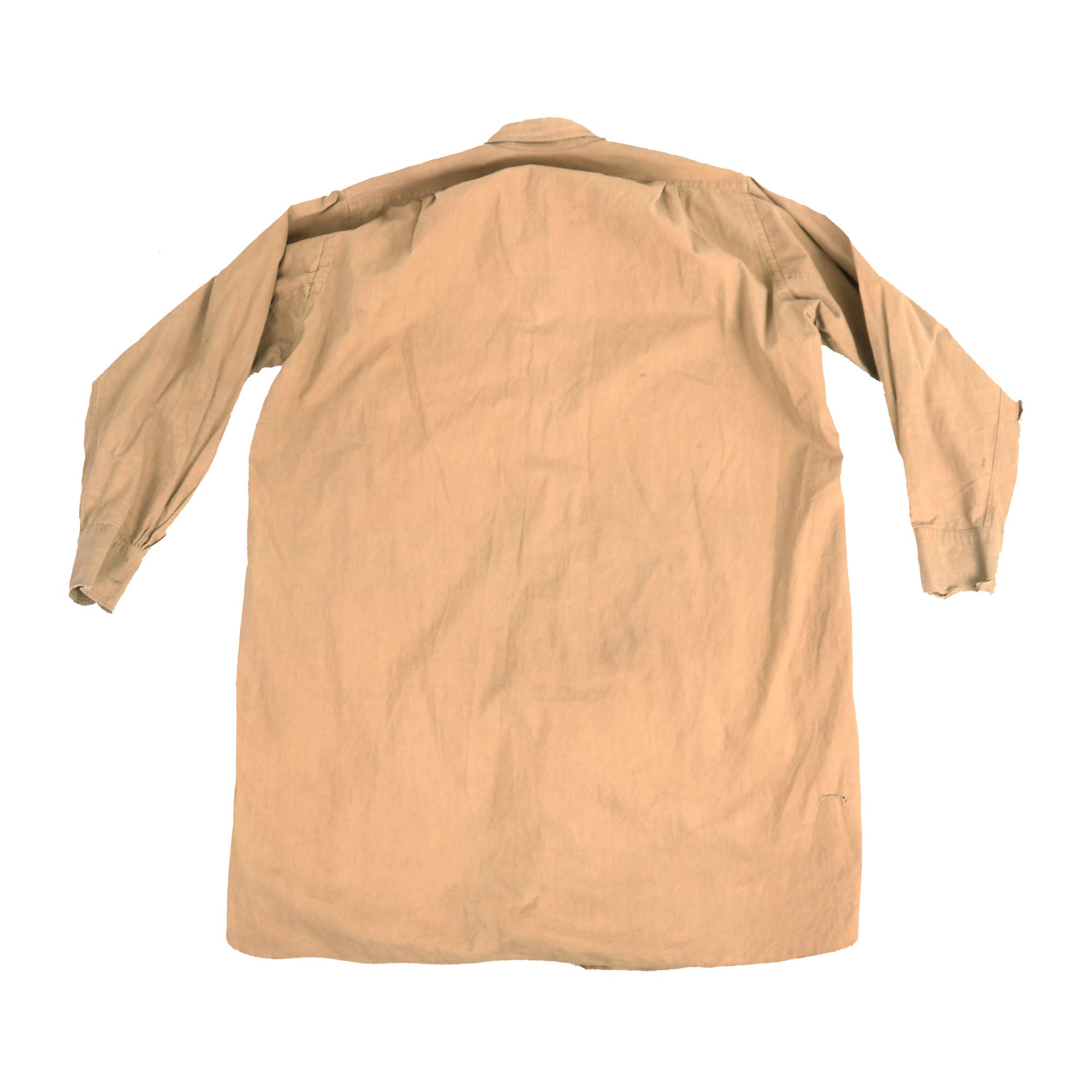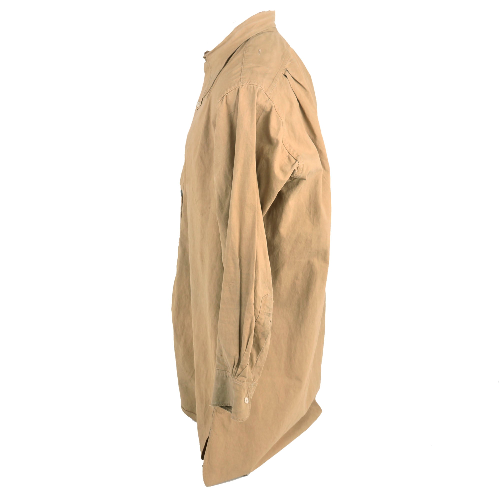 Original Item: Only One Available. Just acquired from a large military show, this is an fantastic service used rare World War II Deutsches Afrikakorps (DAK) Luftwaffe Enlisted Man's Field Shirt, made from medium weight cotton with standard squared weave. Originally intended mainly as work shirts, the hot climate of North Africa, such as in Libya, Tunisia, and Egypt, would lead to them being worn almost constantly, so they started making them able to take rank insignia. It is the correct Dunkelgelb (dark yellow) tan color used by other branches in the Tropical campaigns, and like other field shirts it is a pull over design, with a partial front closure. It has long sleeves but does not have any pockets, which we have heard indicates flight use, but have not been able to verify.