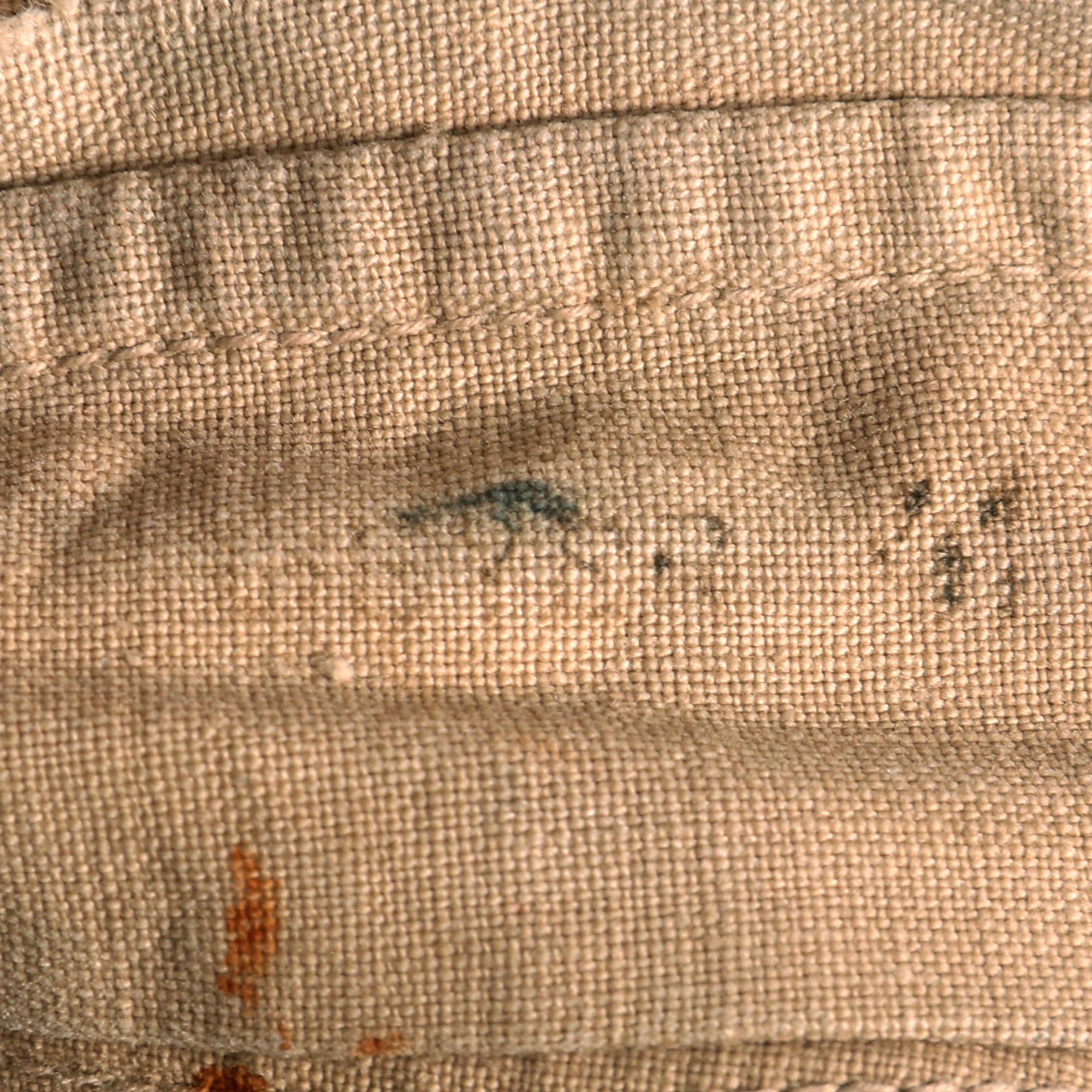 The right chest has a lovely machine embroidered Luftwaffe eagle made from silver gray thread on a triangular tan background, which matches the color of the shirt well, though it is a bit darker. It is machine stitched to the shirt with the correct tan thread, and is 100% correct. The stitching does look to have pulled out on the bottom, which was repaired with lighter tan thread.