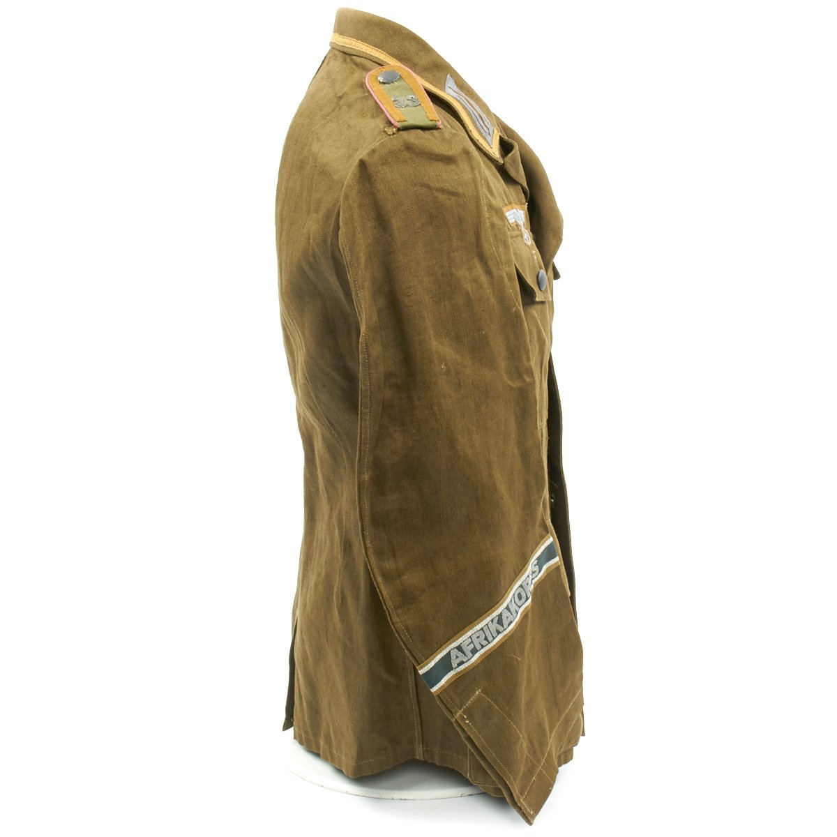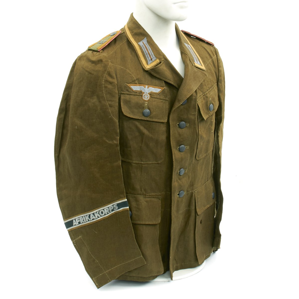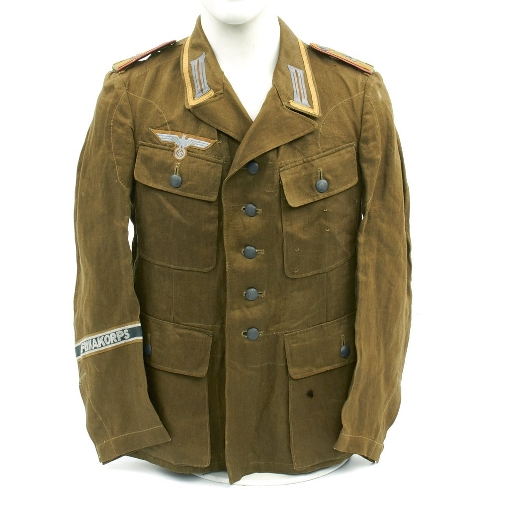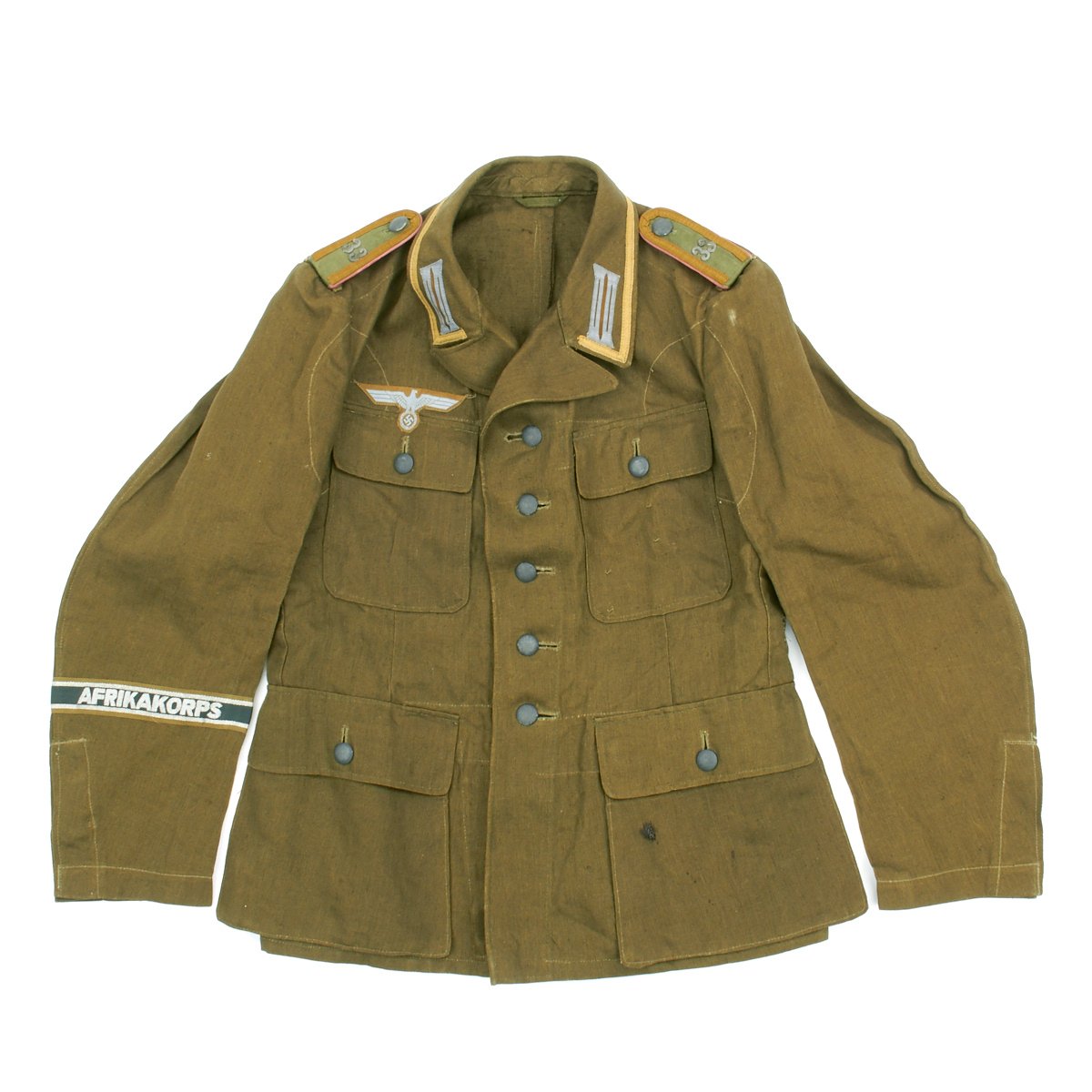 In early 1941, the German military began their conquest of southern Europe. Due to the warmer climates of these areas, the German Army needed to equip its troops with a more suitable form of dress, and replace the standard wool based feldgrau uniforms. The new "tropical" uniforms were lighter in weight, and dyed in colors ranging from light tan to dark olive.This 100% authentic German World War Two M43 Heer Tropical Tunic is in mint condition. The tunic is made out of lightweight Herringbone Twill (HBT) material which has been dyed a darker olive/tan. The tunic features a machine applied BeVo tropical Heer Breast eagle, machine applied tropical EM collar litzen, machine applied tropical NCO collar tress, and machine applied Afrika Korps cuff-title on the lower right sleeve; all in near mint condition.The slip-on pink piped tropical shoulder boards are also in near mint condition. The front of the tunic has five original blue painted buttons for the main closure, and four pocket buttons; all of which show only minimal wear to the high points. All buttons are held in place with circular retainers.The interior of the tunic, like the exterior, is near mint condition as well. The inside of the tunic's right flap has an ink stamped RB number 0/0850/0196, sizing, and depot code with year. Two belt hook adjustment straps are positioned on the sides of the tunic's interior, and are securely held in place.Overall a mint condition totally genuine Afrika Korps M43 tunic, unlikely you'll find one better anytime soon!