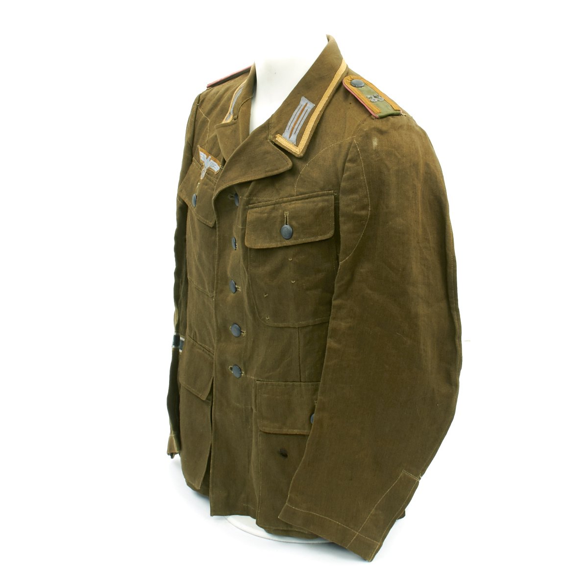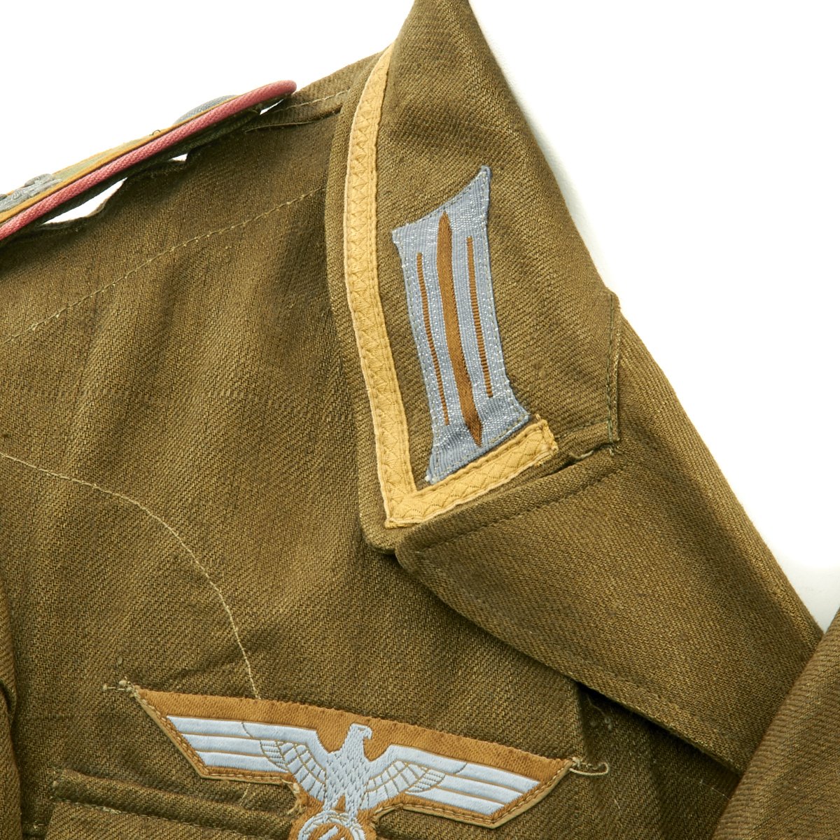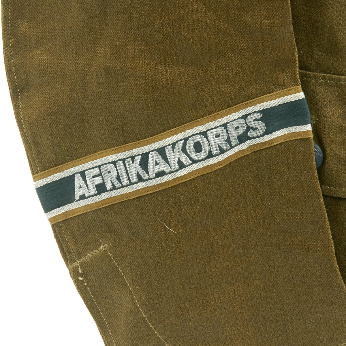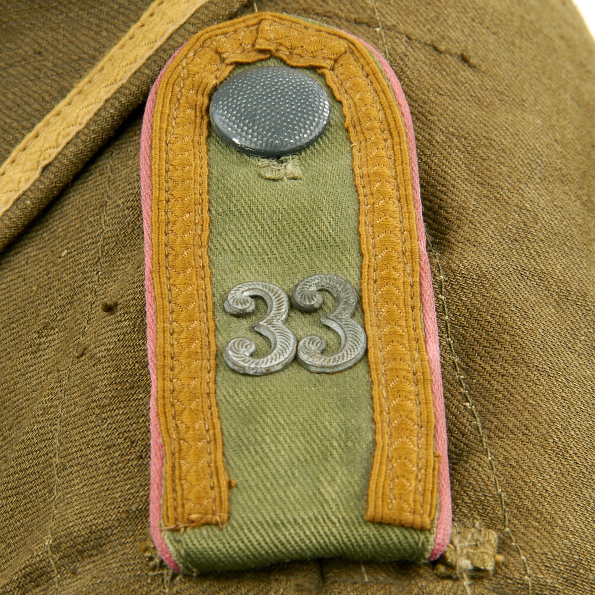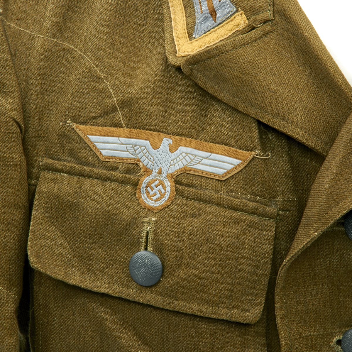 In early 1941, the German military began their conquest of southern Europe. Due to the warmer climates of these areas, the German Army needed to equip its troops with a more suitable form of dress, and replace the standard wool based feldgrau uniforms. The new "tropical" uniforms were lighter in weight, and dyed in colors ranging from light tan to dark olive.This 100% authentic German World War Two M43 Heer Tropical Tunic is in mint condition. The tunic is made out of lightweight Herringbone Twill (HBT) material which has been dyed a darker olive/tan. The tunic features a machine applied BeVo tropical Heer Breast eagle, machine applied tropical EM collar litzen, machine applied tropical NCO collar tress, and machine applied Afrika Korps cuff-title on the lower right sleeve; all in near mint condition.The slip-on pink piped tropical shoulder boards are also in near mint condition. The front of the tunic has five original blue painted buttons for the main closure, and four pocket buttons; all of which show only minimal wear to the high points. All buttons are held in place with circular retainers.The interior of the tunic, like the exterior, is near mint condition as well. The inside of the tunic's right flap has an ink stamped RB number 0/0850/0196, sizing, and depot code with year. Two belt hook adjustment straps are positioned on the sides of the tunic's interior, and are securely held in place.Overall a mint condition totally genuine Afrika Korps M43 tunic, unlikely you'll find one better anytime soon!