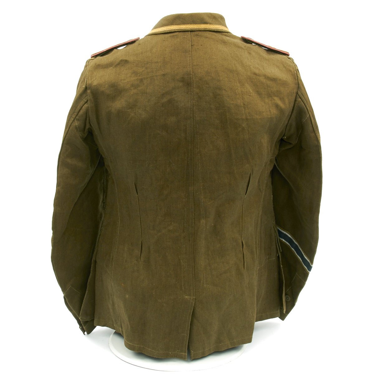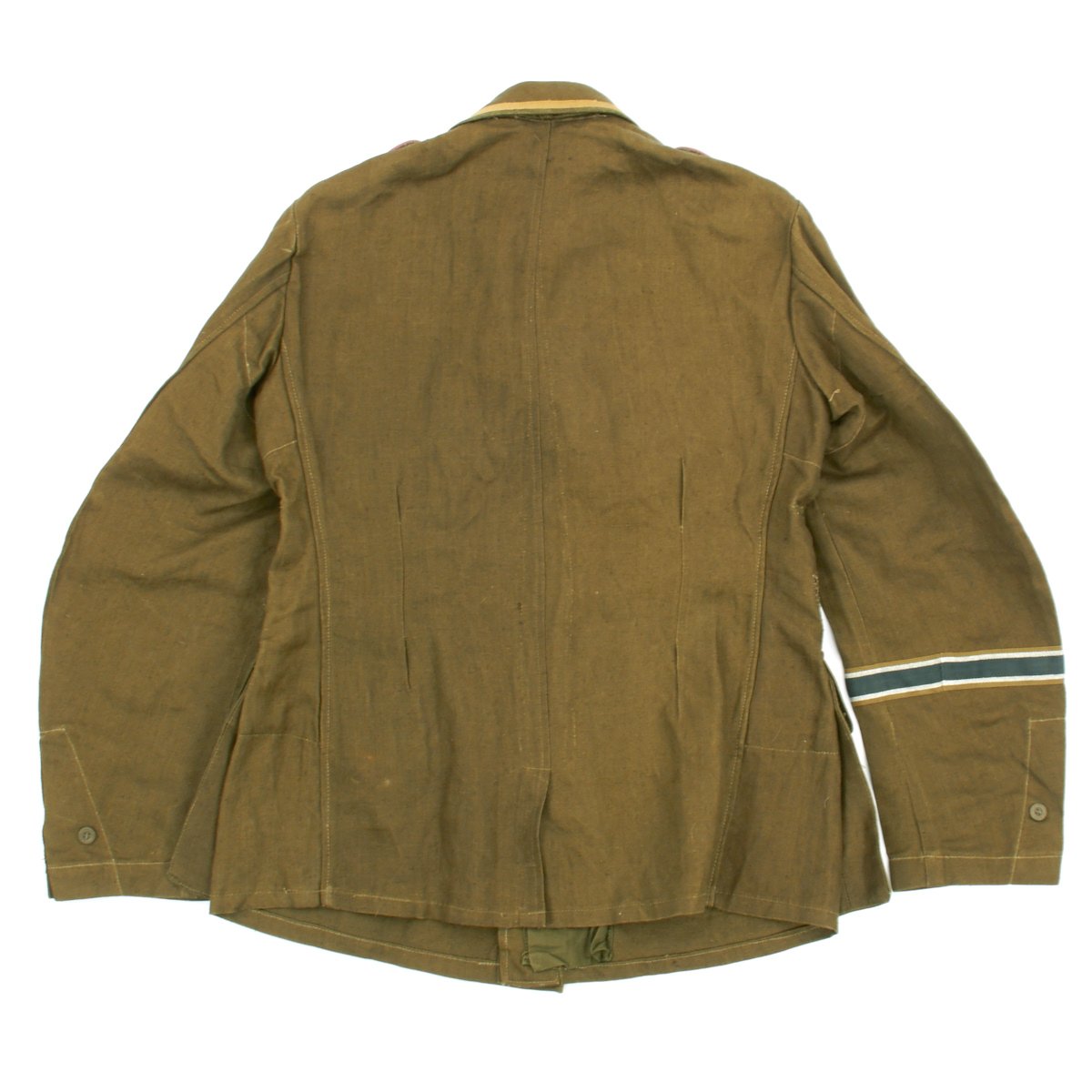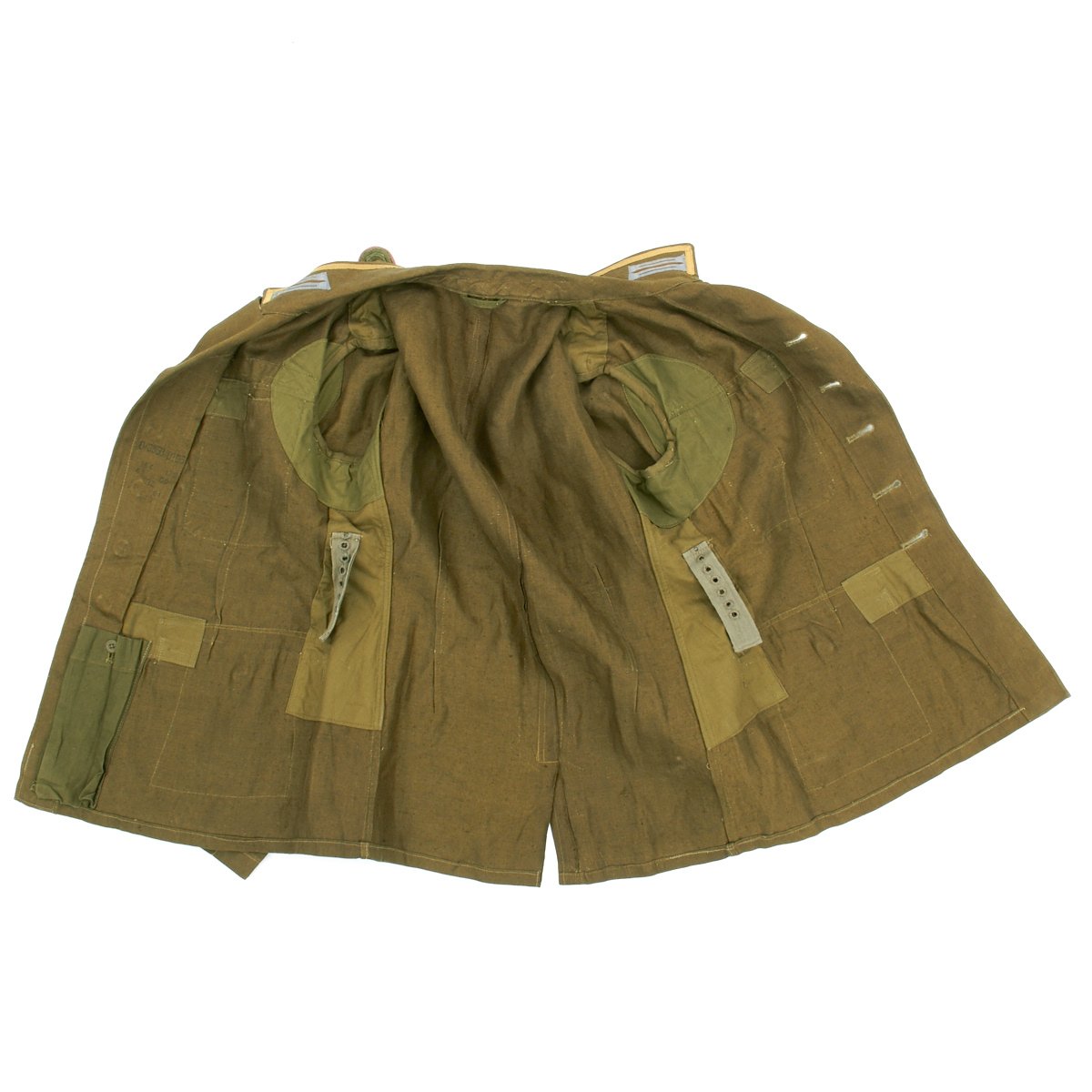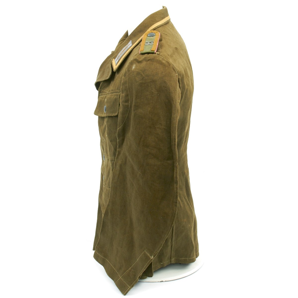 In early 1941, the German military began their conquest of southern Europe. Due to the warmer climates of these areas, the German Army needed to equip its troops with a more suitable form of dress, and replace the standard wool based feldgrau uniforms. The new "tropical" uniforms were lighter in weight, and dyed in colors ranging from light tan to dark olive.This 100% authentic German World War Two M43 Heer Tropical Tunic is in mint condition. The tunic is made out of lightweight Herringbone Twill (HBT) material which has been dyed a darker olive/tan. The tunic features a machine applied BeVo tropical Heer Breast eagle, machine applied tropical EM collar litzen, machine applied tropical NCO collar tress, and machine applied Afrika Korps cuff-title on the lower right sleeve; all in near mint condition.The slip-on pink piped tropical shoulder boards are also in near mint condition. The front of the tunic has five original blue painted buttons for the main closure, and four pocket buttons; all of which show only minimal wear to the high points. All buttons are held in place with circular retainers.The interior of the tunic, like the exterior, is near mint condition as well. The inside of the tunic's right flap has an ink stamped RB number 0/0850/0196, sizing, and depot code with year. Two belt hook adjustment straps are positioned on the sides of the tunic's interior, and are securely held in place.Overall a mint condition totally genuine Afrika Korps M43 tunic, unlikely you'll find one better anytime soon!