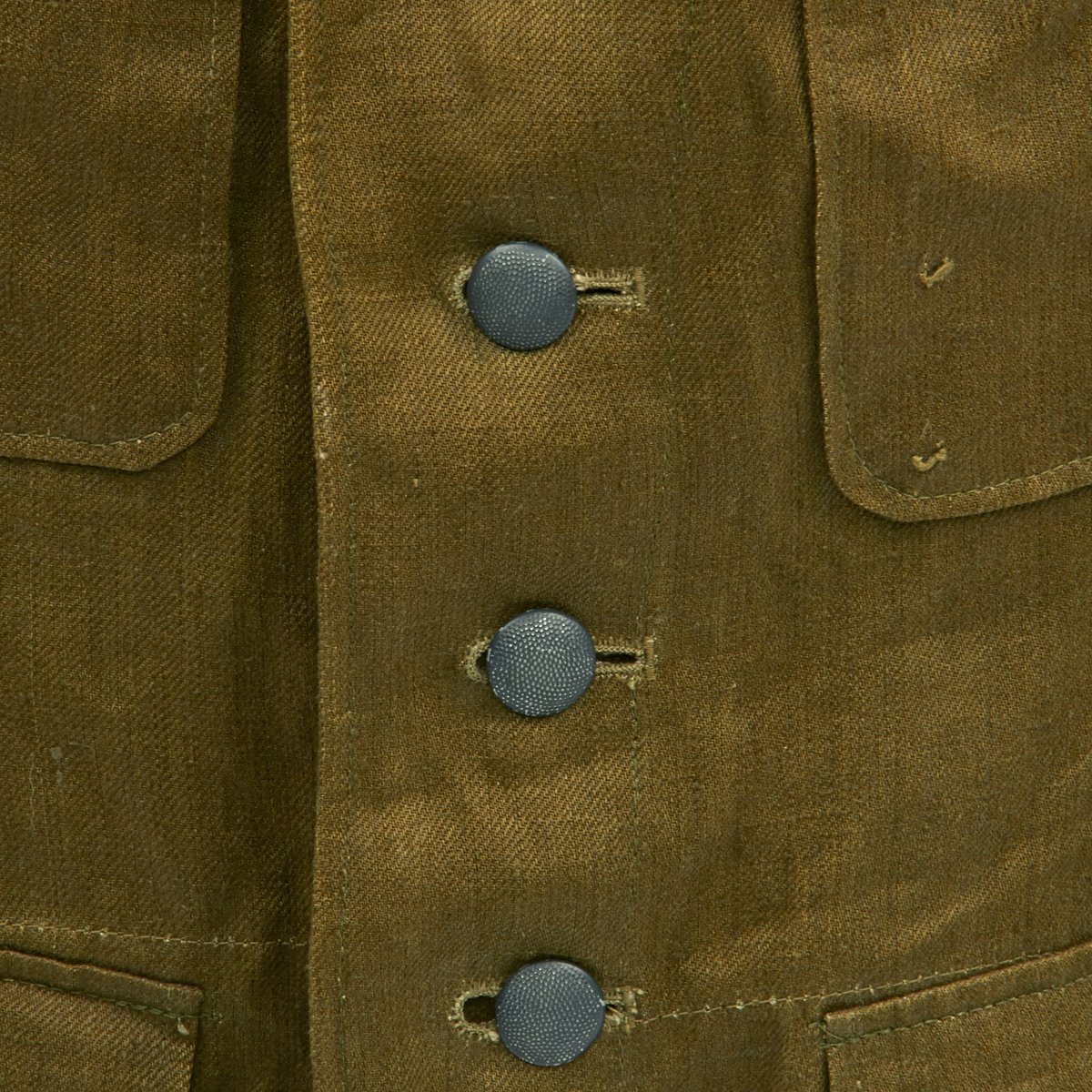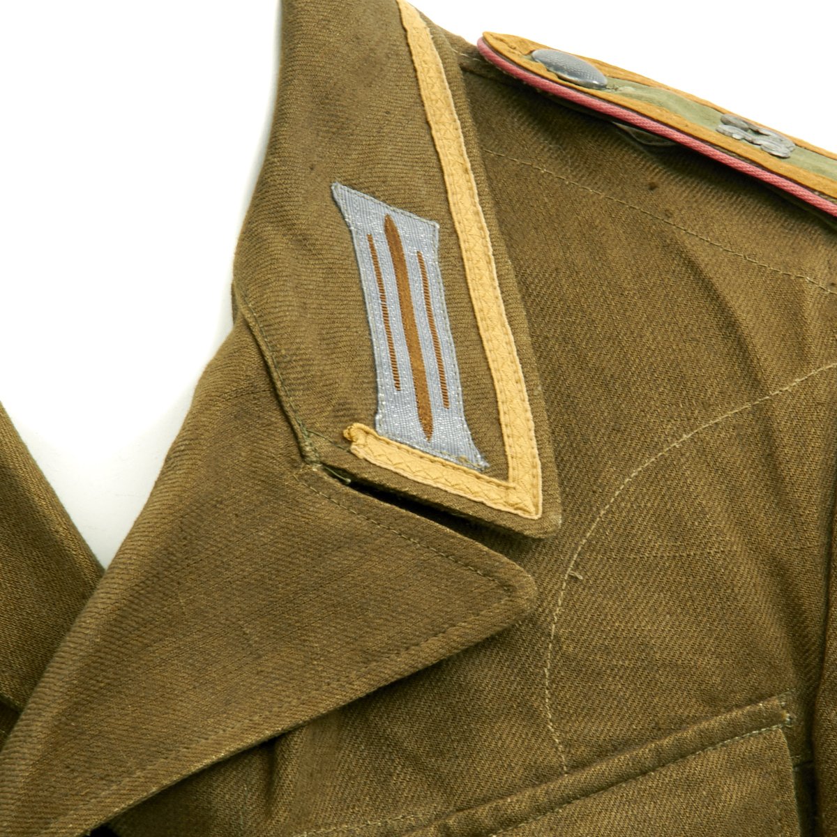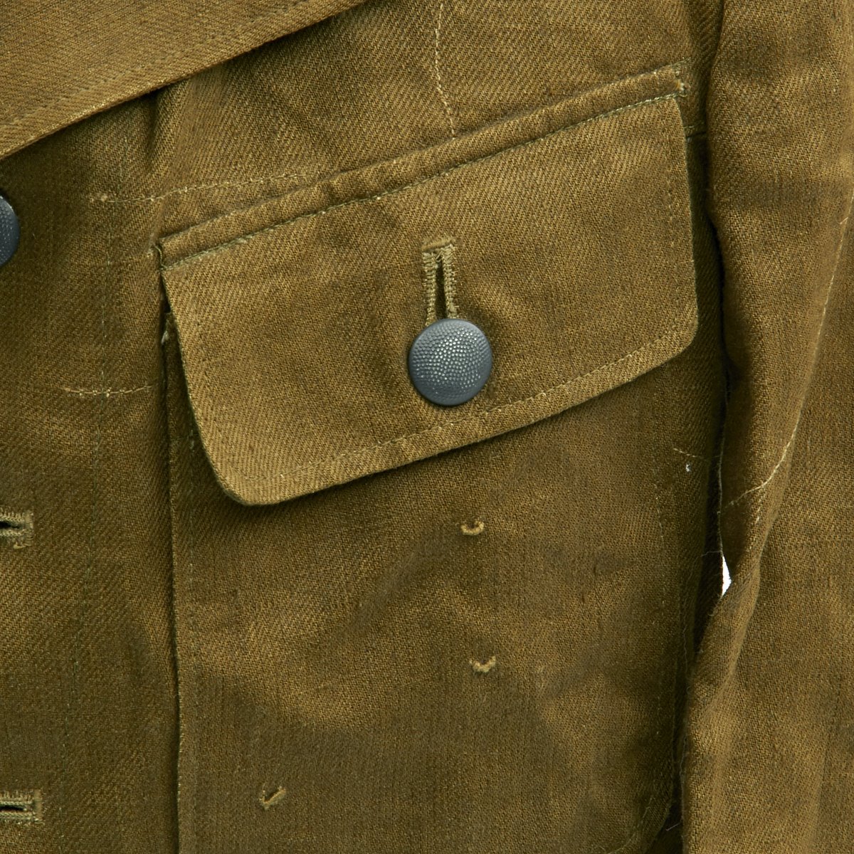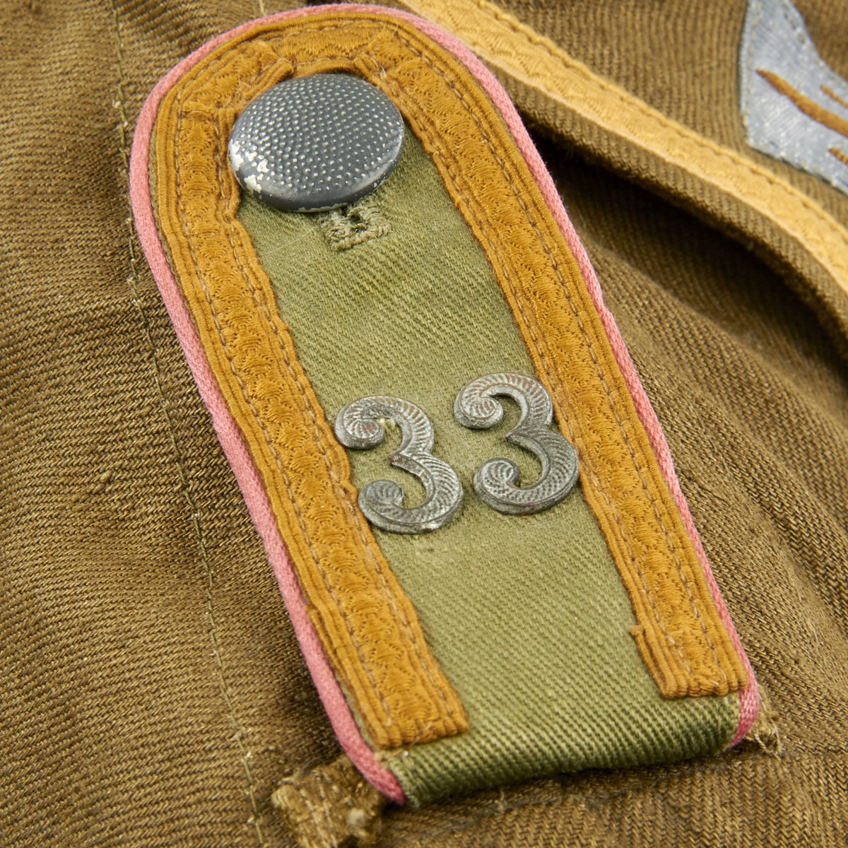 In early 1941, the German military began their conquest of southern Europe. Due to the warmer climates of these areas, the German Army needed to equip its troops with a more suitable form of dress, and replace the standard wool based feldgrau uniforms. The new "tropical" uniforms were lighter in weight, and dyed in colors ranging from light tan to dark olive.This 100% authentic German World War Two M43 Heer Tropical Tunic is in mint condition. The tunic is made out of lightweight Herringbone Twill (HBT) material which has been dyed a darker olive/tan. The tunic features a machine applied BeVo tropical Heer Breast eagle, machine applied tropical EM collar litzen, machine applied tropical NCO collar tress, and machine applied Afrika Korps cuff-title on the lower right sleeve; all in near mint condition.The slip-on pink piped tropical shoulder boards are also in near mint condition. The front of the tunic has five original blue painted buttons for the main closure, and four pocket buttons; all of which show only minimal wear to the high points. All buttons are held in place with circular retainers.The interior of the tunic, like the exterior, is near mint condition as well. The inside of the tunic's right flap has an ink stamped RB number 0/0850/0196, sizing, and depot code with year. Two belt hook adjustment straps are positioned on the sides of the tunic's interior, and are securely held in place.Overall a mint condition totally genuine Afrika Korps M43 tunic, unlikely you'll find one better anytime soon!
