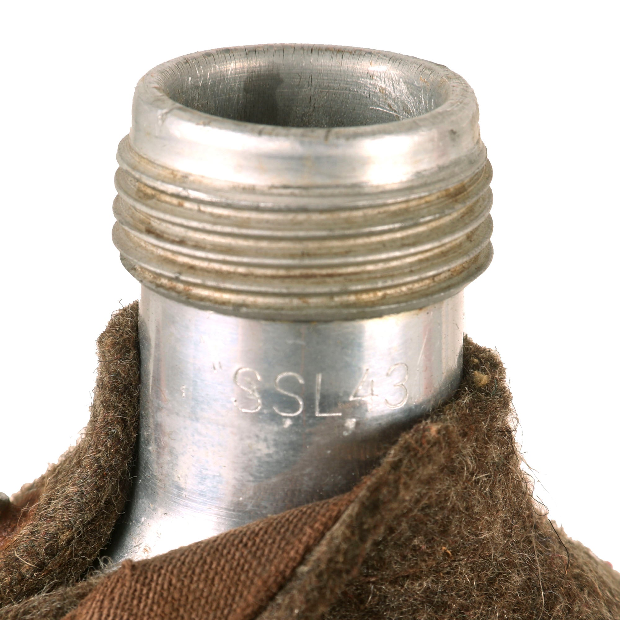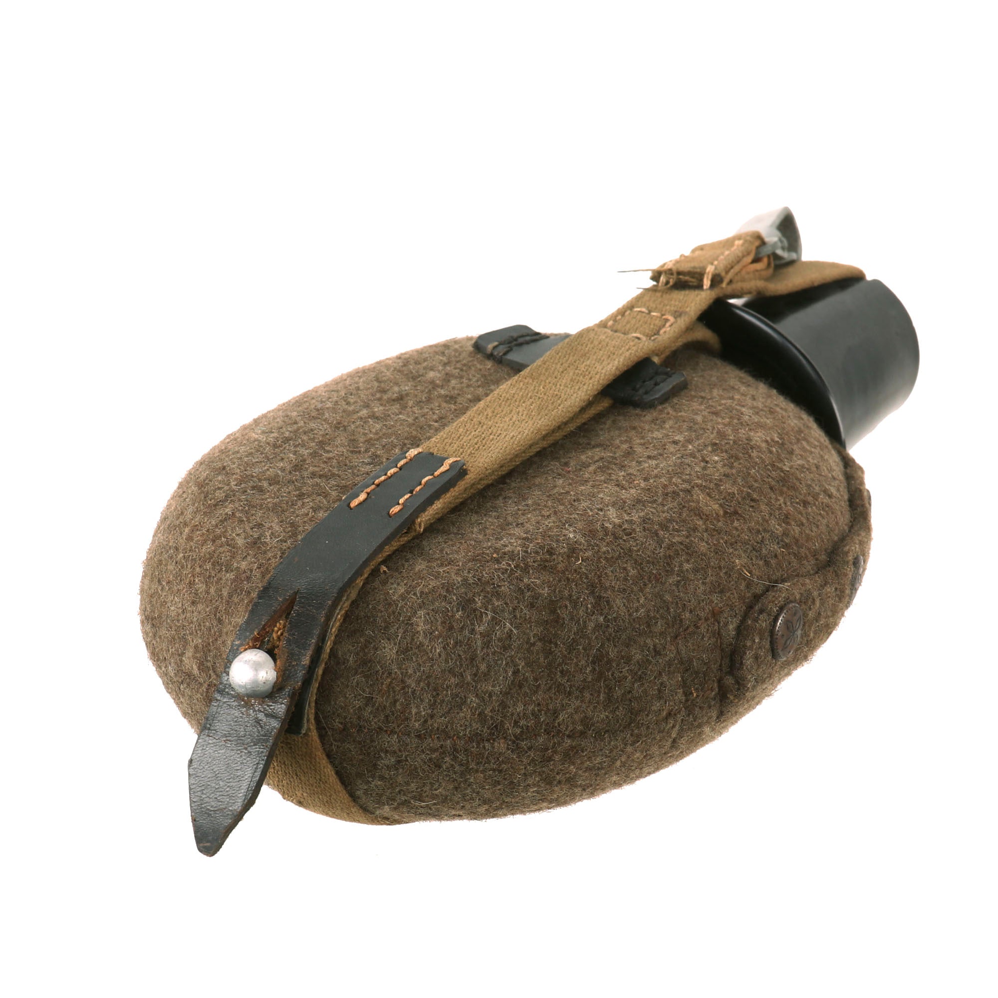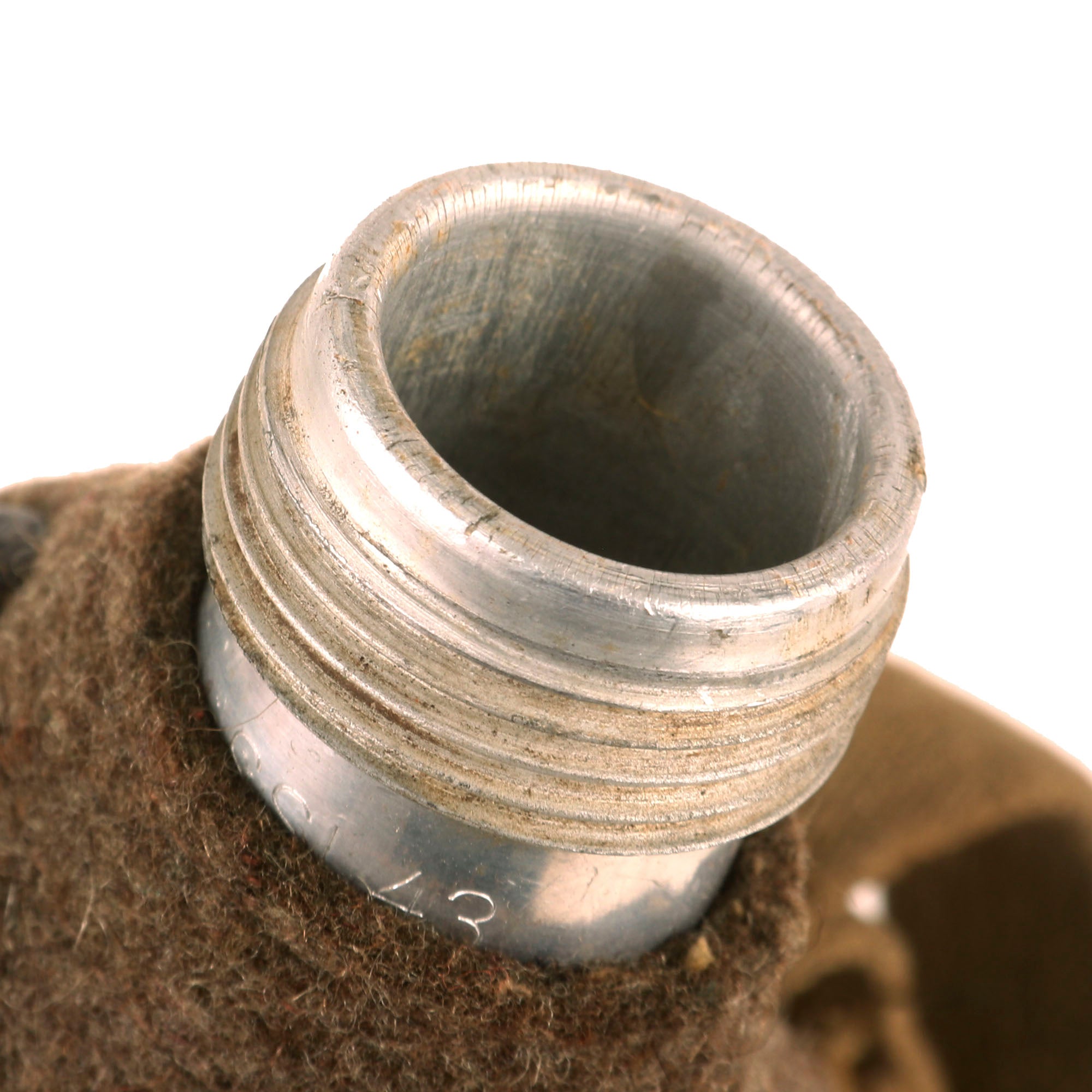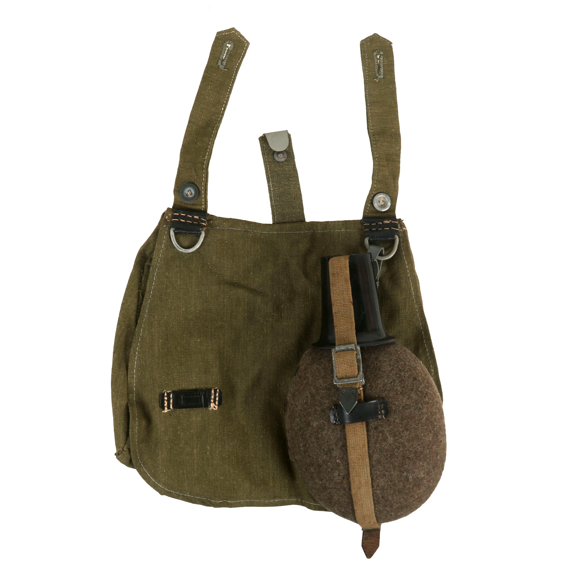 Original Item: Only One Set Available. This is a very nice original German Deutsches Afrikakorps (DAK) Aluminum M31 Canteen with a Bakelite cup, complete with a nice Model 31 Brotbeutel (Bread bag). These items were acquired as a set from a collector, who told us they were purchased as a set from the family of a WWII Veteran. We do not know however whether they were captured and brought back, or purchased on the market.