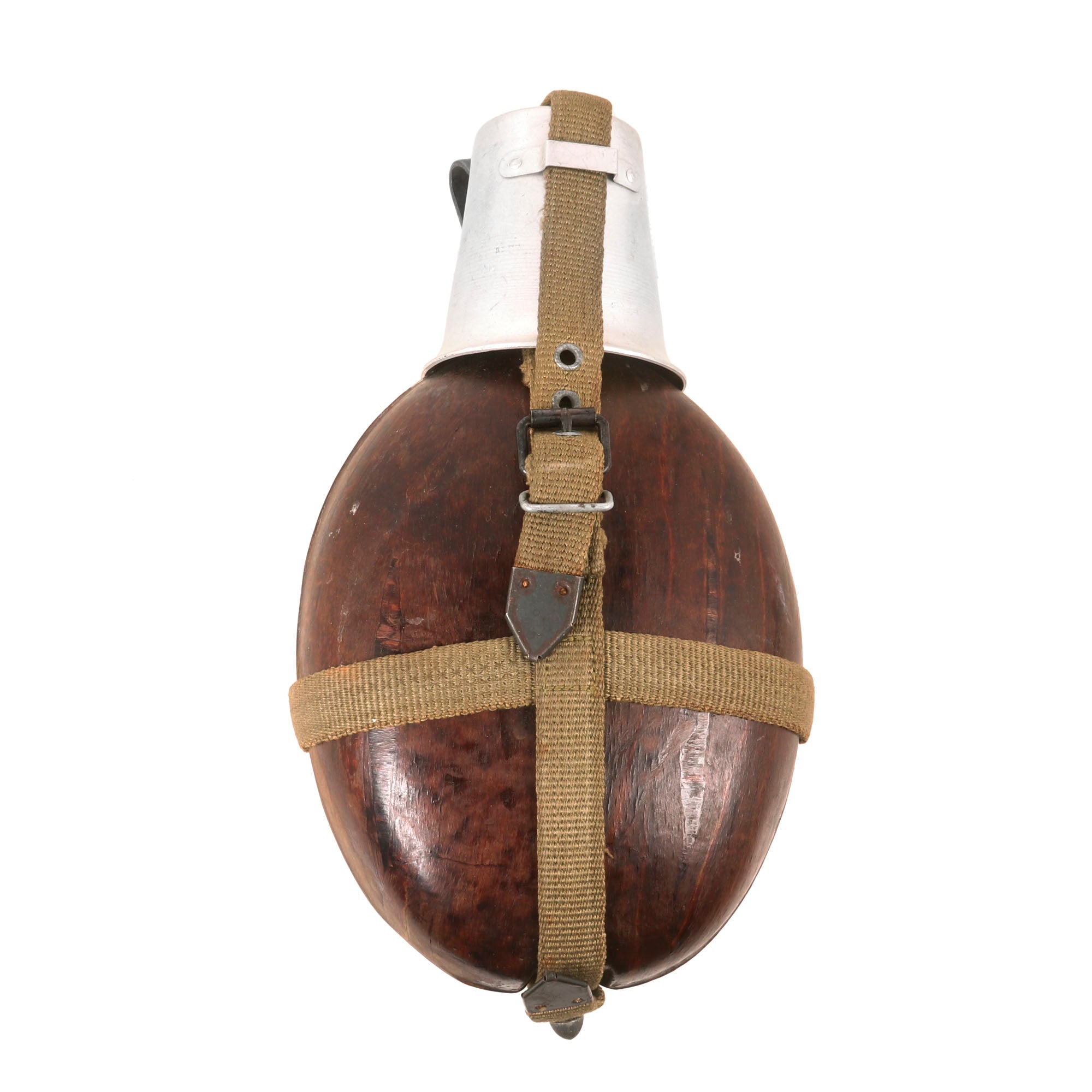Original Item: Only One Available. This is a very nice original German Deutsches Afrikakorps (DAK) laminated wood canteen (Tropen Feldflasche), often referred to as the "coconut" canteen, due to its unusual appearance. These are constructed of pressed laminated wood over an aluminum body, sometimes secured by rayon straps. The Heinrich Ritter company produced this before, during, and after the war, using different markings.