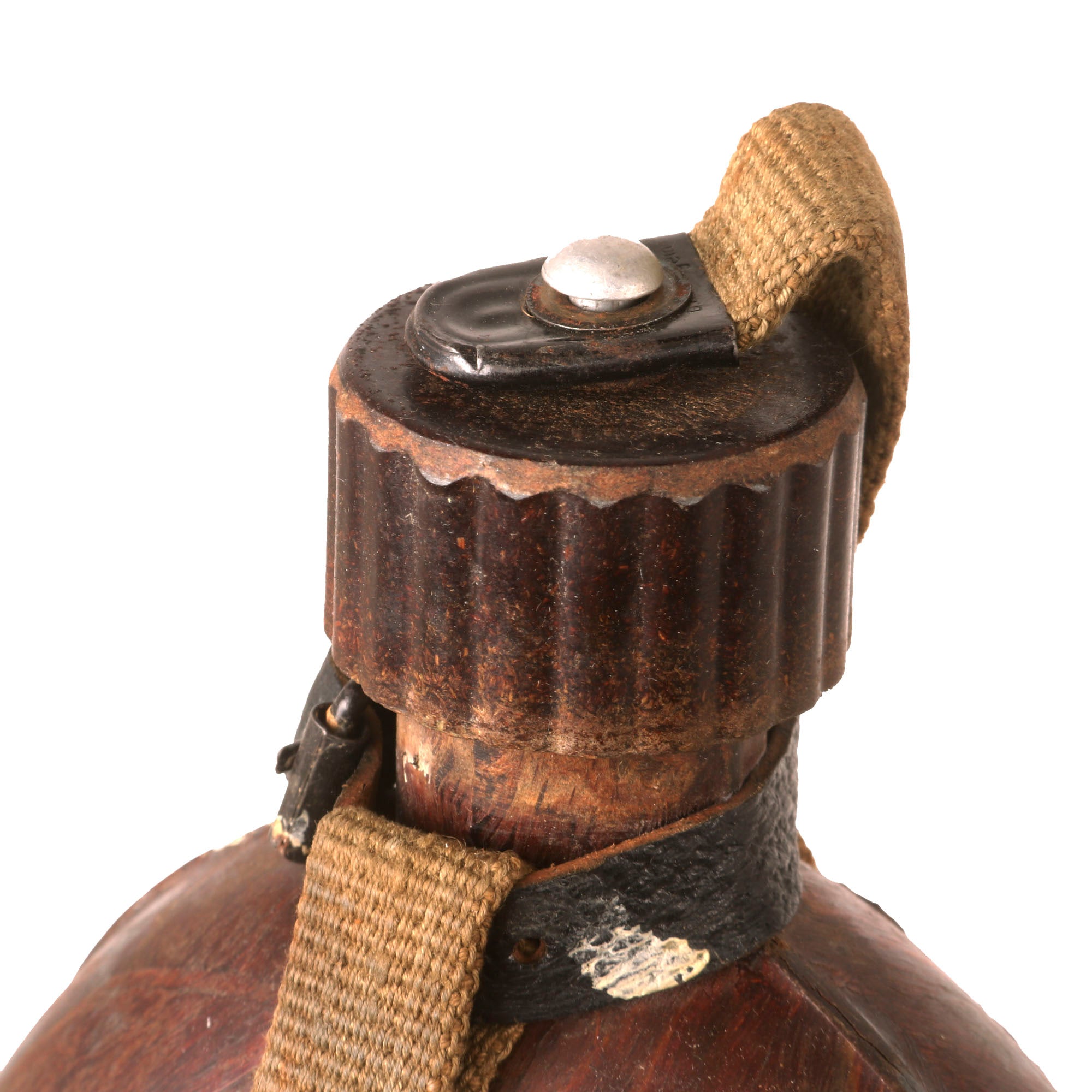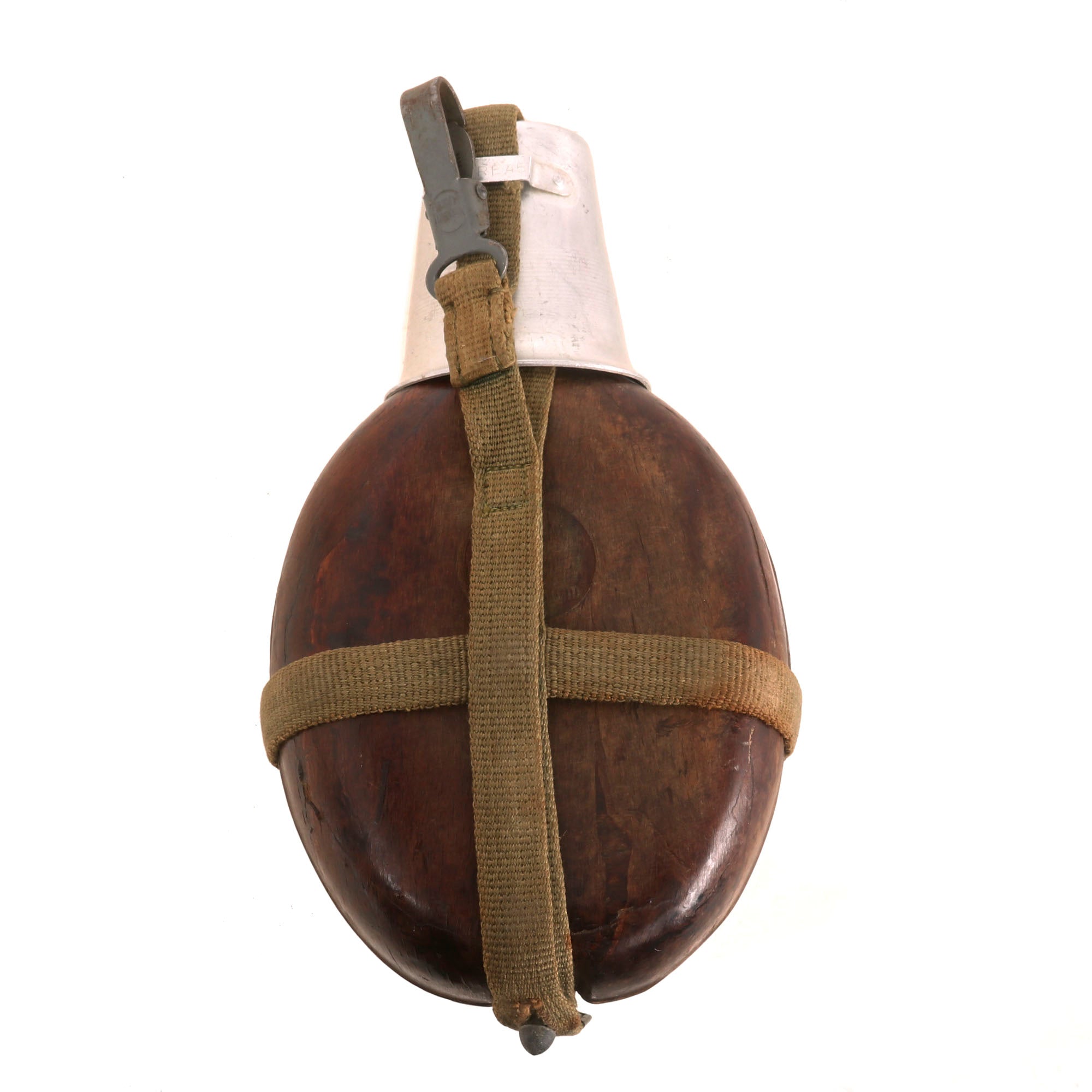 The canteen features the correct aluminum core and an original early bakelite cap, which still has the correct rubber seal. The bakelite cap does not have a date we can see, but it may have mold markings under the washer, however we were not able to remove it. The back of the canteen is clearly marked: