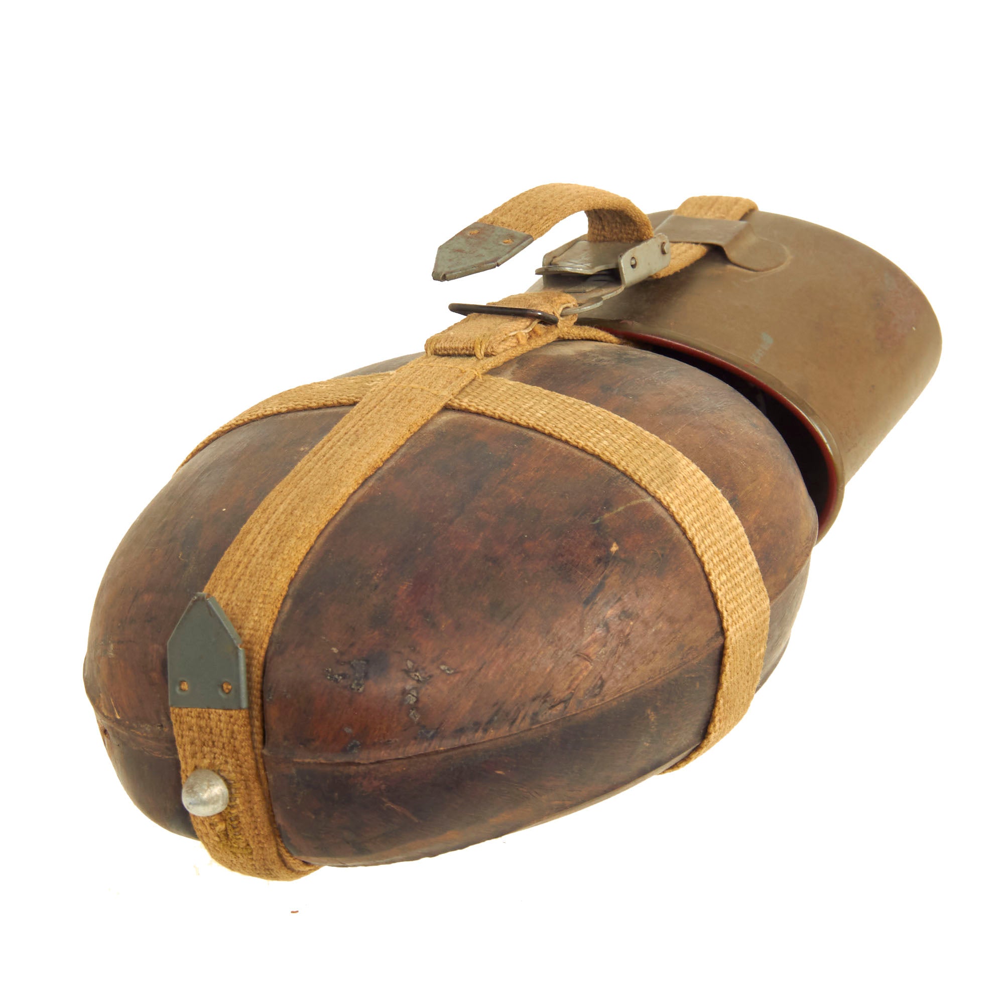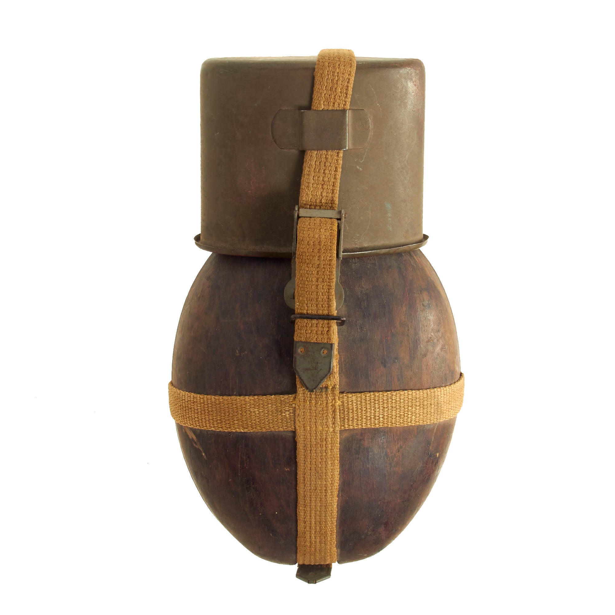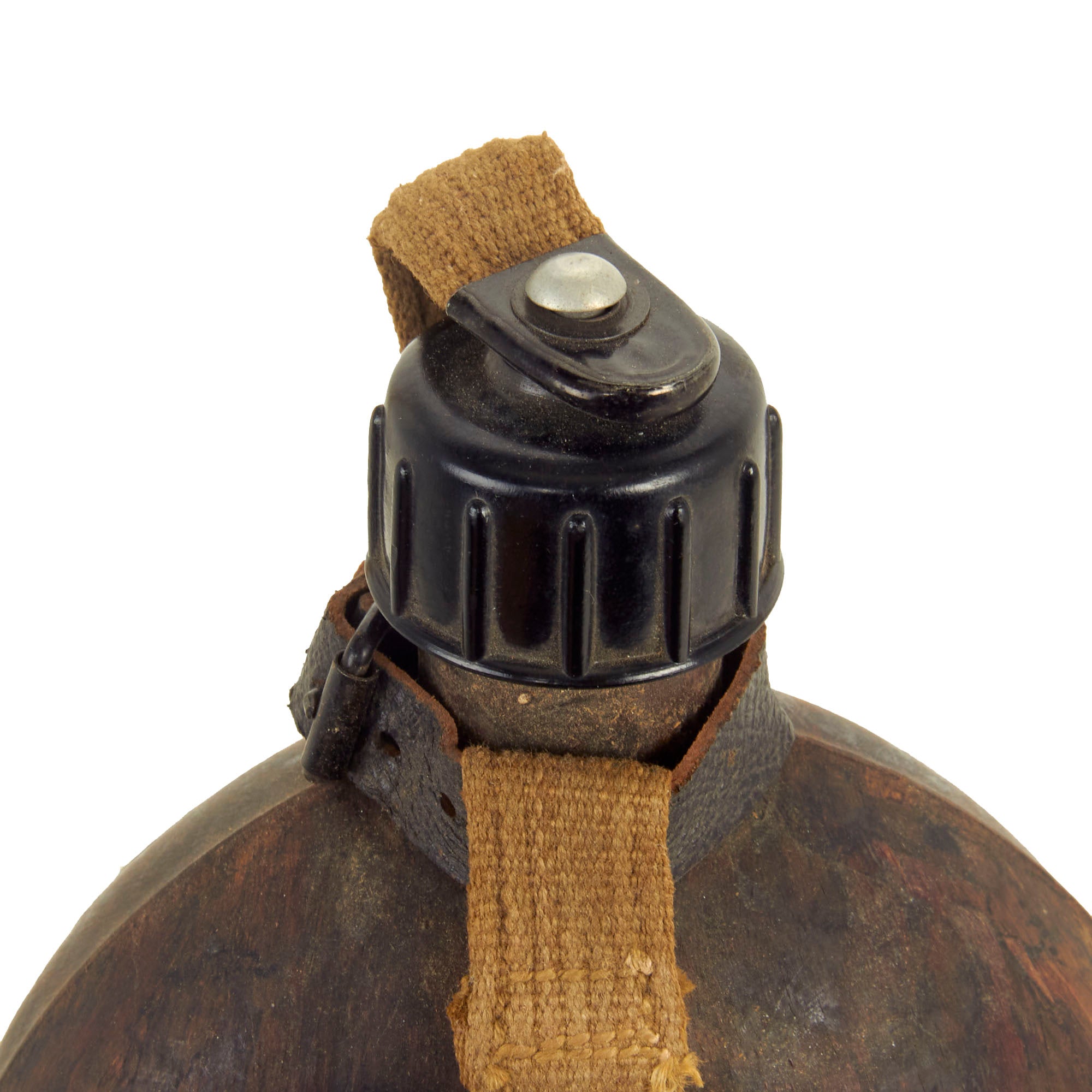 Original Item: Only One Available. This is a very nice original German Deutsches Afrikakorps (DAK) laminated wood canteen (Tropen Feldflasche), often referred to as the "coconut" canteen, due to its unusual appearance. These are constructed of pressed laminated wood over an aluminum body, sometimes secured by rayon straps.