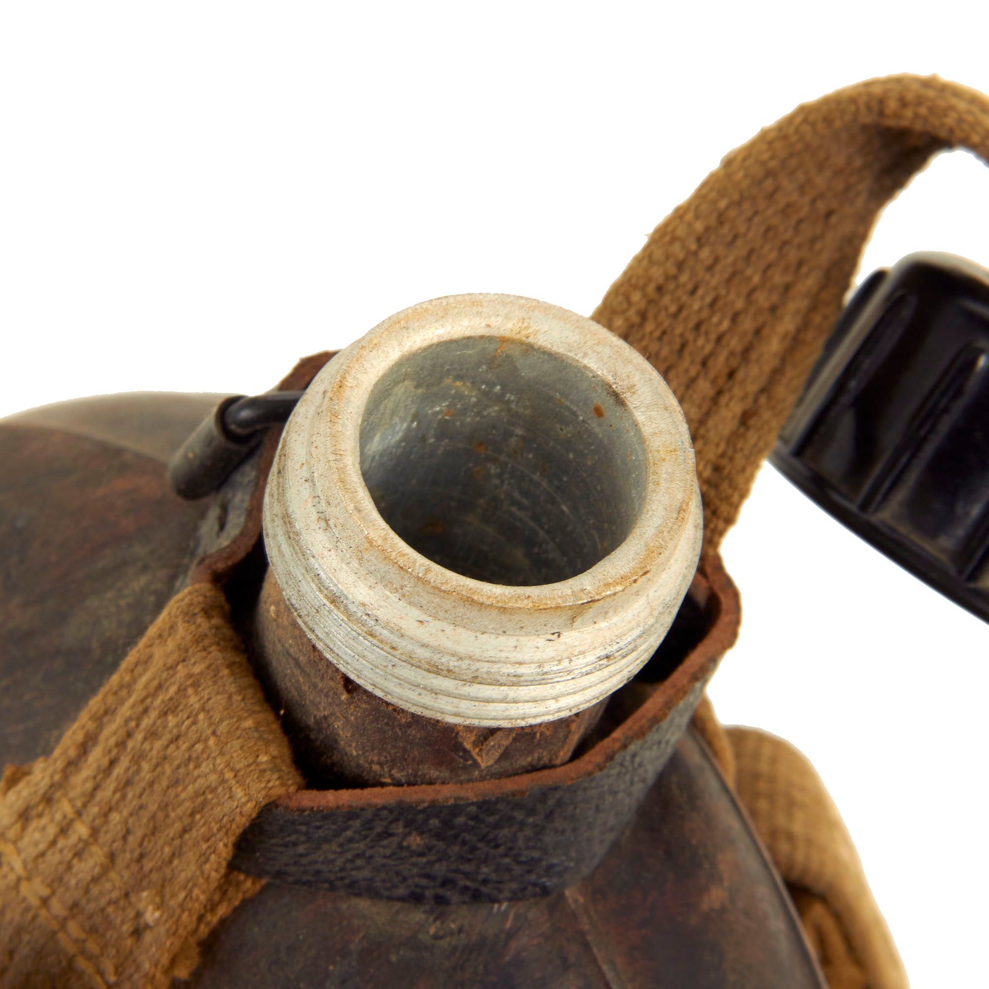 The compressed wood laminate is in very good condition, with no major cracks or defects. Comes complete with the original DAK color cotton web carrying harness and its leather strap around the neck, which are both in very good condition. The rear belt attachment buckle on the harness is painted in gray and is maker marked Patent / Ritter, while the front strap buckle has a marking that we cannot read. Canteen features the correct aluminum core and an original aluminum cap, which still has the correct rubber seal. The back of the canteen is clearly marked: