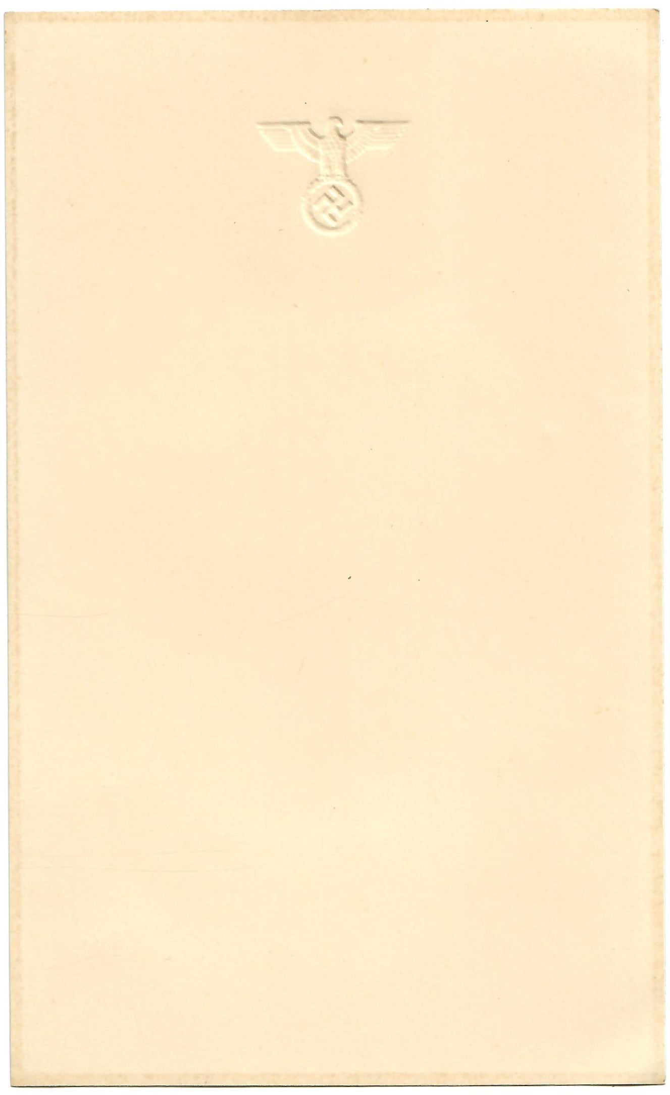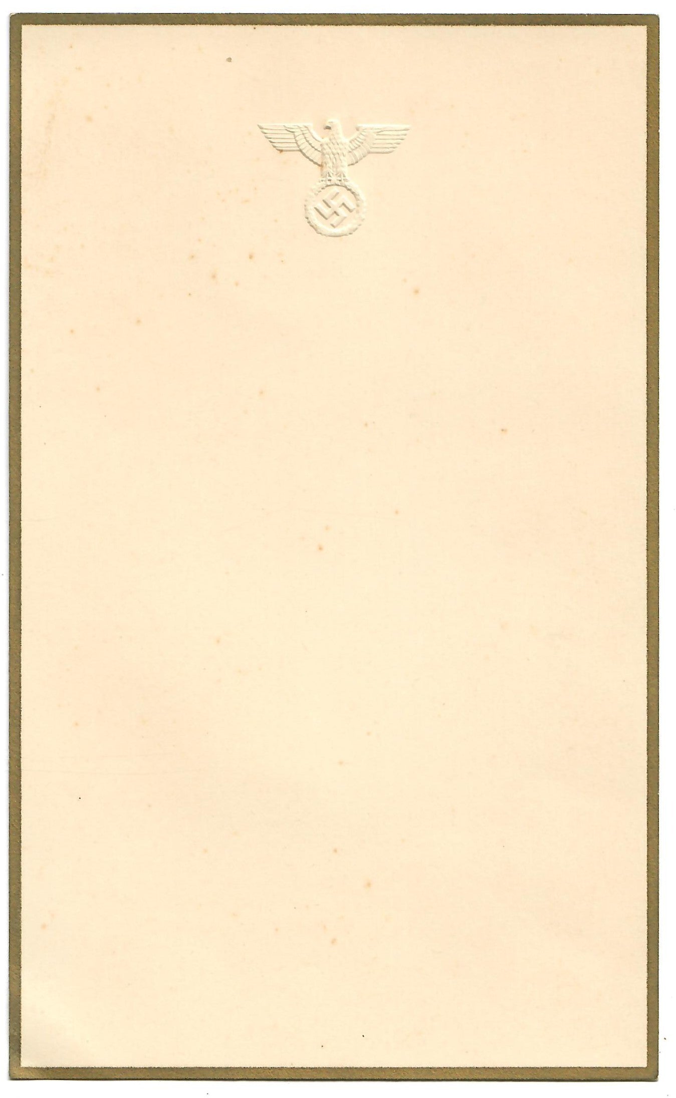 This is a lovely large size menu card measuring exactly 4 5/16 x 7 1/16”, with a gold border and an embossed eagle at the top center. This style of menu card is often associated with those found at Adolf H's Retreat Der Berghof at Berchtesgaden. However, without any writing or information on the card, we cannot say for certain where this would have been used, but it is certainly an AH Menu card.