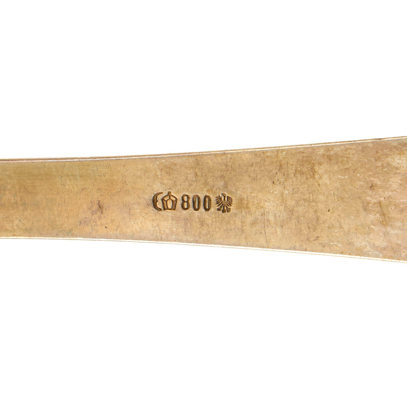 It is generally believed there were approximately 3,000 pieces of the "Formal" pattern produced, and only about 1000 pieces of the "Informal". Obviously serving pieces such as an asparagus fork or sugar tongs would have been produced in far less quantity than standard forks, knives and spoons. Either pattern is hallmarked in the identical manner, and the marks appear stamped in line, being a crescent, a crown, "800" for .800 silver content, and a Prussian eagle. Serving trays and larger serving utensils are not usually silver, but are normally silvered plate. These pieces generally were produced by the Wellner firm, and are stamped with a "W", and usually a silver plating content number.