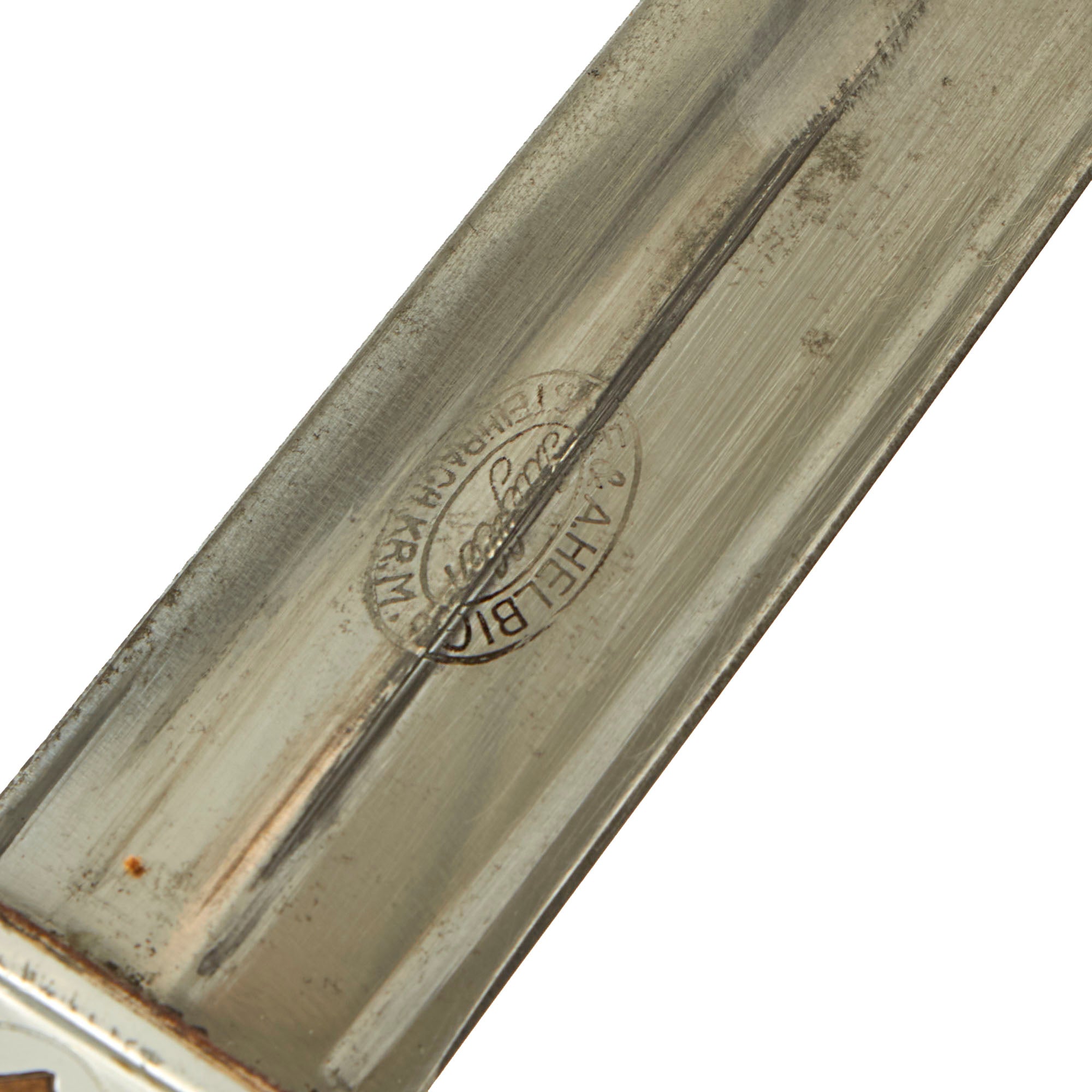 F. & A. Helbig, Messerfabrik (knife factory) in Steinbach Kreis Meiningen, was organized by Frieda & Alfred Helbig, succeeding F. & W. Helbig shortly after 1928. They prospered manufacturing daggers during the Third Reich era. They made daggers for the DLV, and made some crackle-finished Aluminum NSFK Glider Pilot's Knives. They also made many swords and daggers for the Luftwaffe, They used several trademark logos, and the lightly etched version without borders was the one usually seen on the Luftwaffe Swords. For more information please see GERMAN KNIFE AND SWORD MAKERS by J. Anthony Carter.