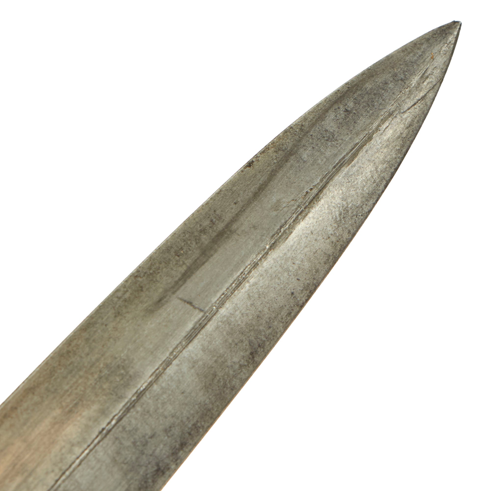The blade is in very good condition, looking to have seen some service but was well cared for. The blade surface is still mostly bright, and the factory final polish grind cross grain is visible in the light throughout the blade. This texture is iconic, and is the definitive identifying characteristic for a real WWII German Blade. The blade still has the factory beveled edge, and does not show any signs of post-manufacture sharpening, though the very tip has a slight bend to it. There are areas of past staining on the blade, which was cleaned away.