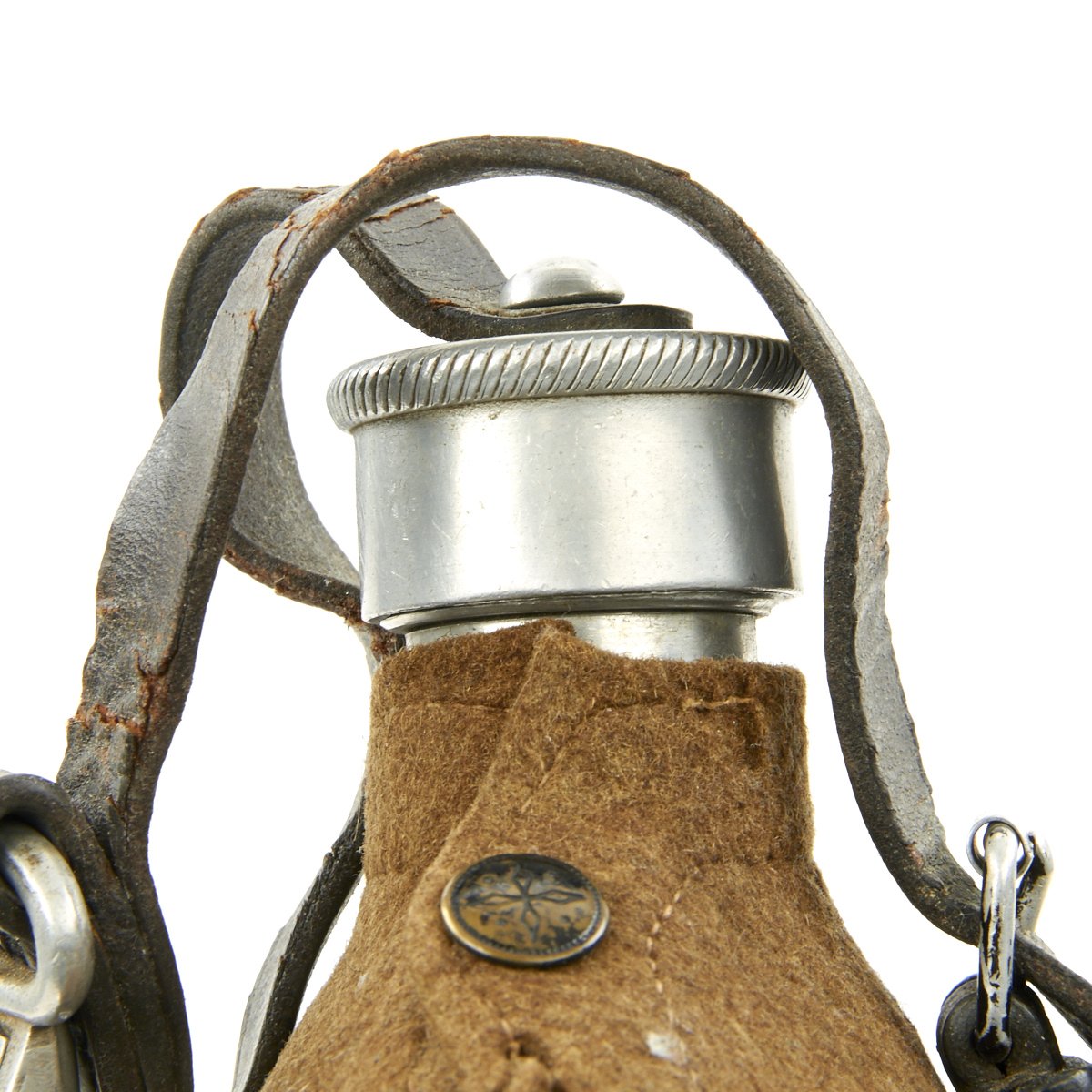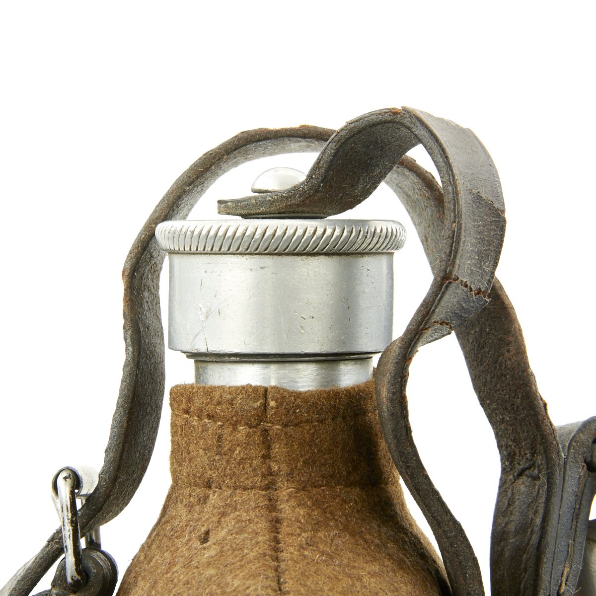 Original Item: Only One Available. This is a nice genuine German WWII Issue M31 aluminum canteen water bottle with with aluminum screw top cap, complete with genuine wool cover featuring correct snaps marked S.H.B.. It also has a standard black leather belt harness, which has an aluminum belt hook on the back, for attaching to the combat rigging.