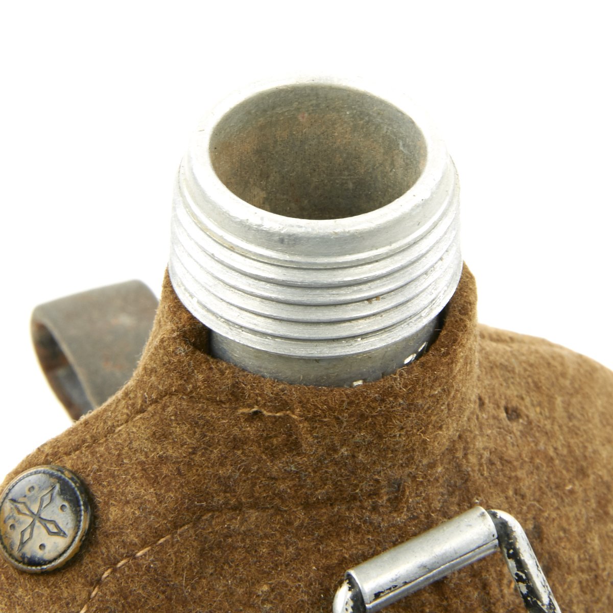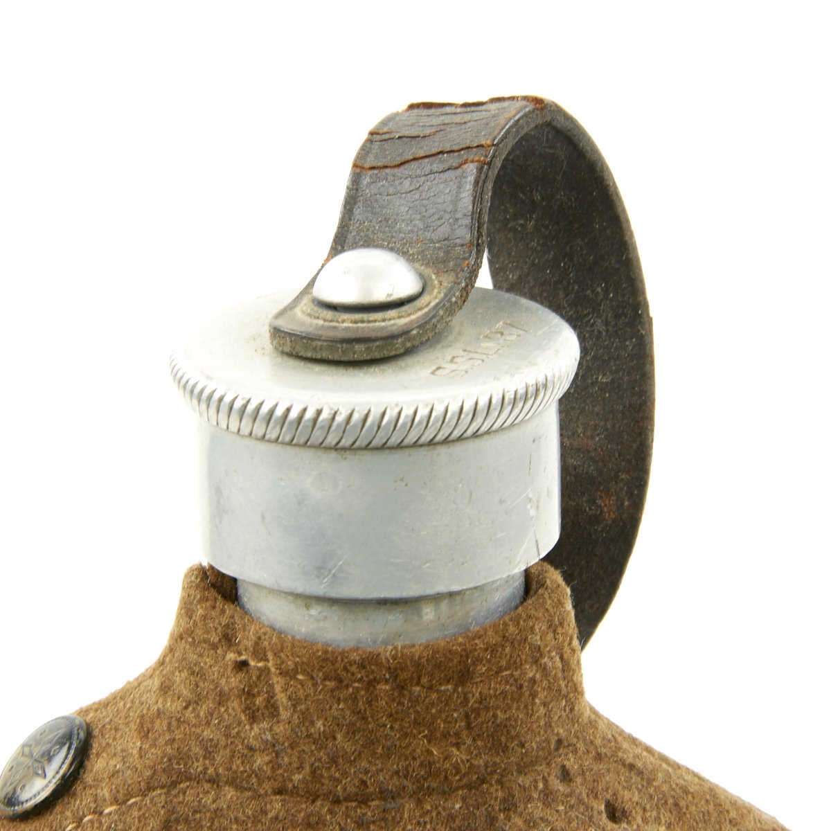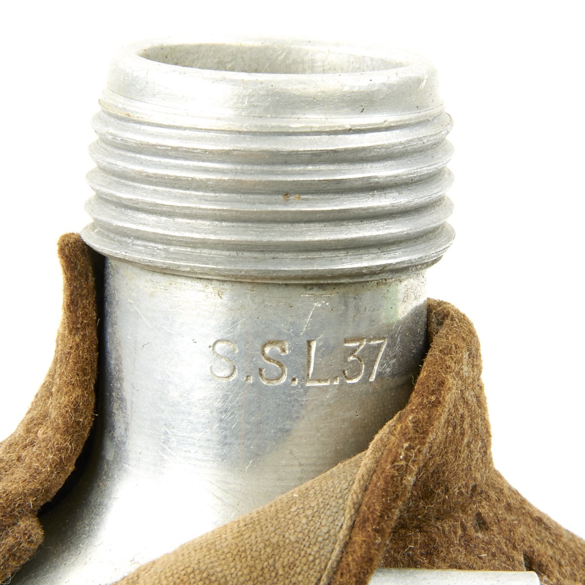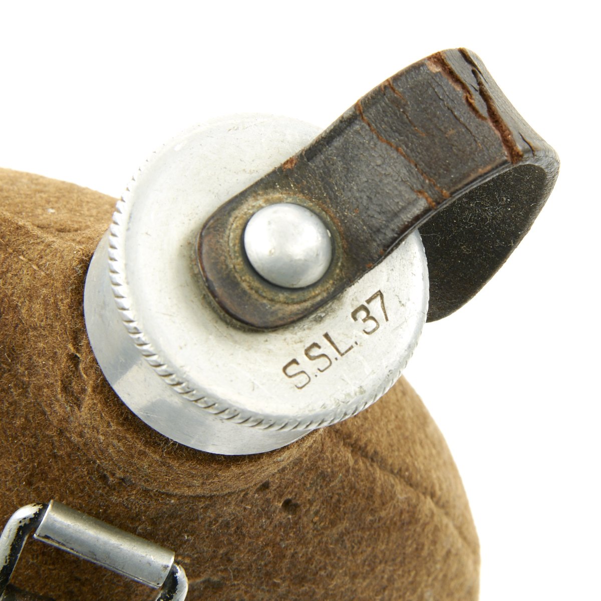 Both the canteen body and the canteen screw cap are marked S.S.L. 37. The companies that made the Aluminum components for canteens often did not use three letter codes, so these are actually abbreviations of the makers name, and the date. We were unfortunately unable to identify the maker, however this is a known maker mark.