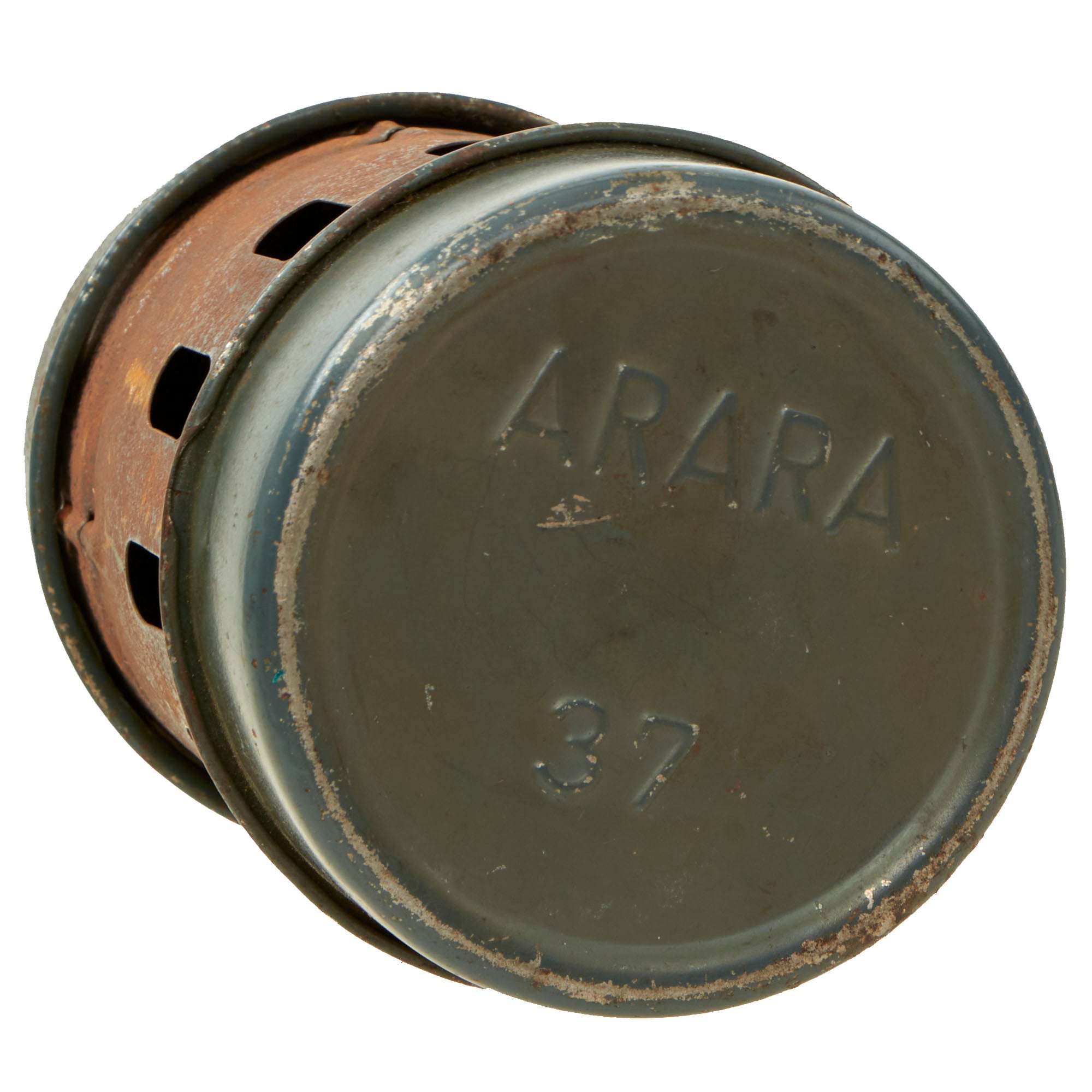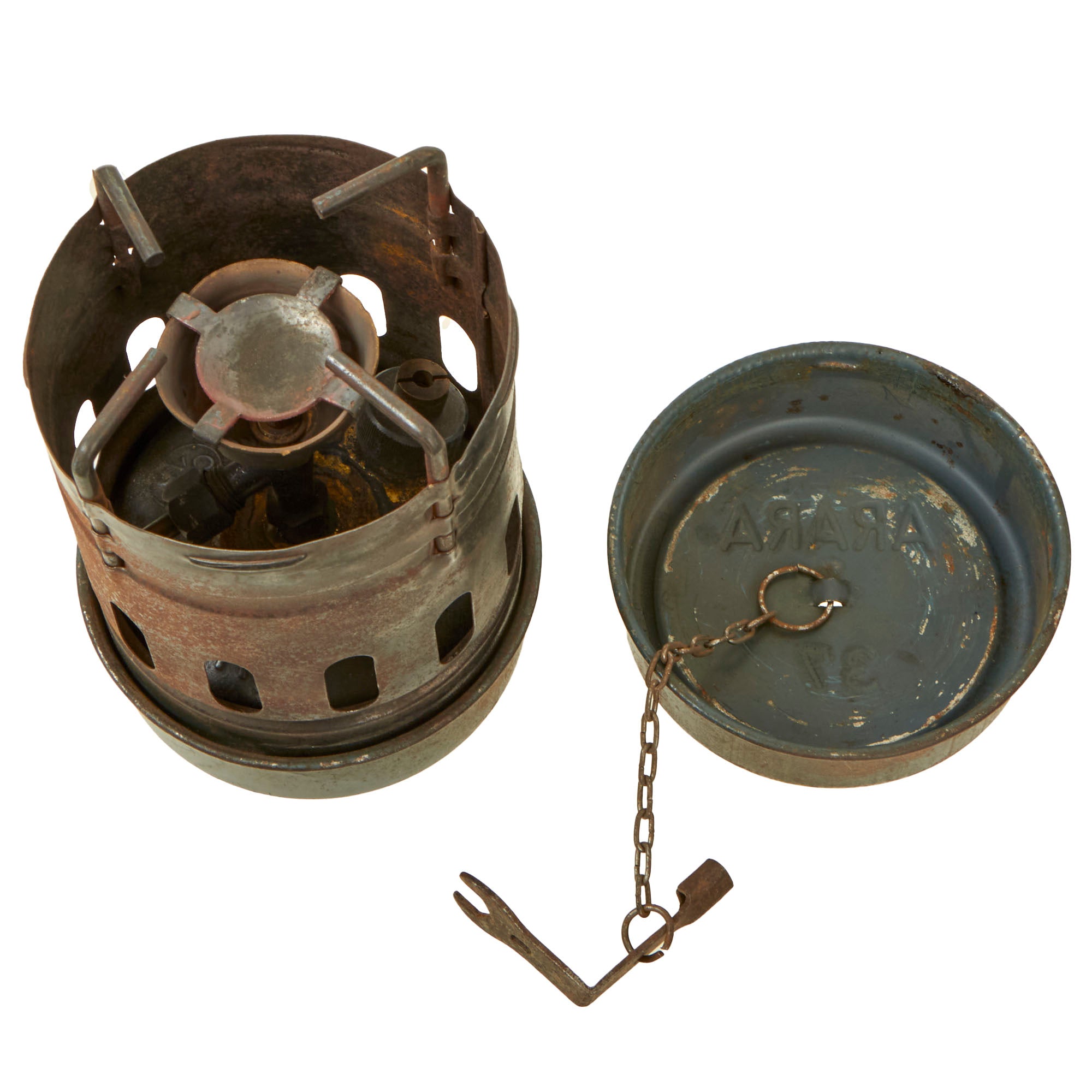 Original Item. Only One Available. This is a scarce piece of German equipment, the FIRST we have ever offered, a scarce ARARA Field Stove, tooled steel construction. The base of the stove itself is marked "Nur für Benzin" (Only for gasoline).