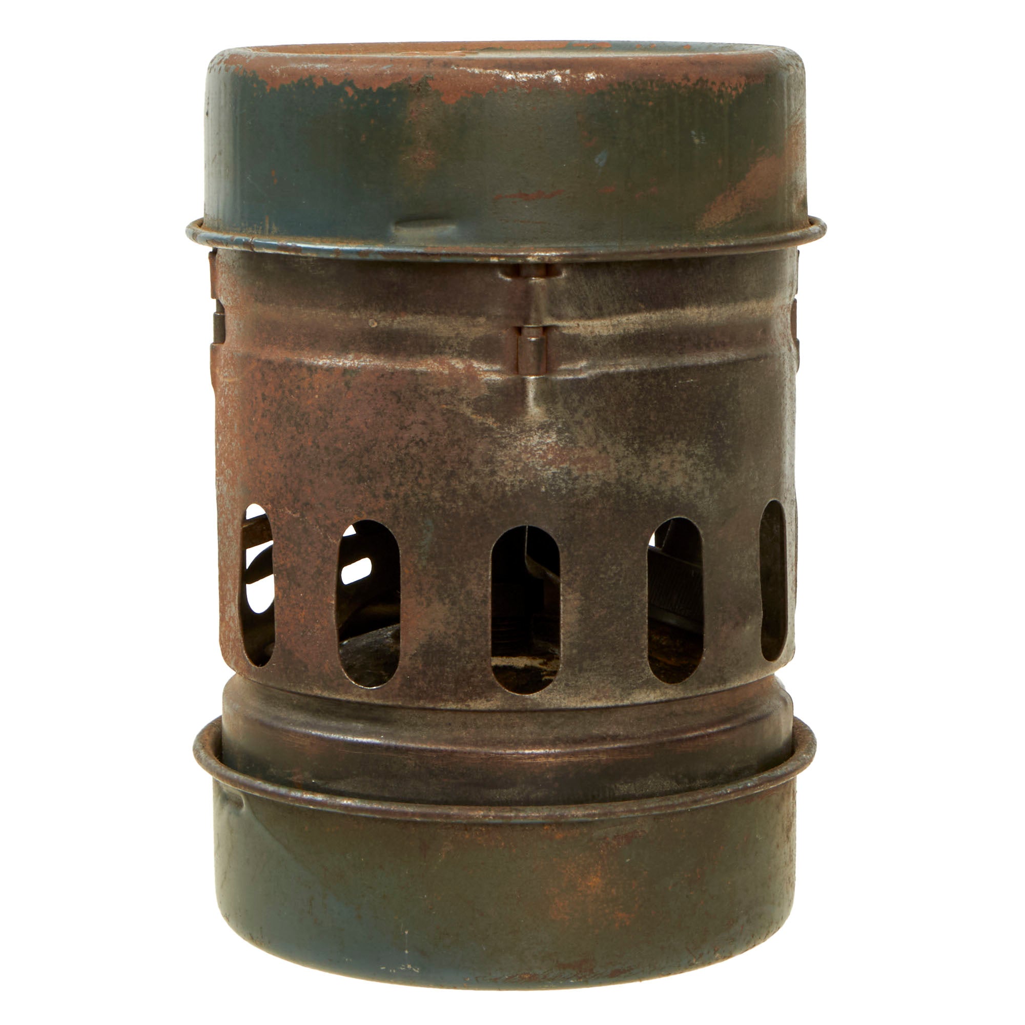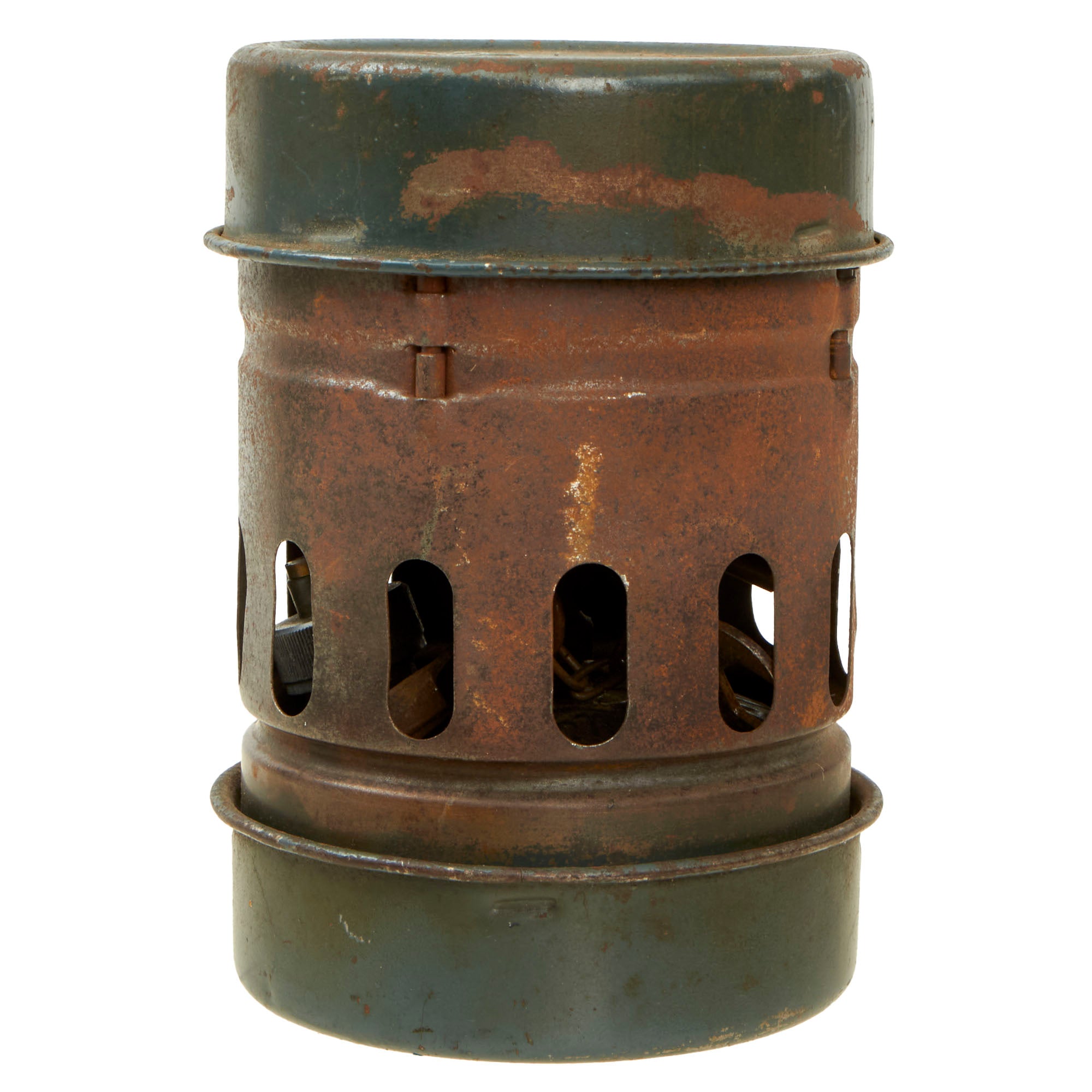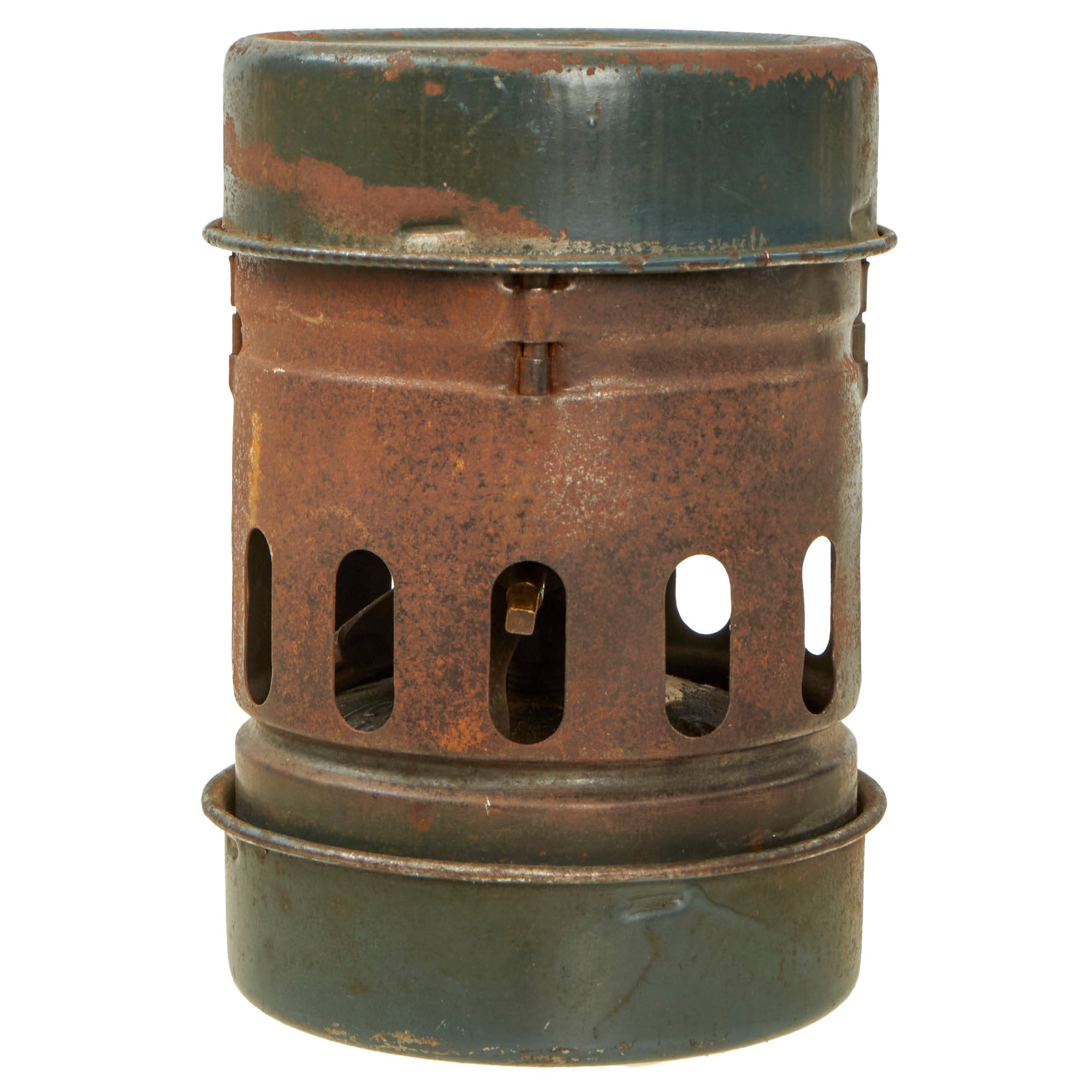 The stove measures roughly 5½” tall with a 3½” diameter. The original tool wrench is chained to the top lid. The paint of the stove is mostly retained with some oxidation as shown. The 37 is likely the date, 1937. It’s also marked CTR 15, likely a maker’s mark. This is a well-used example perfect for any German WWII Collection.
